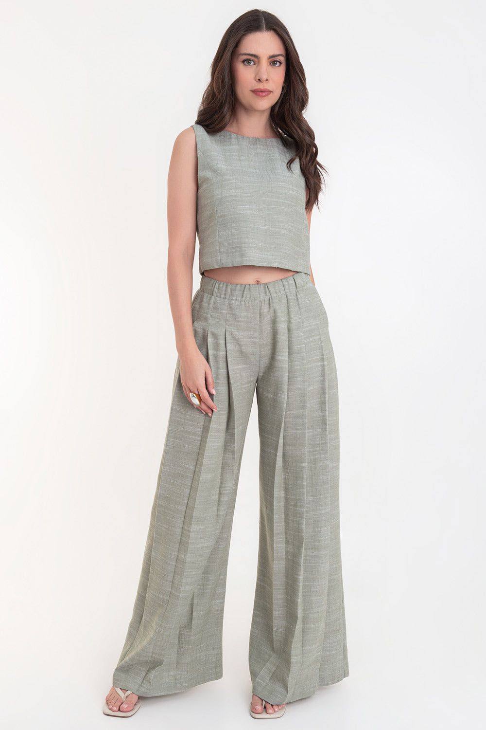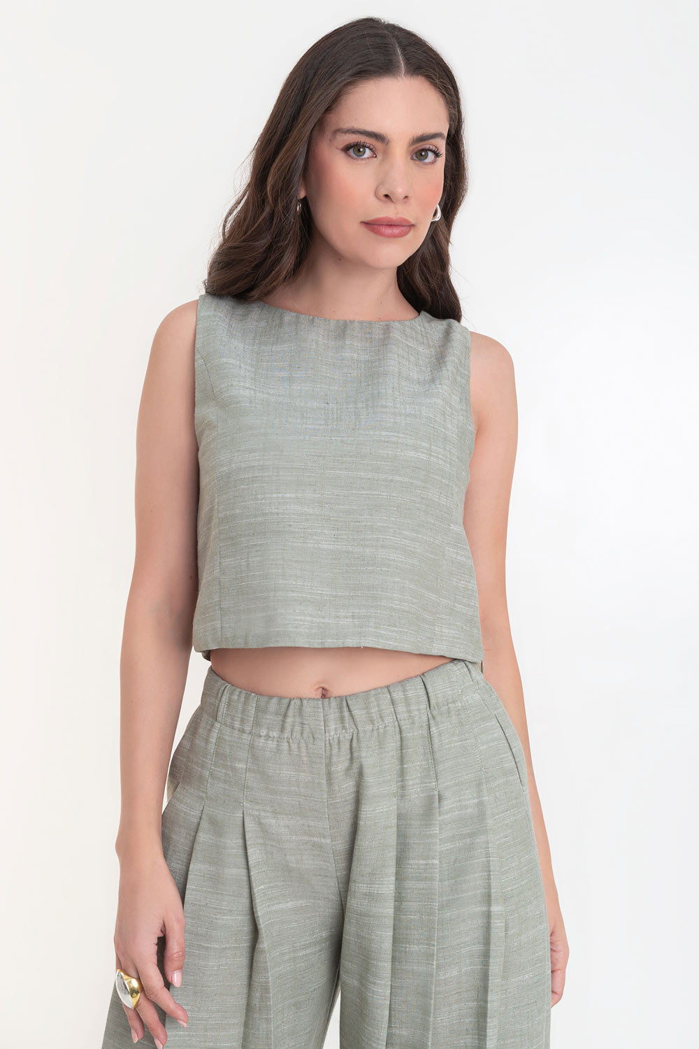 Blusa corta de fit recto, cuello redondo, sin mangas, pinzas frontales y cierre lateral con cremallera oculta.