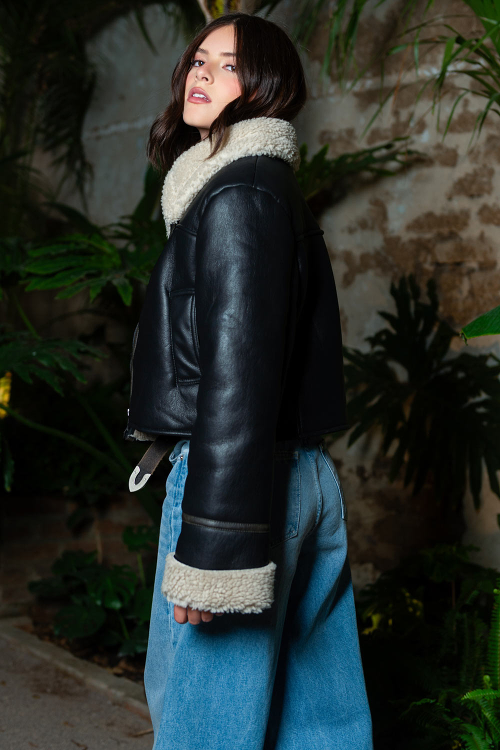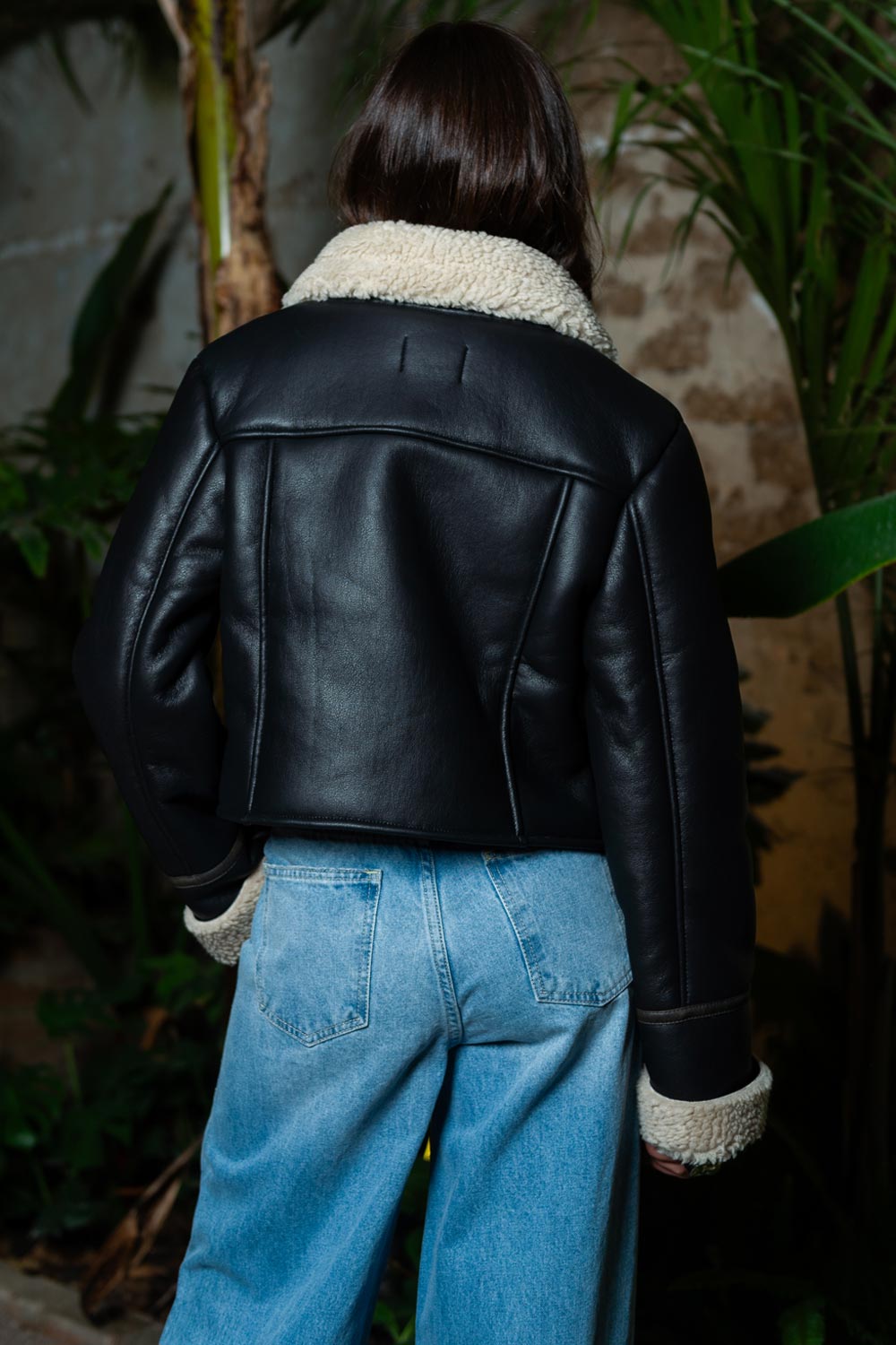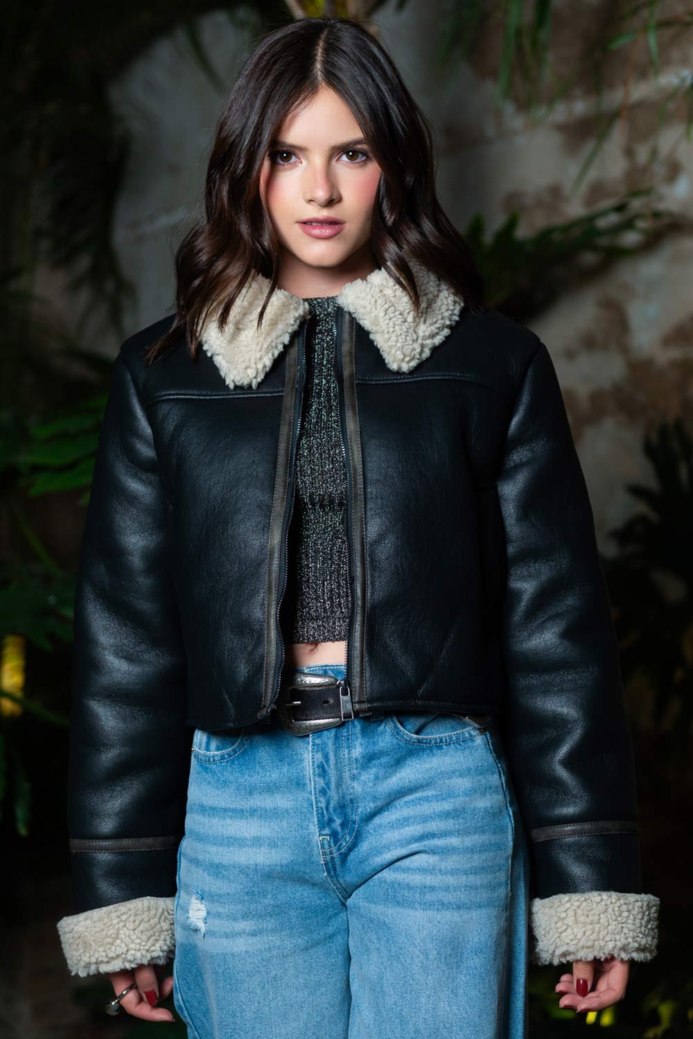 Chamarra corta de efecto piel, interior de borreguillo en contraste, cuello solapa en contraste, bolsillos frontales con vivos, fit recto, detalle de costuras decorativa y cierre frontal con cremallera visible.