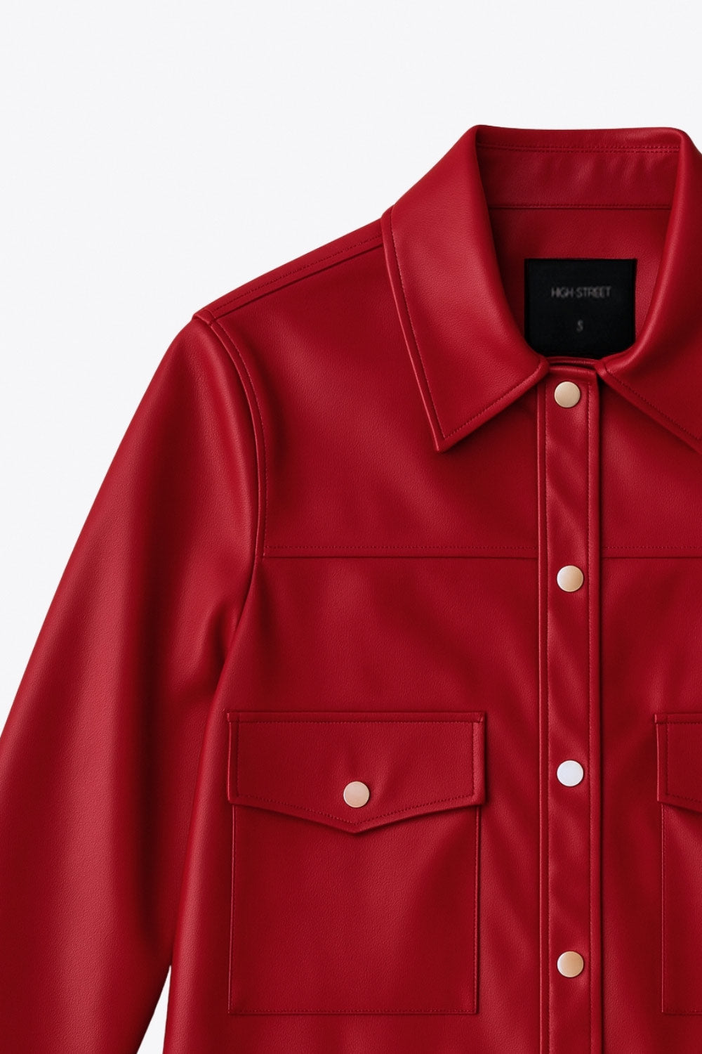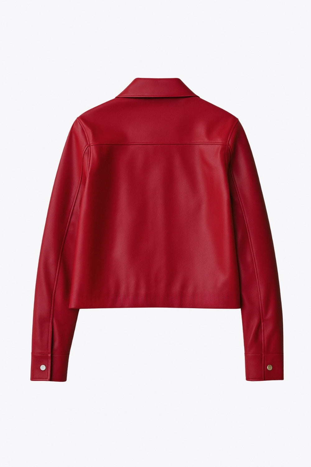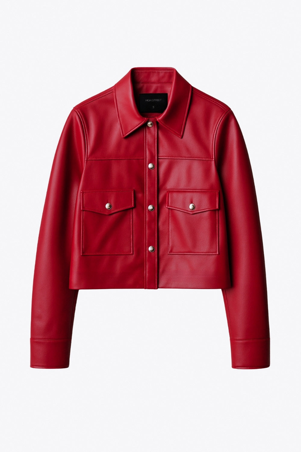 Chamarra corta de efecto piel, fit recto, cuello camisero, manga larga con puño abotonado, bolsillos delanteros de parche con botones y cierre frontal con botones de presión en contraste.