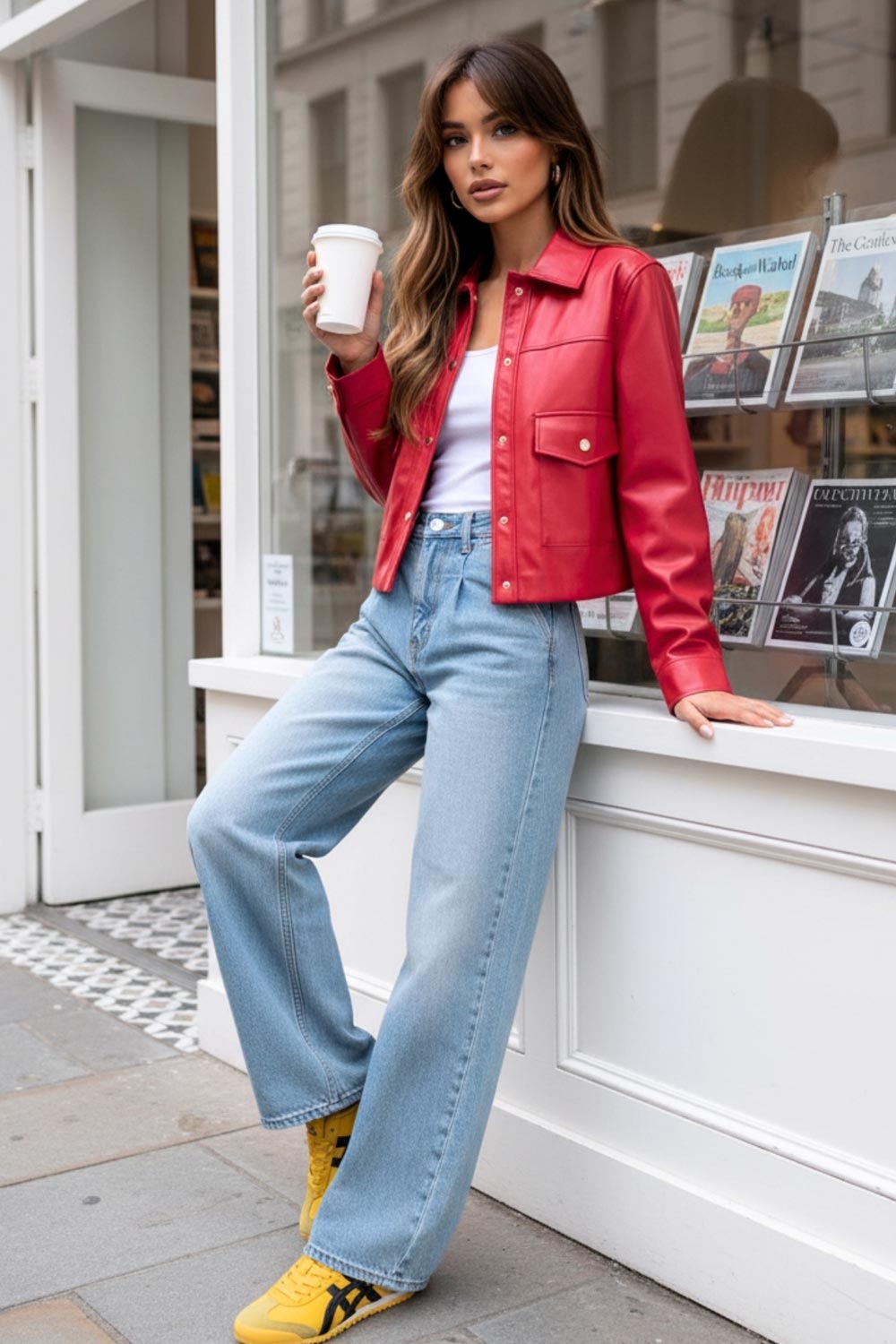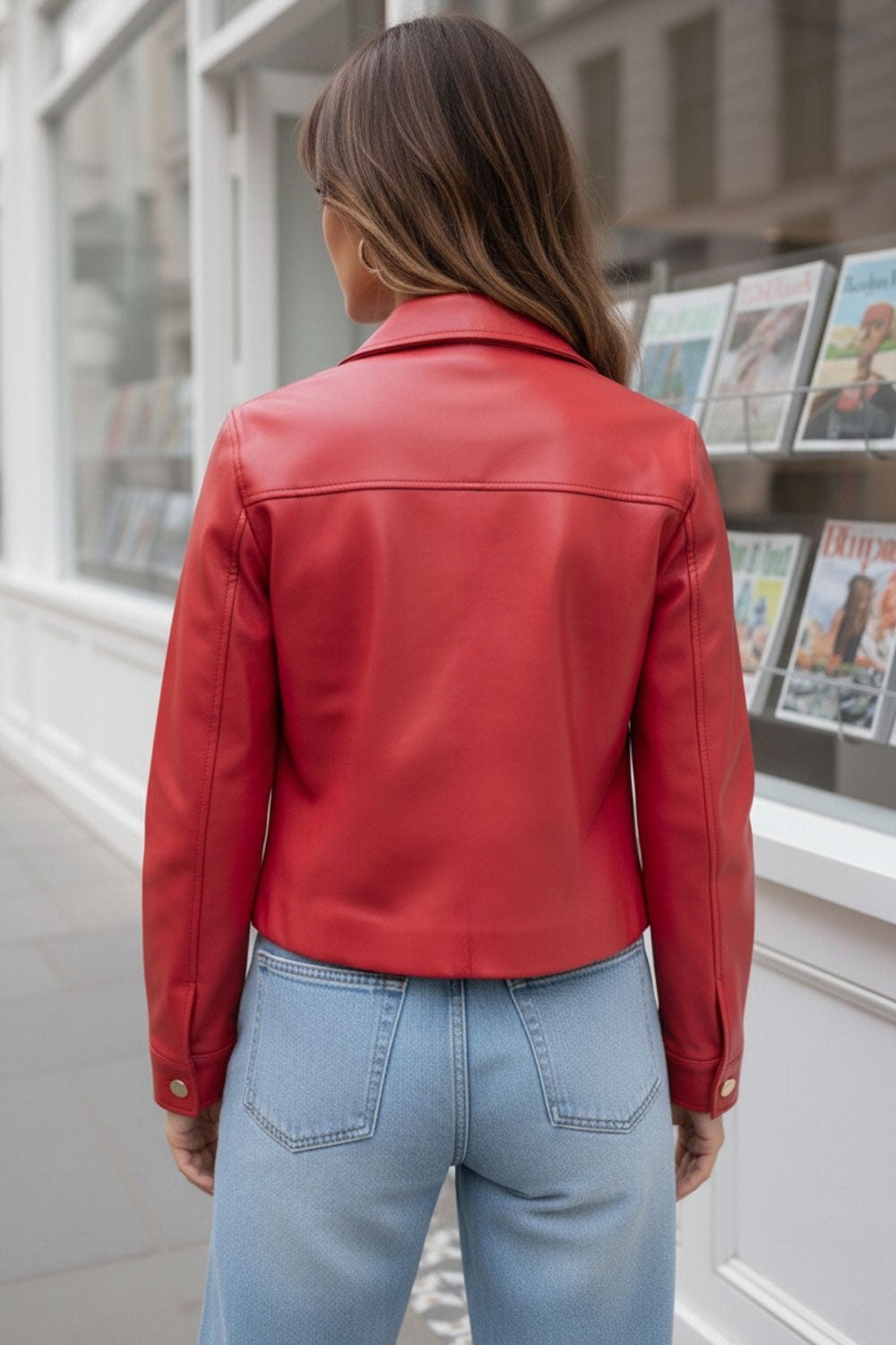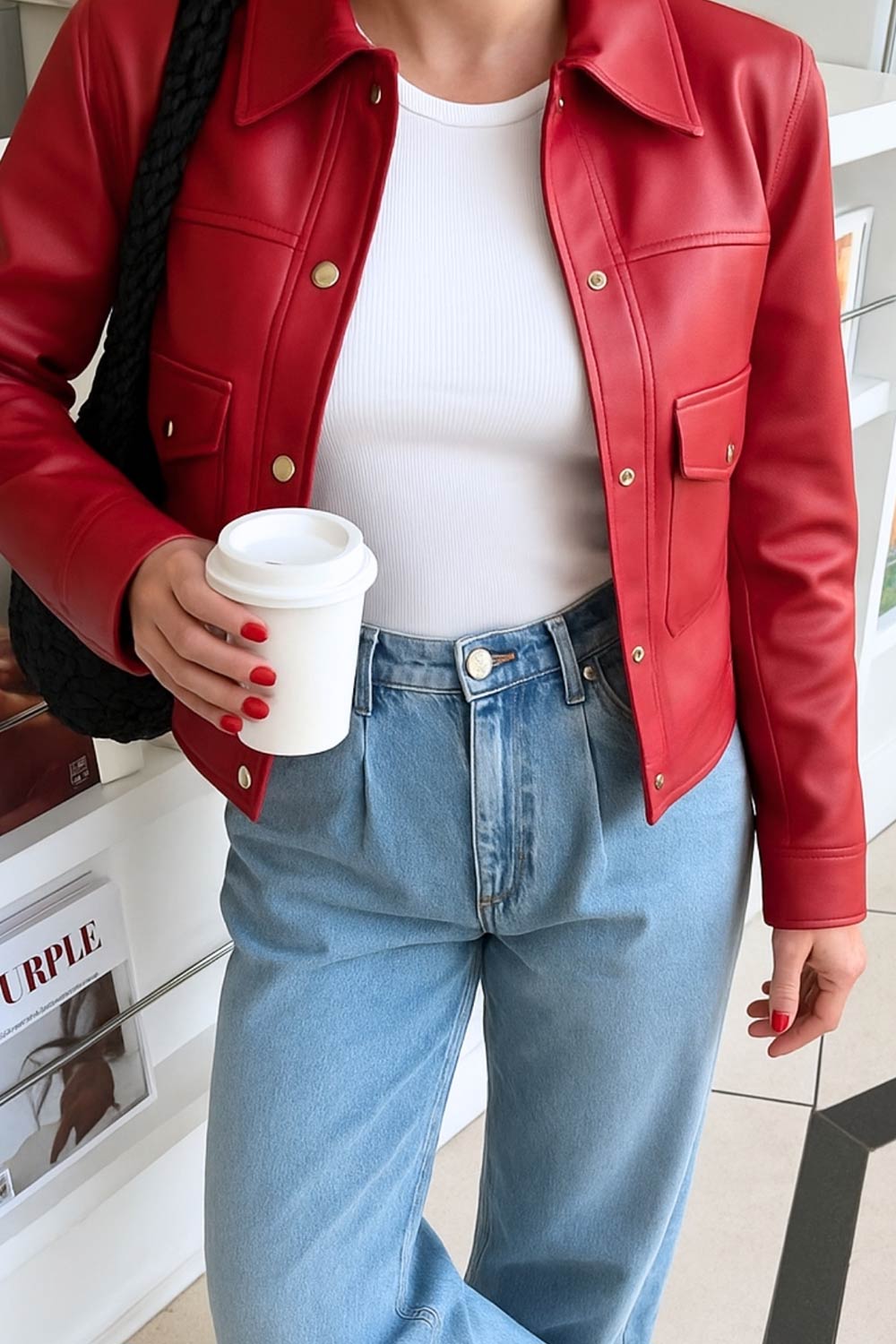 Chamarra corta de efecto piel, fit recto, cuello camisero, manga larga con puño abotonado, bolsillos delanteros de parche con botones y cierre frontal con botones de presión en contraste.