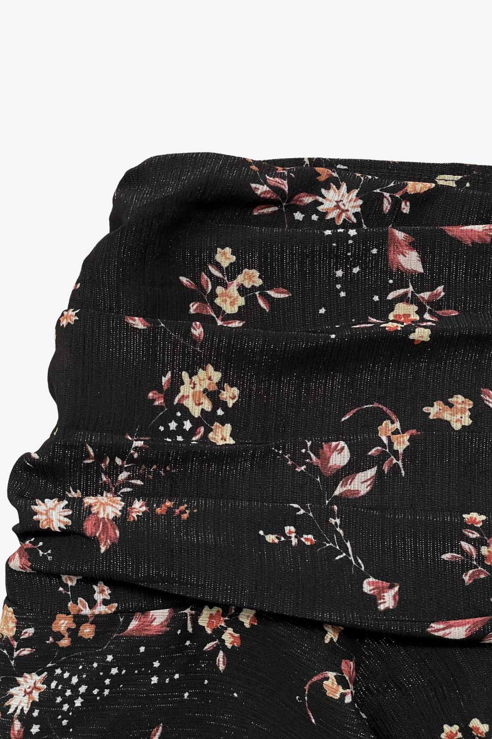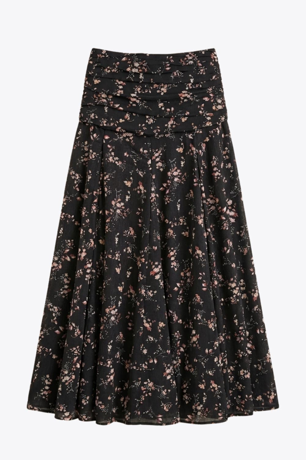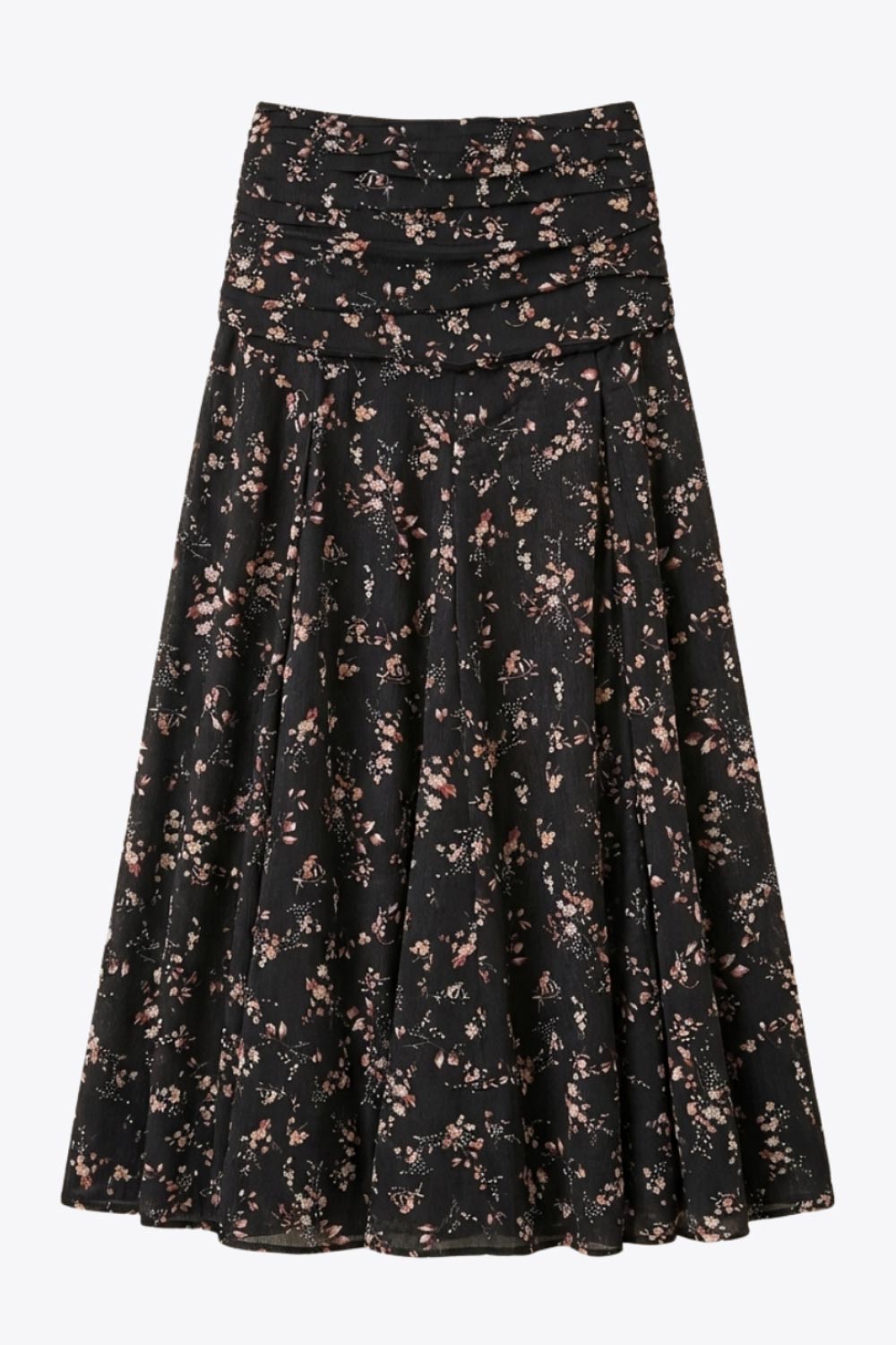 Falda maxi de estampado floral, corte en a, cintura alta con detalle plisados y olanes en bajo. Cierre lateral con cremallera oculta.