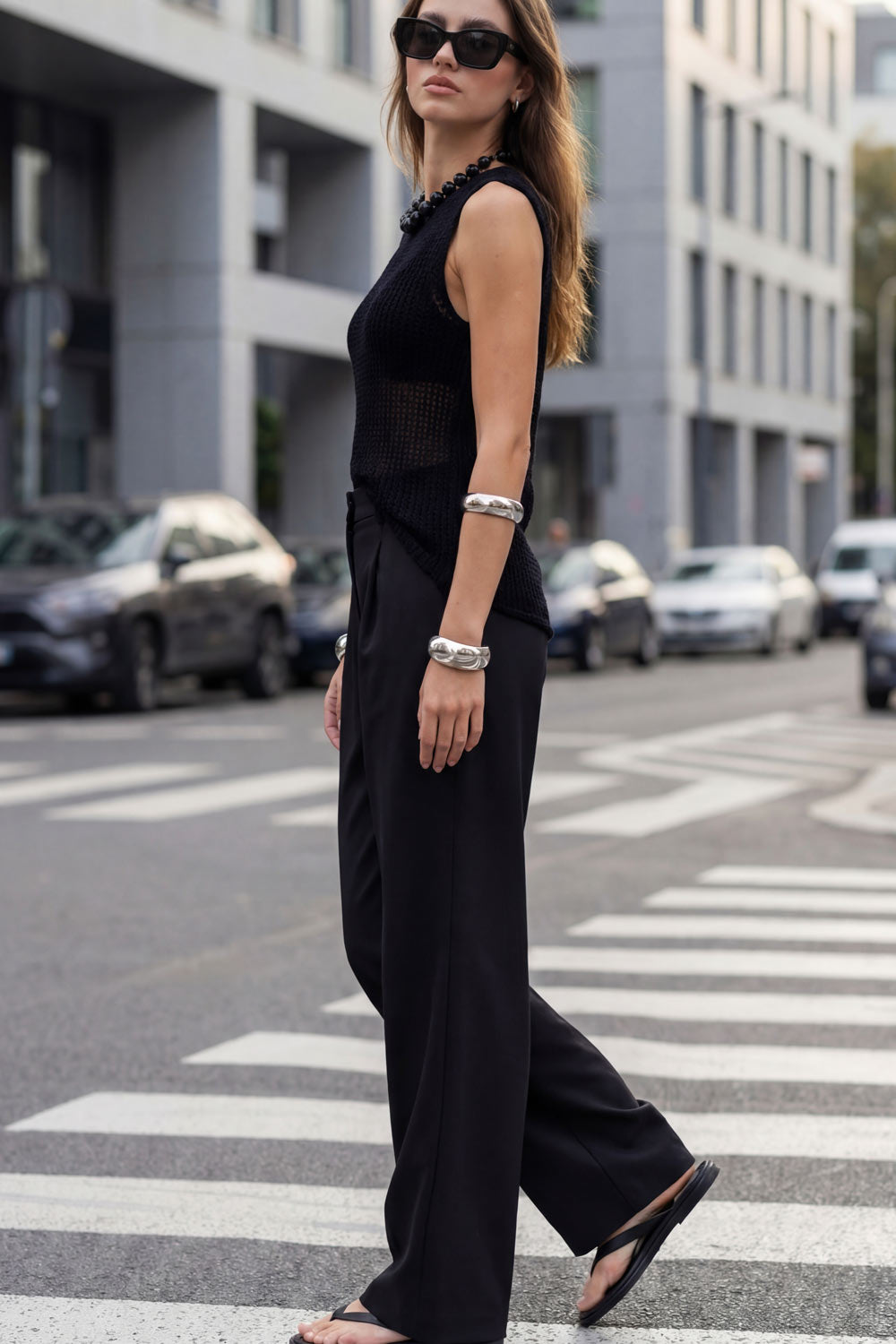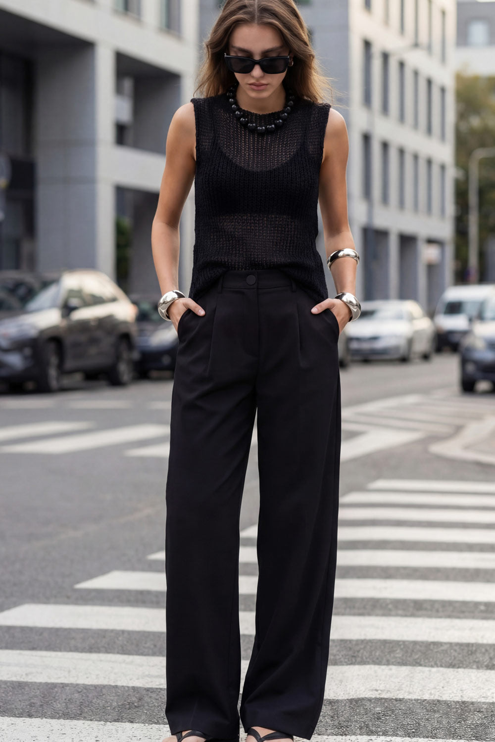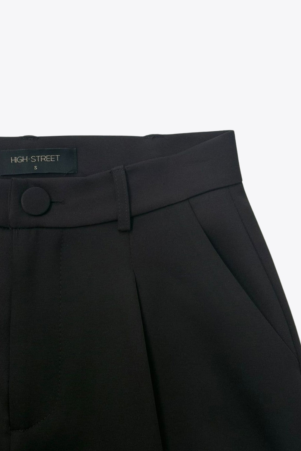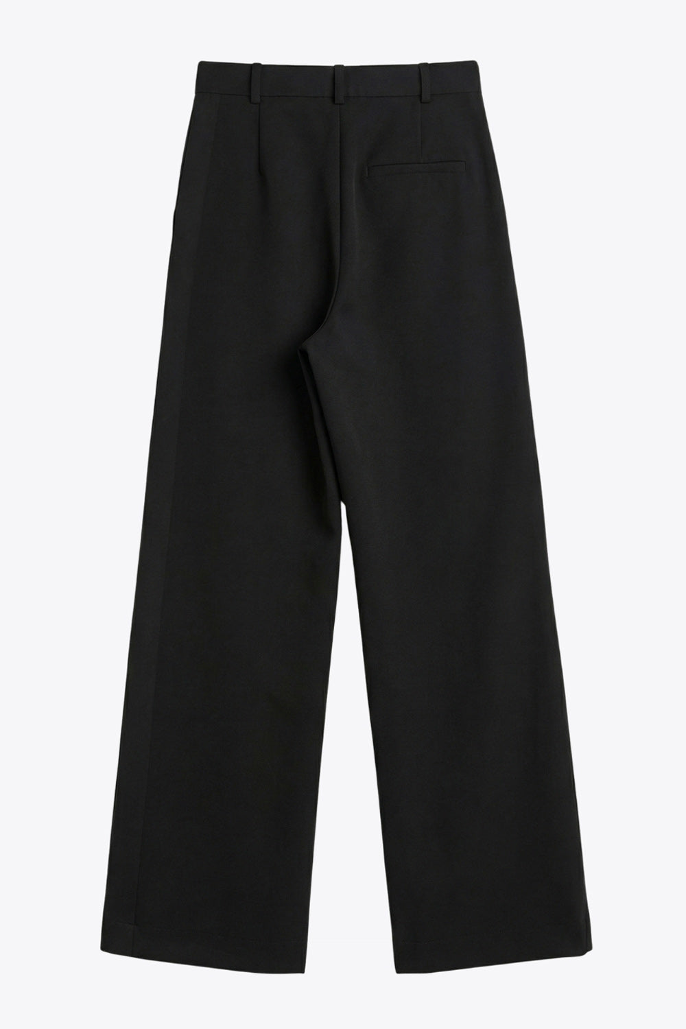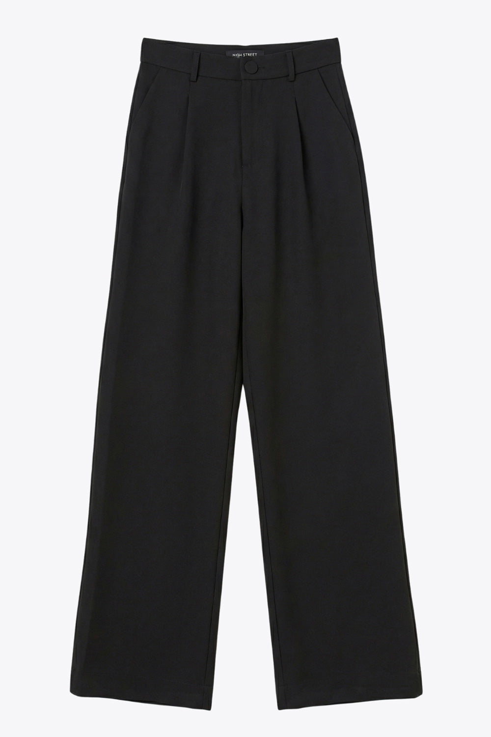 Pantalón de fit wide leg, pinzas frontales, bolsillos delanteros, cintura alta con pretina y trabillas. Detalle de vivo decorativo posterior, cierre con botón y cremallera oculta.