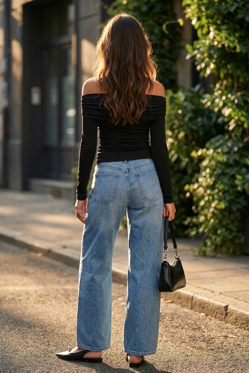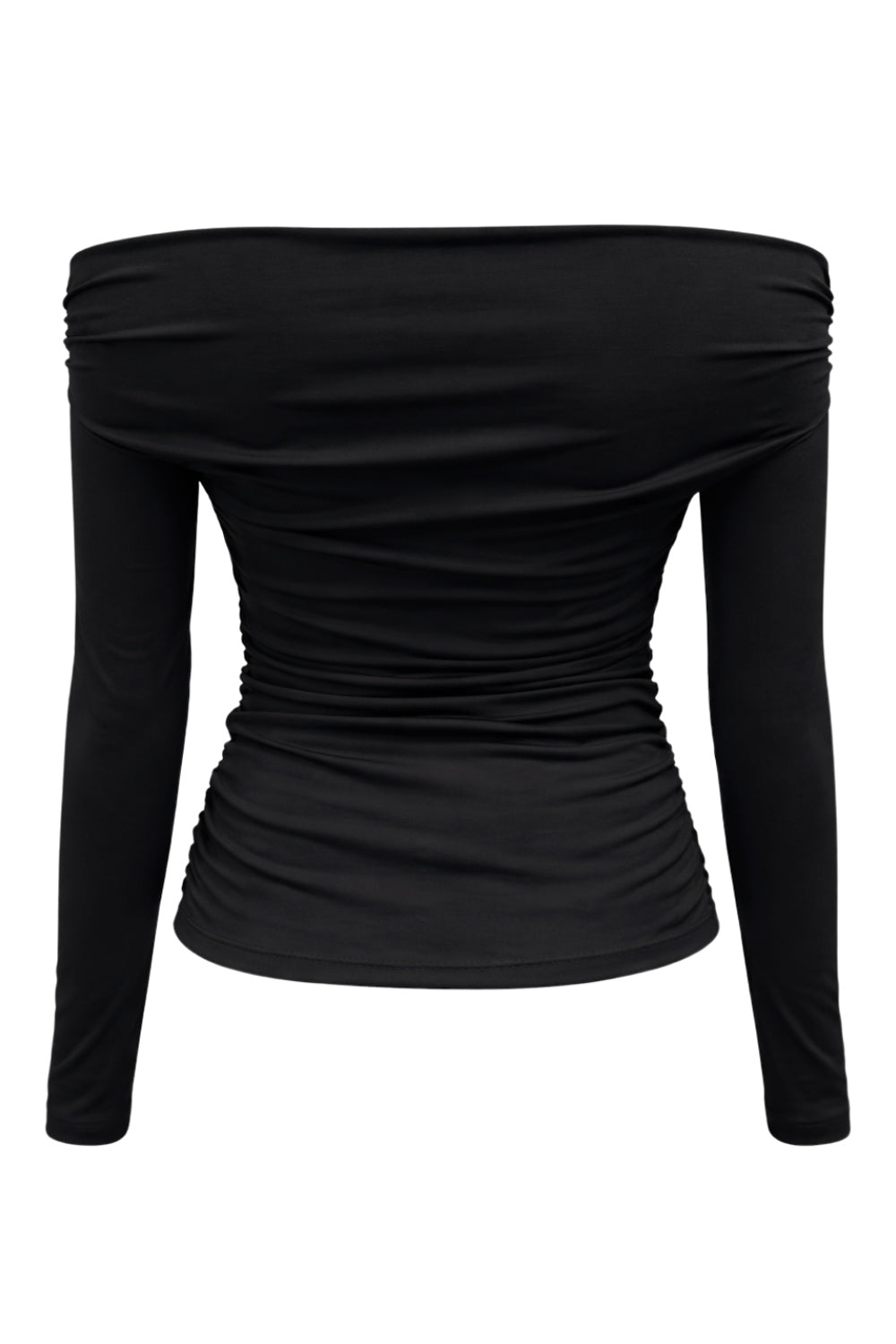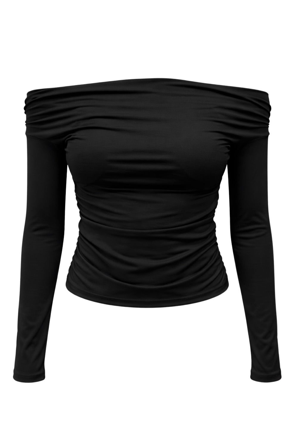 Top de fit ajustado, hombros descubiertos, escote recto y manga larga seguida con plisados laterales. Detalle de plisados en costados.