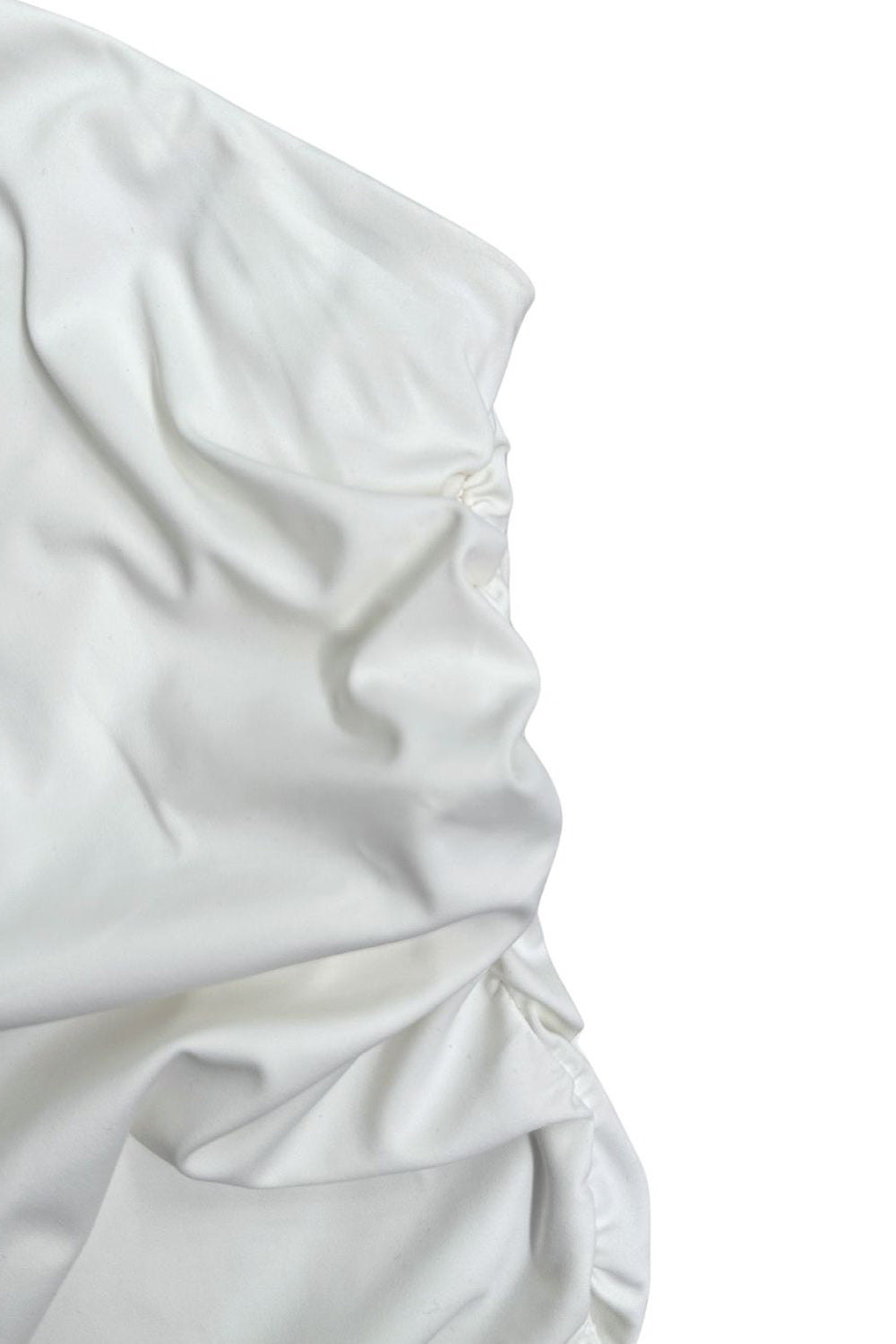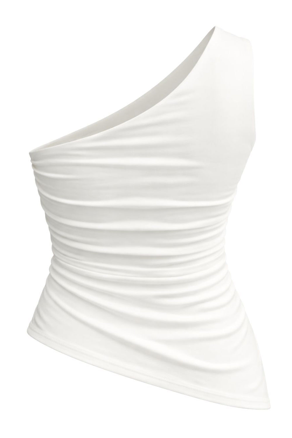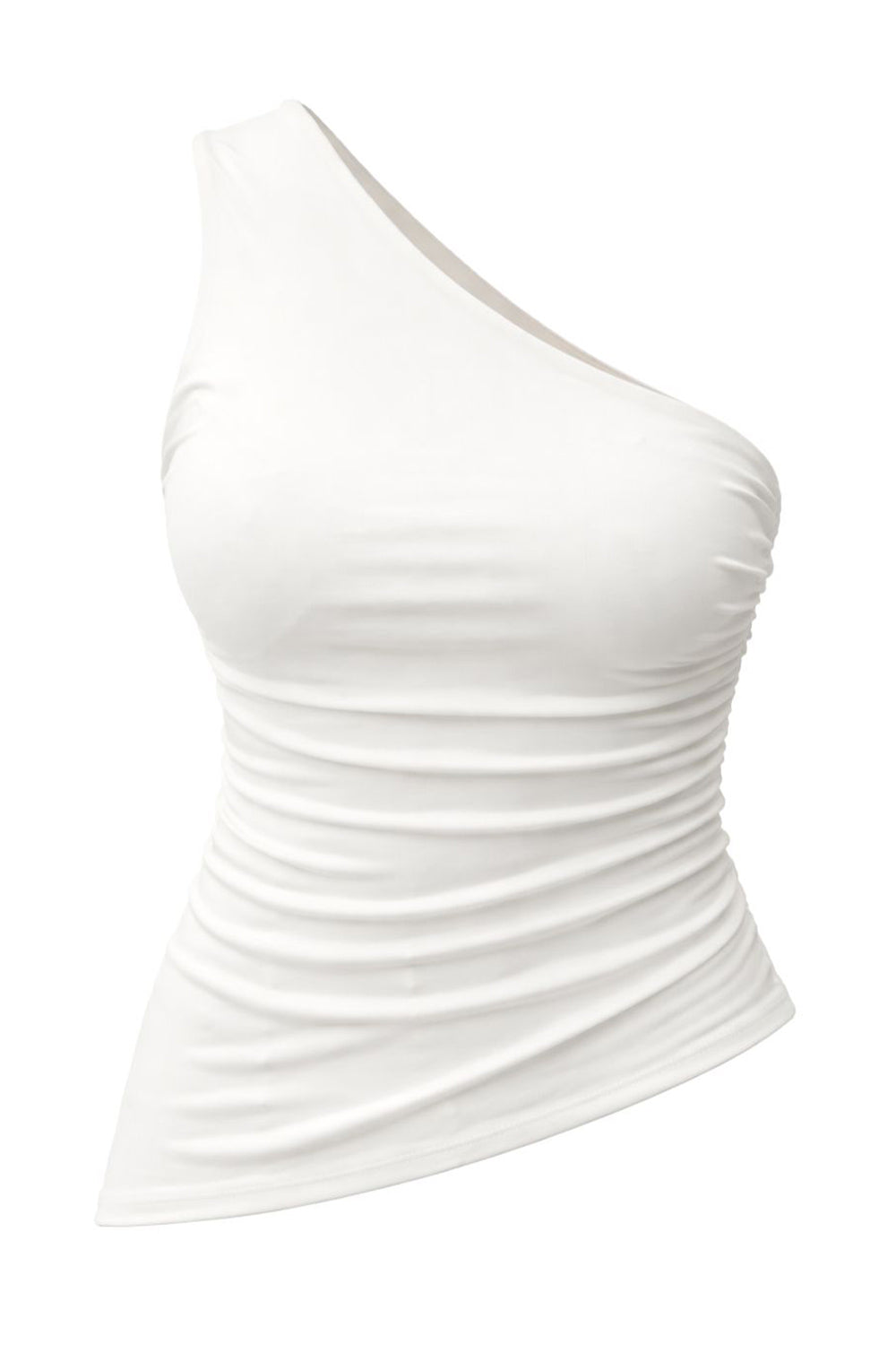 Top asimétrico de fit ajustado, un hombro, escote diagonal, plisados en costado y detalle de bajo asimétrico curveado.