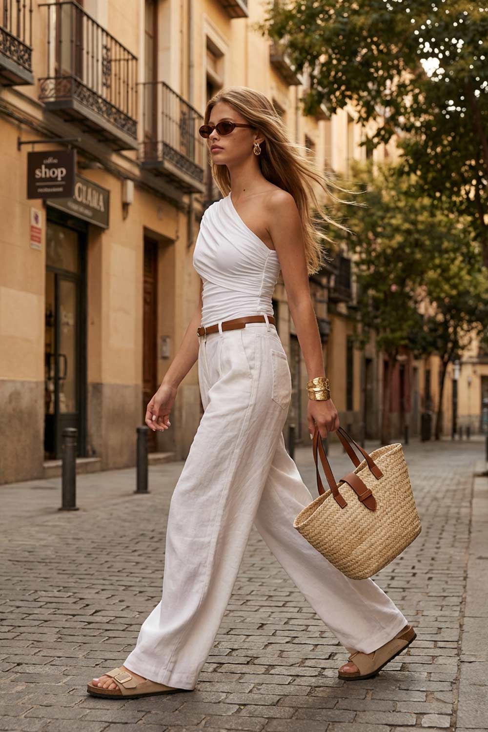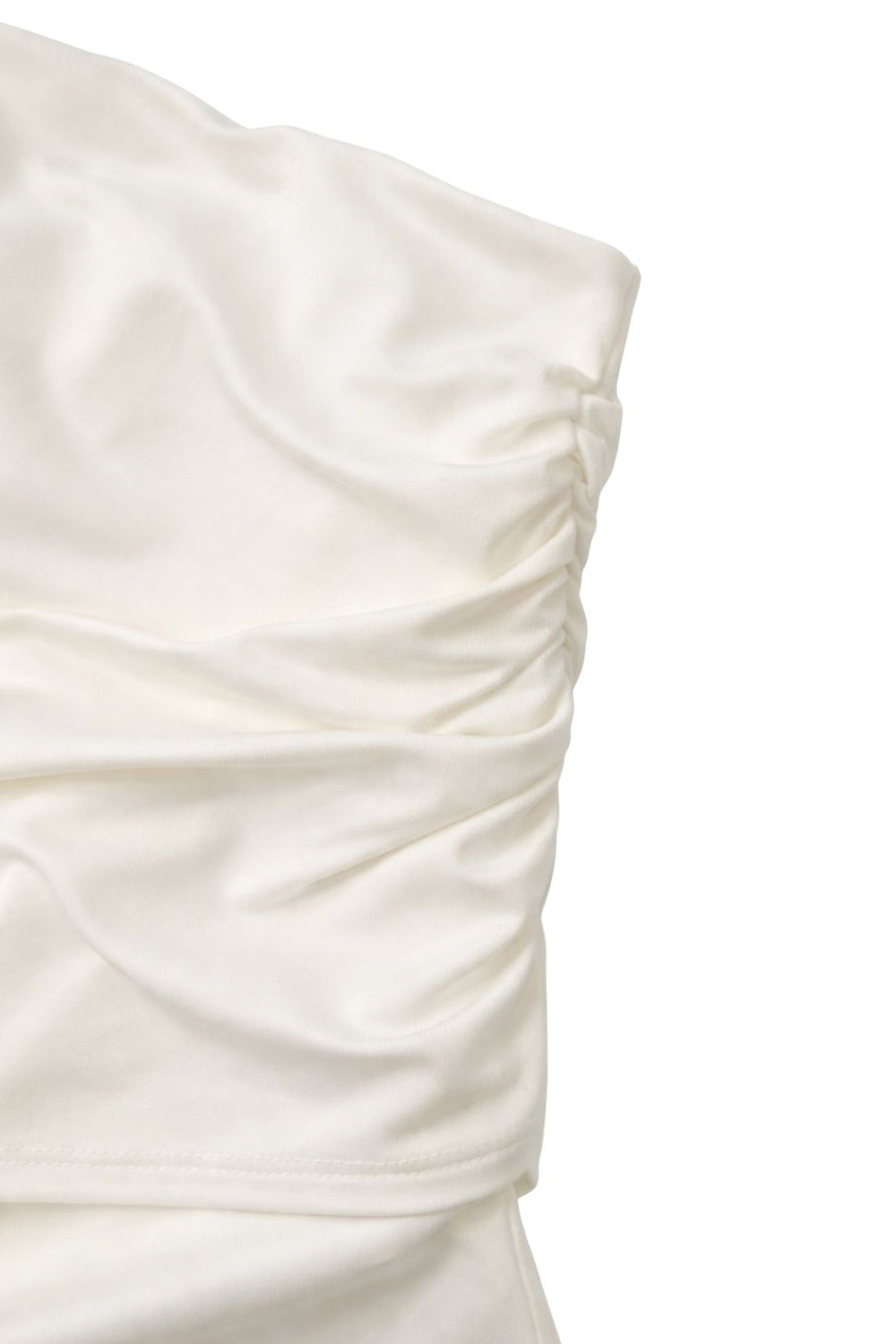 Top asimétrico de fit ajustado, escote diagonal con una manga corta seguida, hombro descubierto, plisados en hombro y costados.