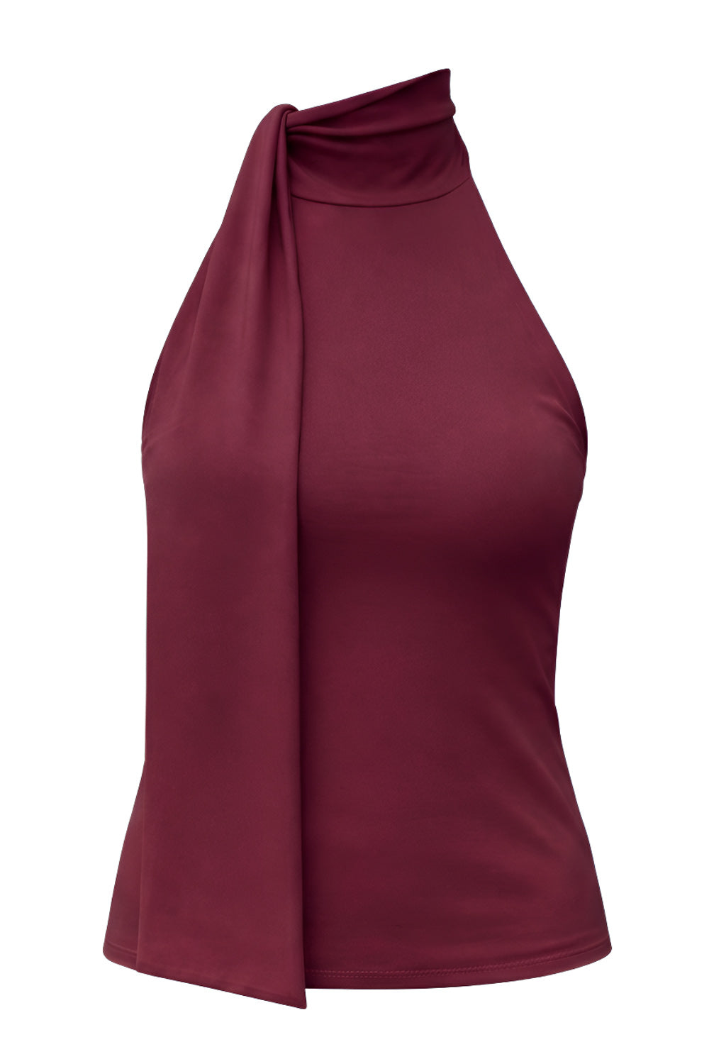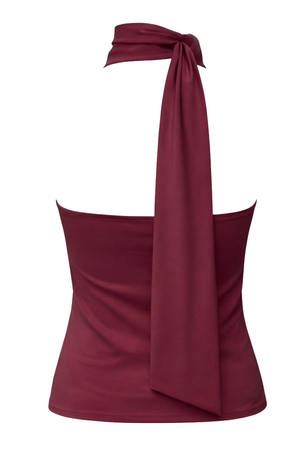 Top de fit ajustado, sin mangas, escote en espalda, cuello halter con plisados y nudo amarrable.