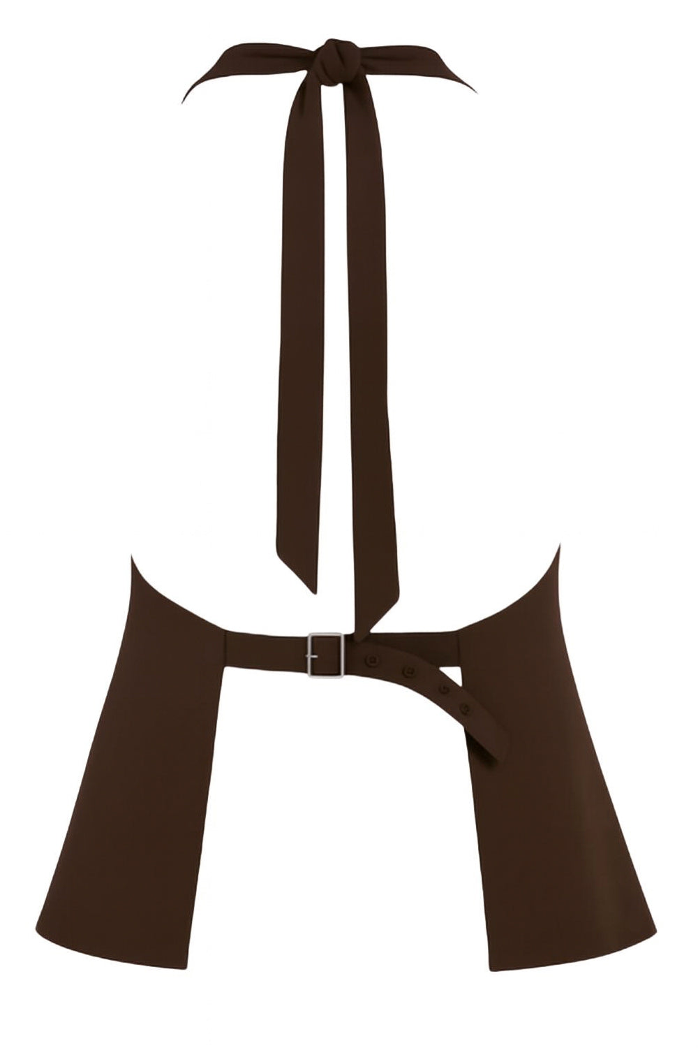 Blusa de fit fluido, cuello halter con nudo amarrable posterior, escote en espalda y cierre posterior con trabilla ajustable.