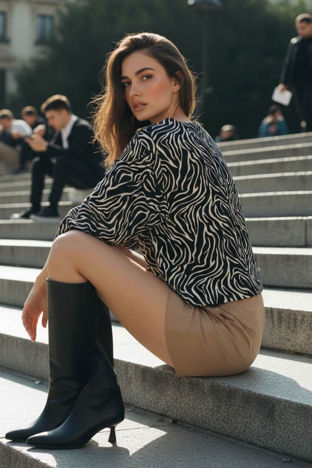 Blusa estampada de fit fluido, manga amplia 3/4, cuello barco y botones decorativos en hombro.