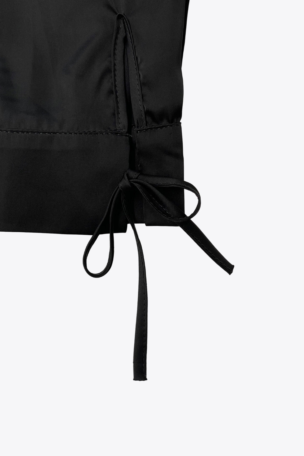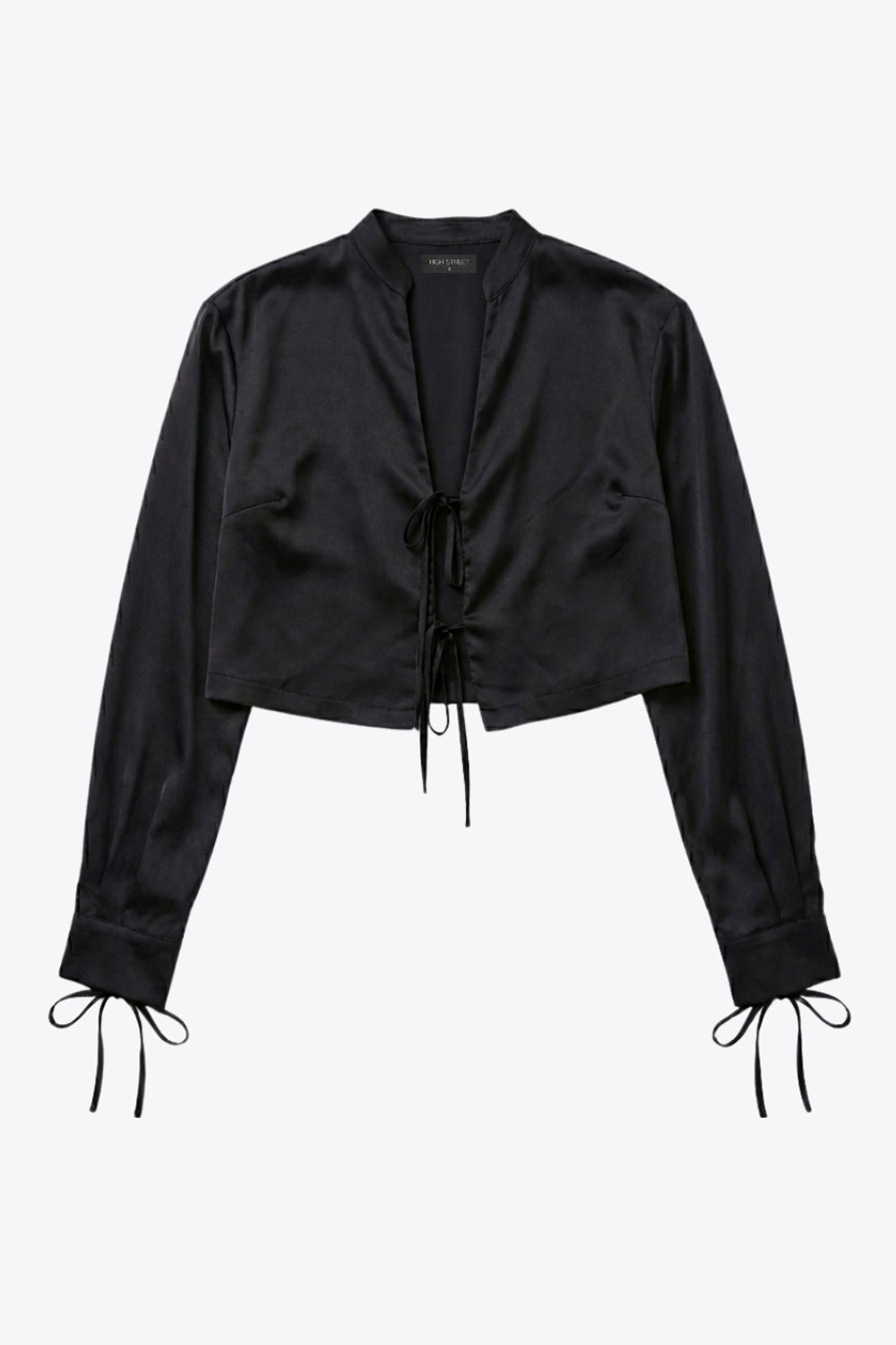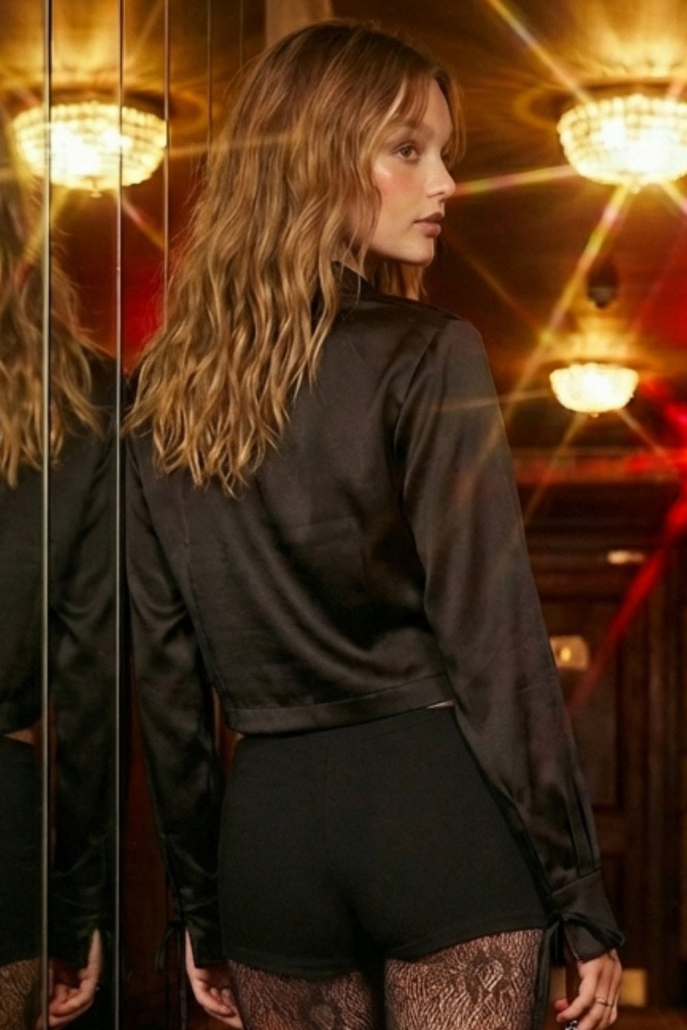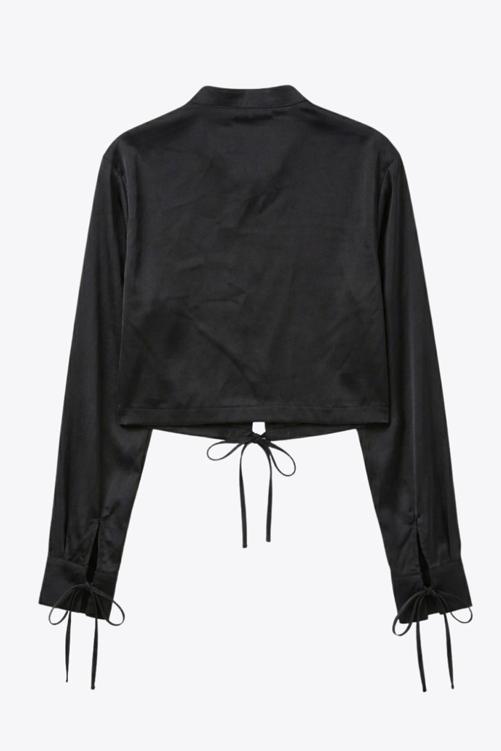 Blusa corta satinada de fit recto, manga larga con lazos en puños y cuello mock. Cierre frontal con lazos amarrables.