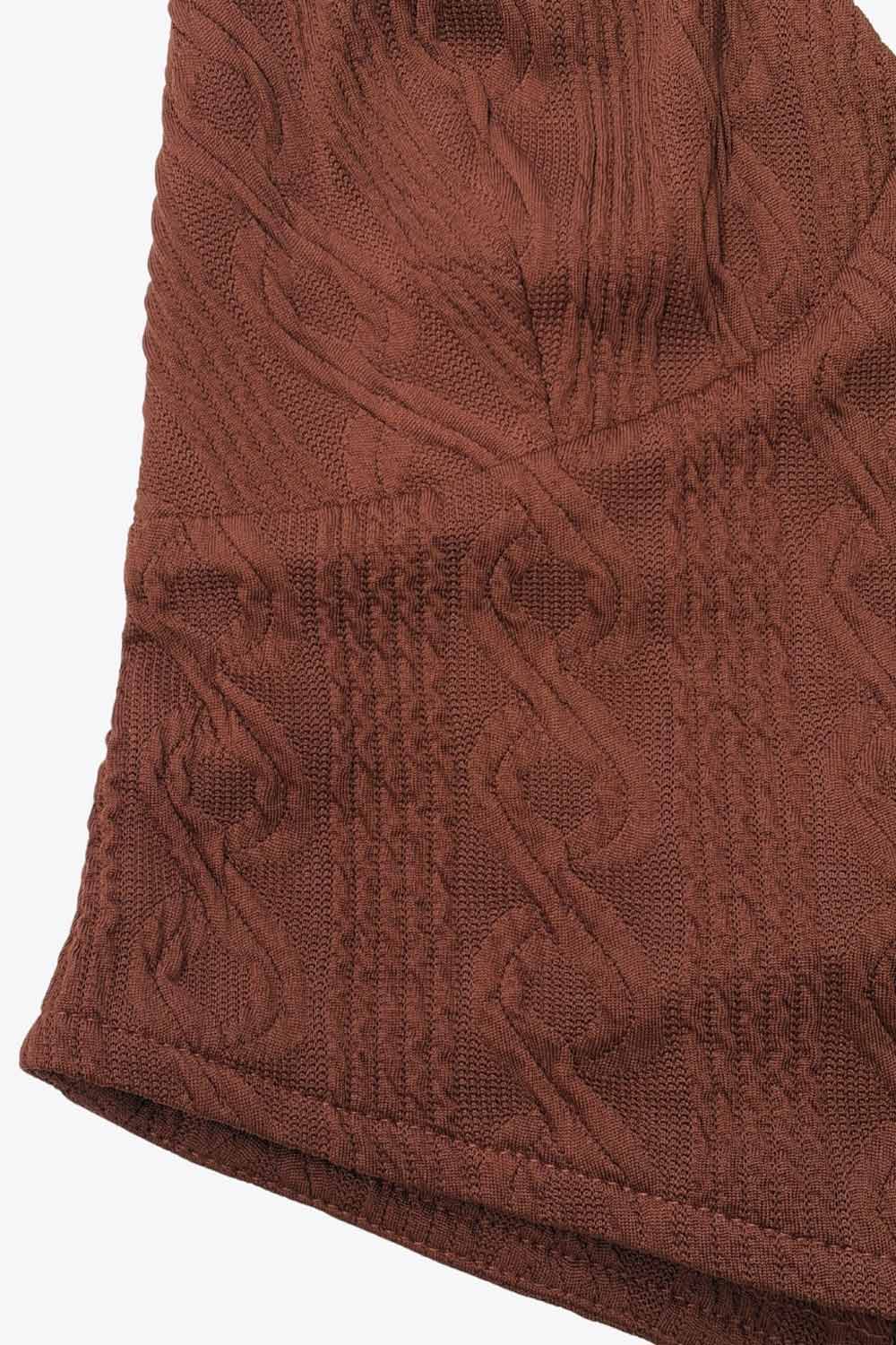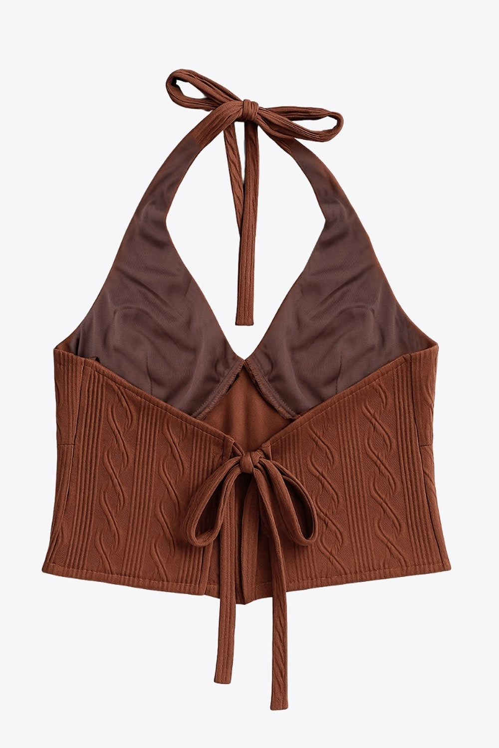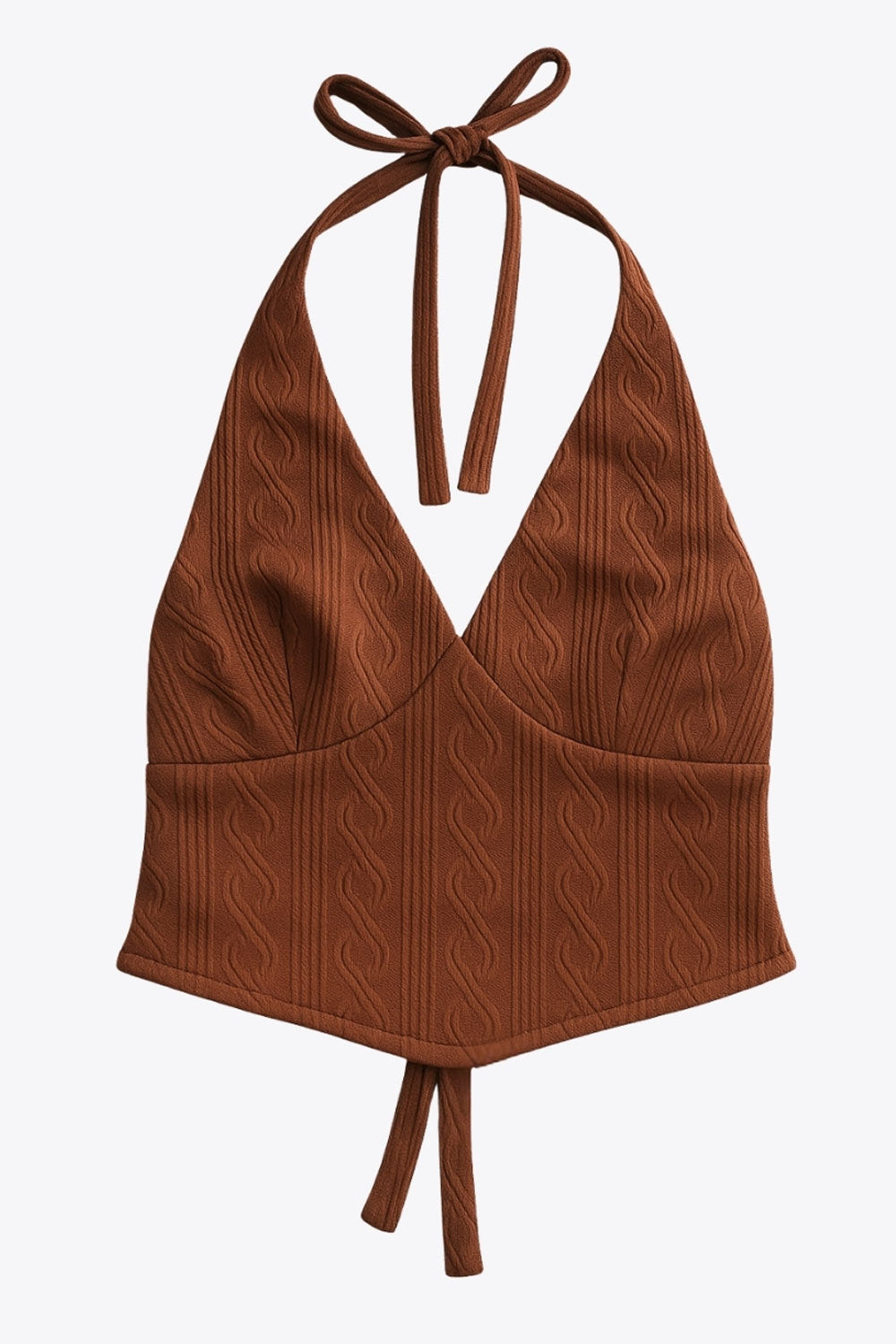 Top corto de cuello halter, lazo amarrable posterior, escote v con cortes frontales, bajo v frontal, escote en espalda y lazo amarrable posterior. Detalle de textura en tejido.