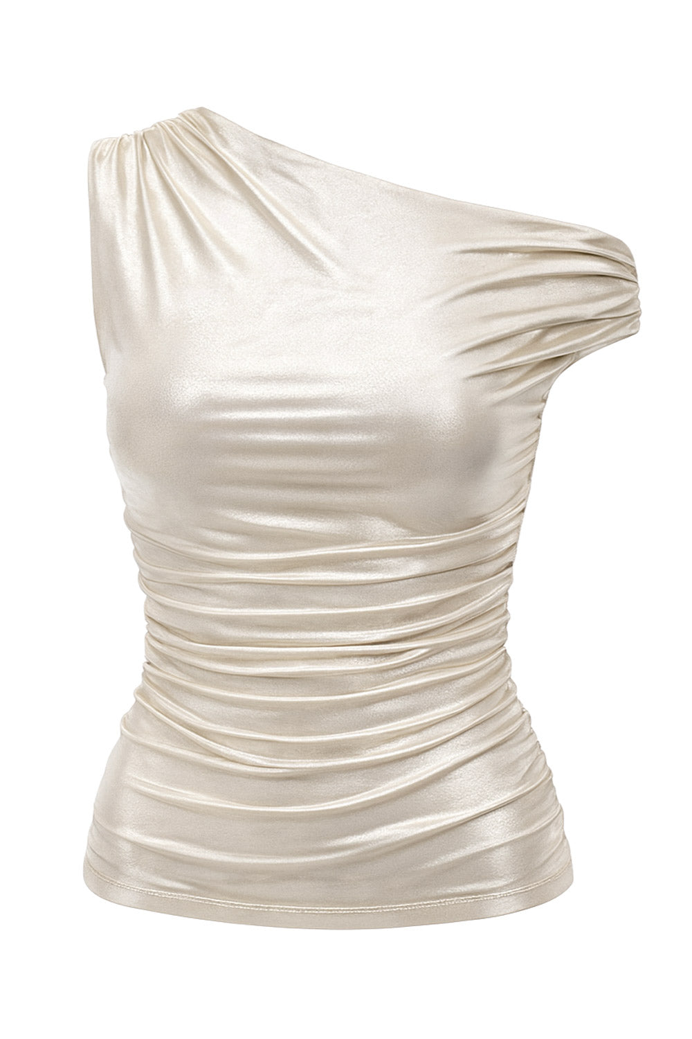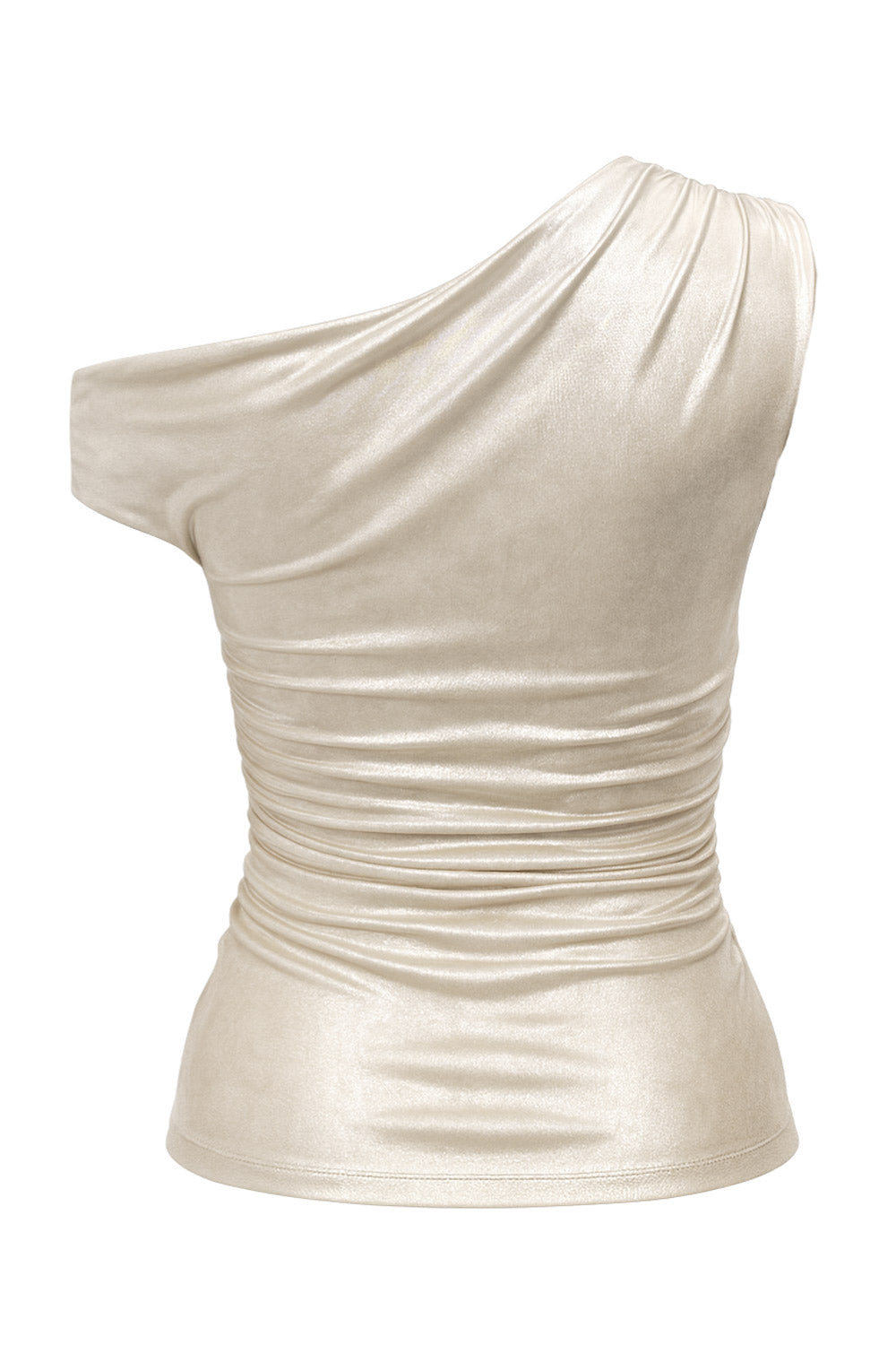 Top metálico asimétrico de fit ajustado, escote diagonal, una manga corta seguida con hombro descubierto, plisados en hombro y detalle de plisados en costados.