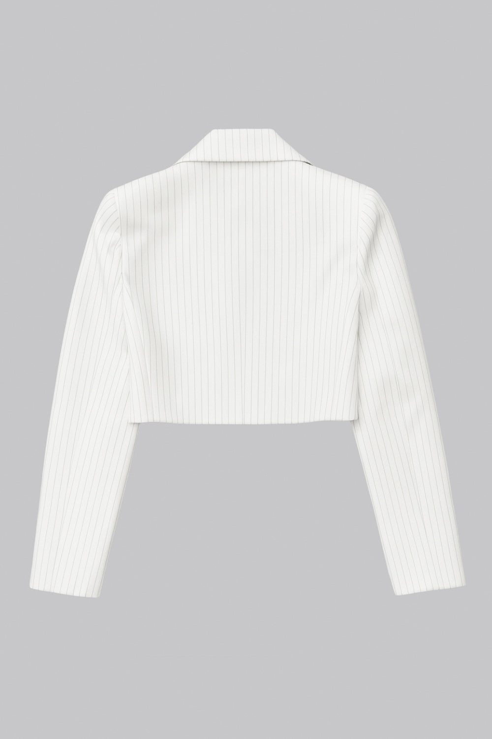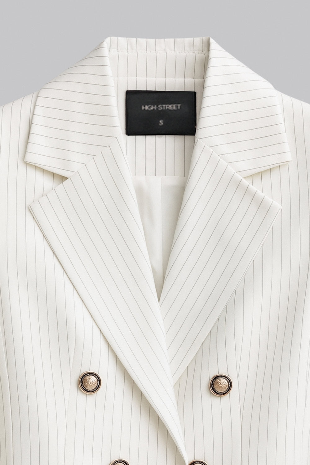 Blazer corto cruzado de fit ajustado, estampado rayas, manga larga, solapa, hombreras y cierre frontal con doble cruce de botones en contraste.