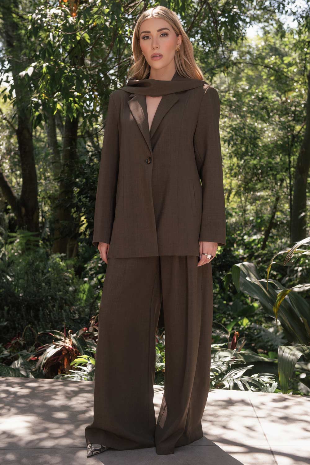 Blazer de fit oversized, con solapa y hombreras, manga larga, bolsillos delanteros con vivos y cierre frontal con botón. Detalle decorativo en cuello.