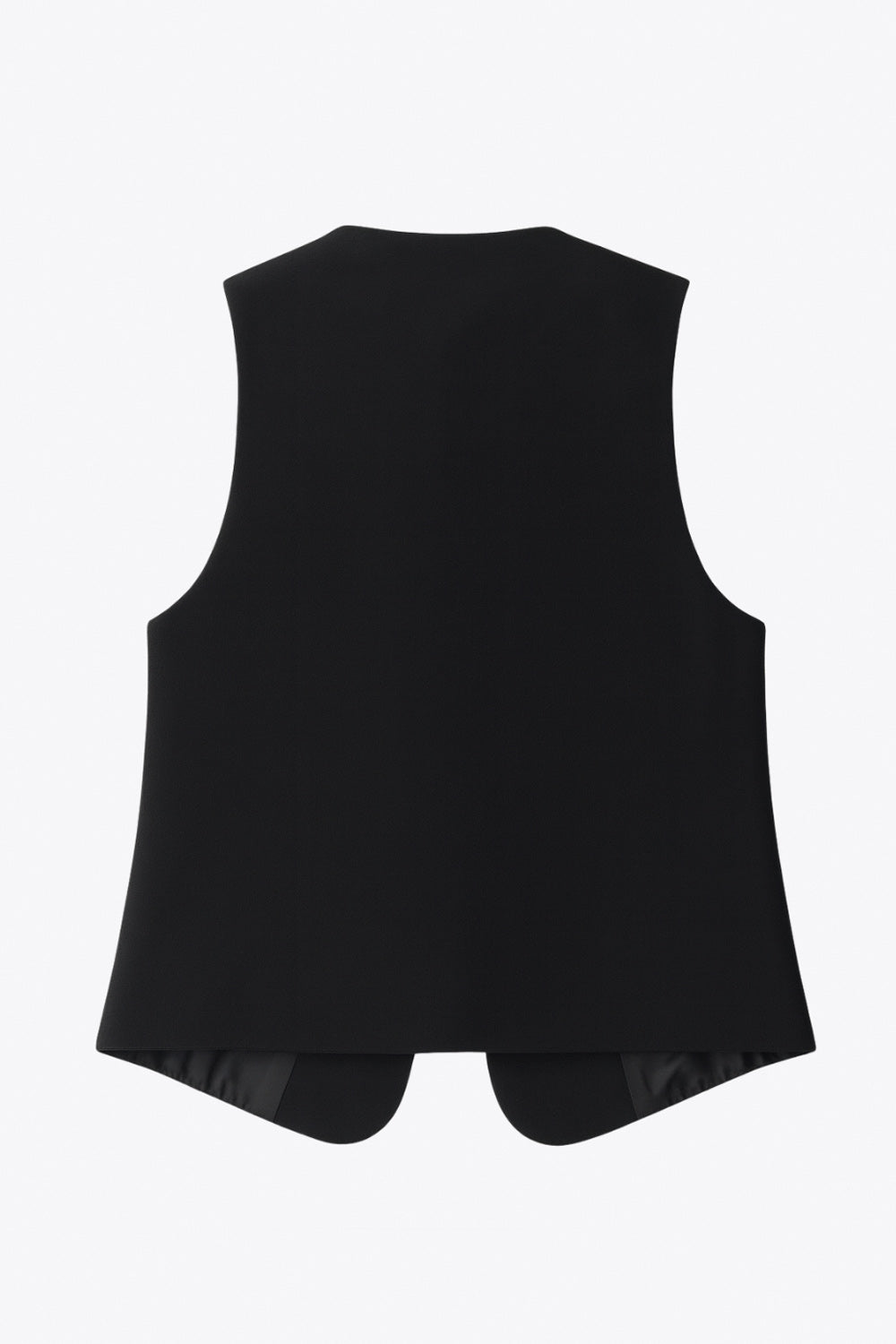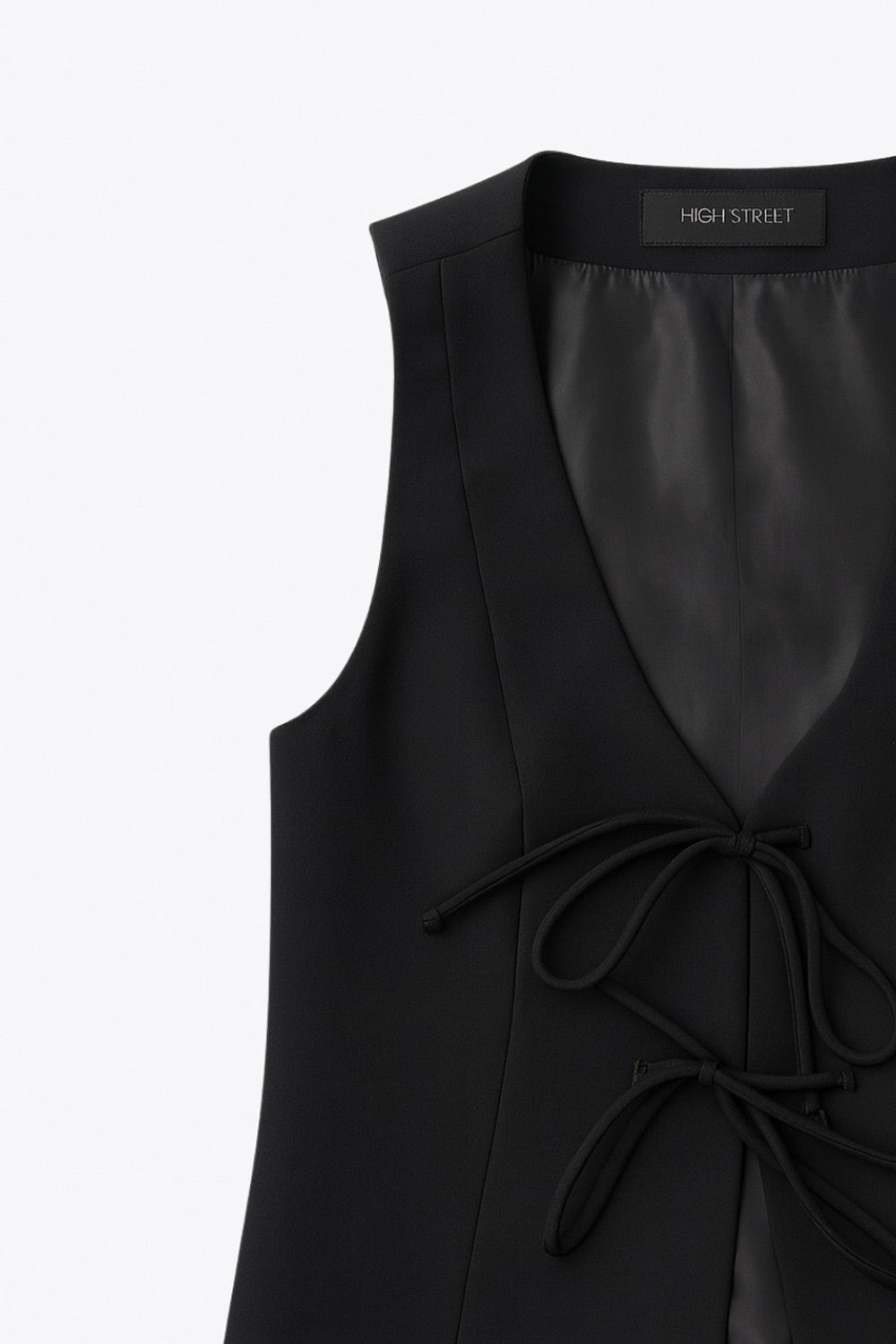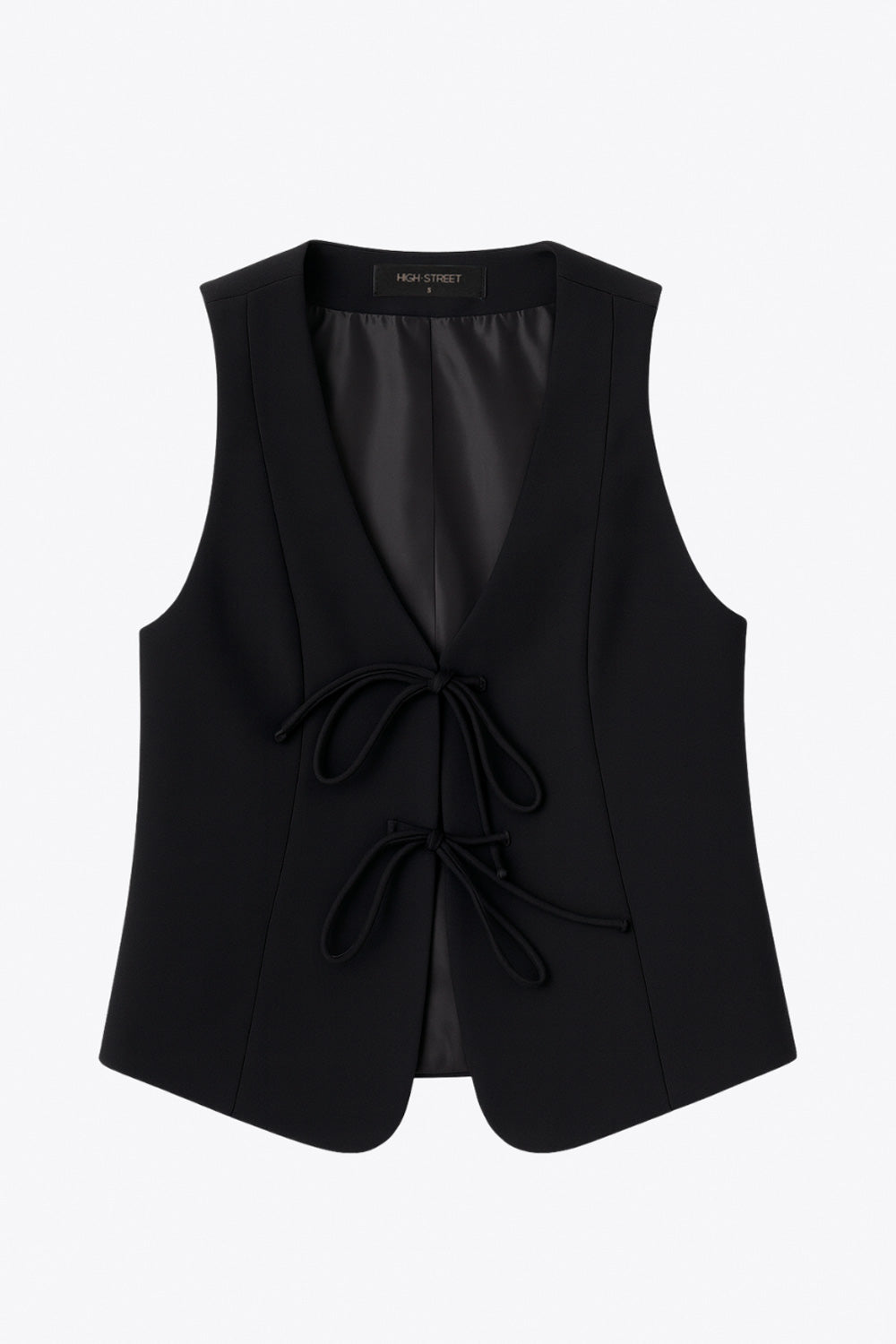 Chaleco de fit recto, cortes frontales, escote v redondeado y cierre frontal con lazos amarrables. Detalle de bajo curveado frontal.