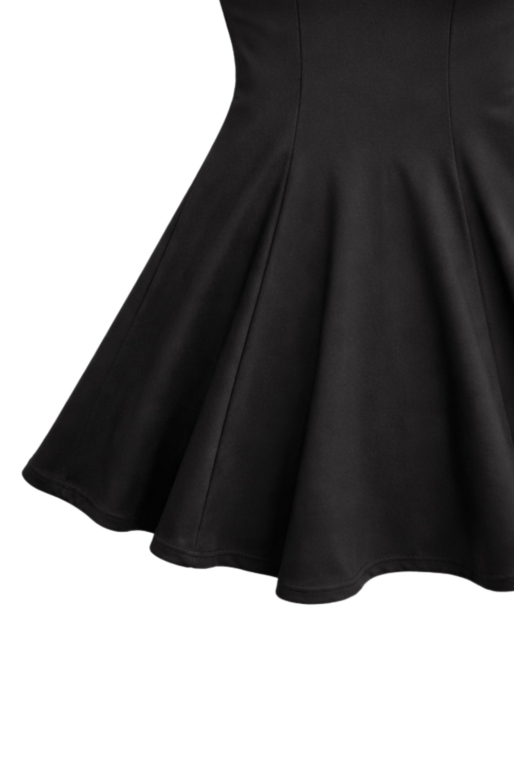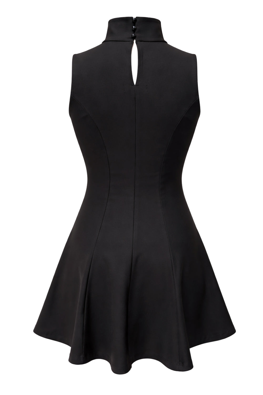 Vestido corto de fit ajustado, cuello alto, sin mangas, pinzas frontales, corte en a y olanes en bajo. Cierre posterior con botones y ojales.