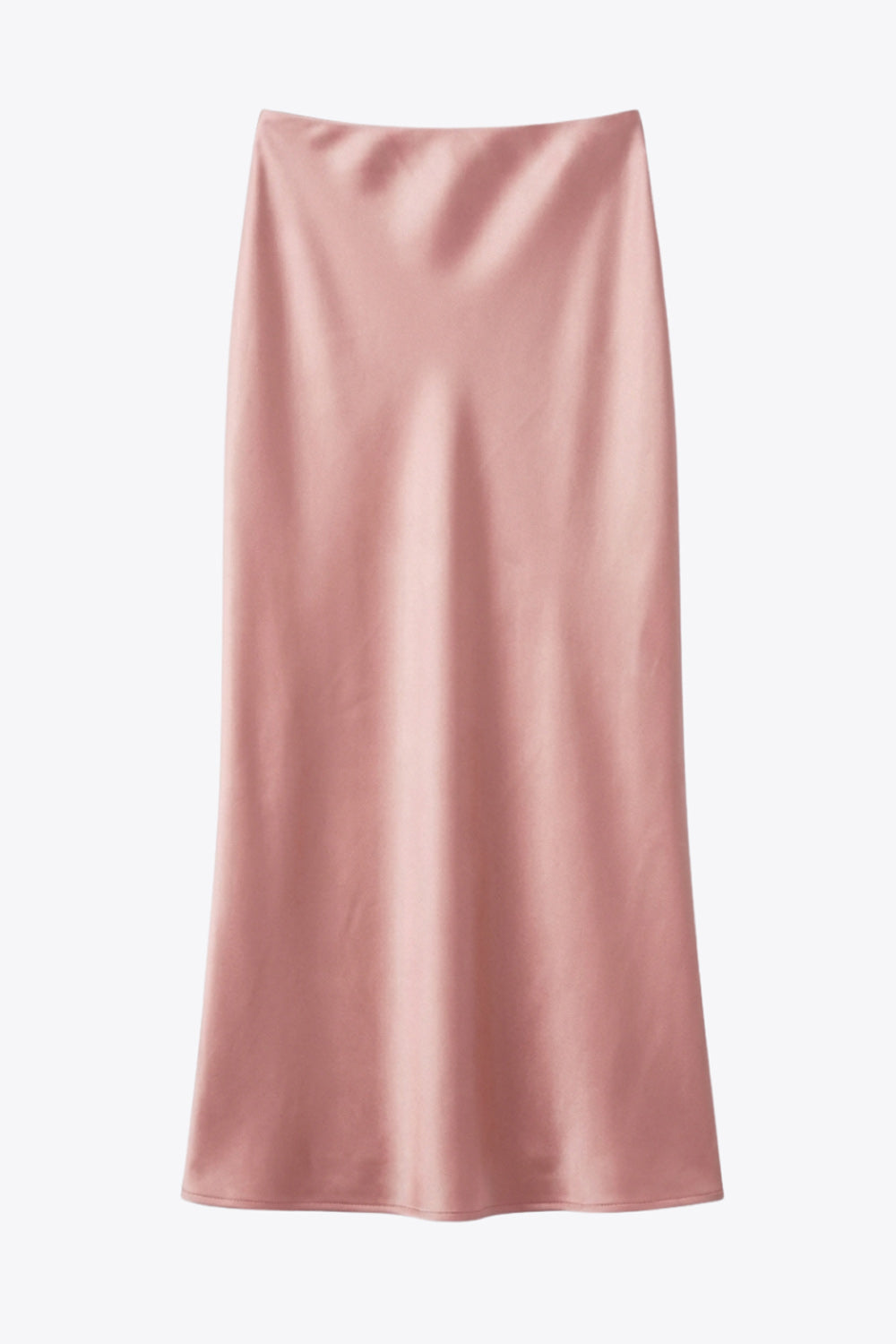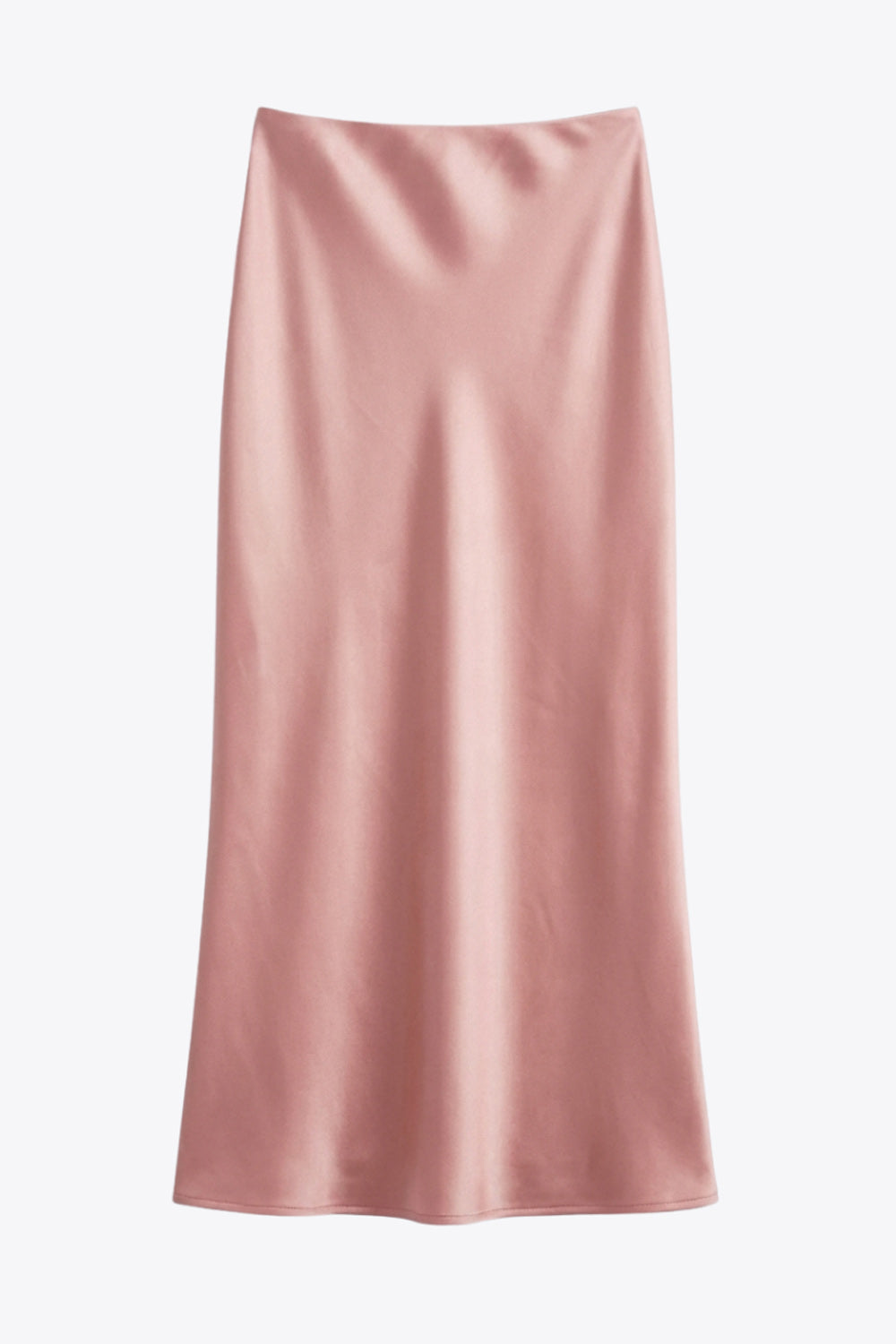 Falda midi satinada de cintura alta con pretina elástica y fit recto.