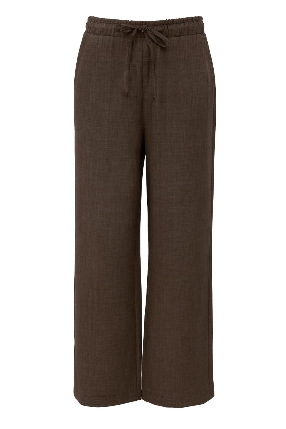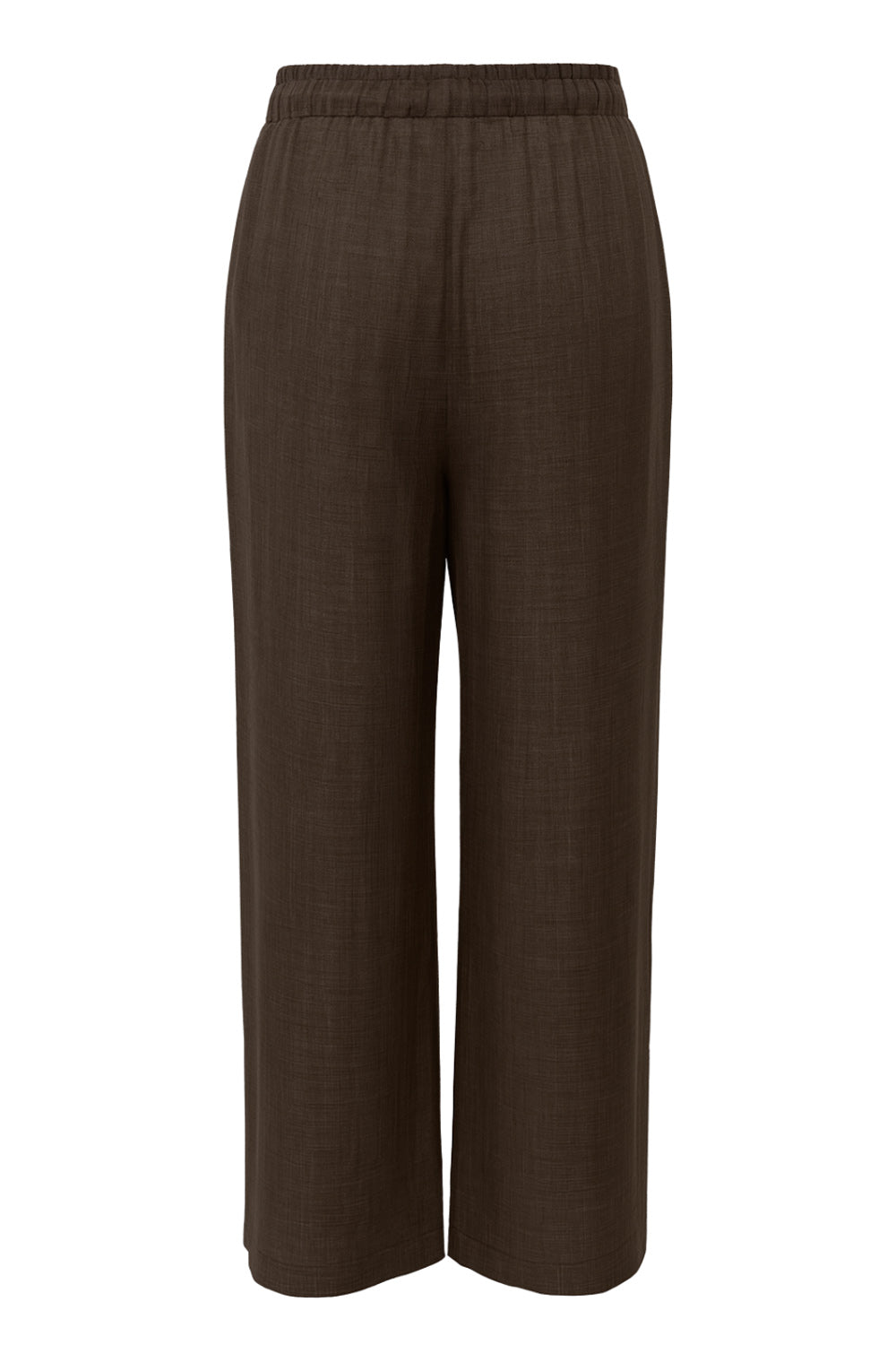 Pantalón fluido de fit recto, bolsillos delanteros, cintura alta con pretina elástica y jareta frontal ajustable.