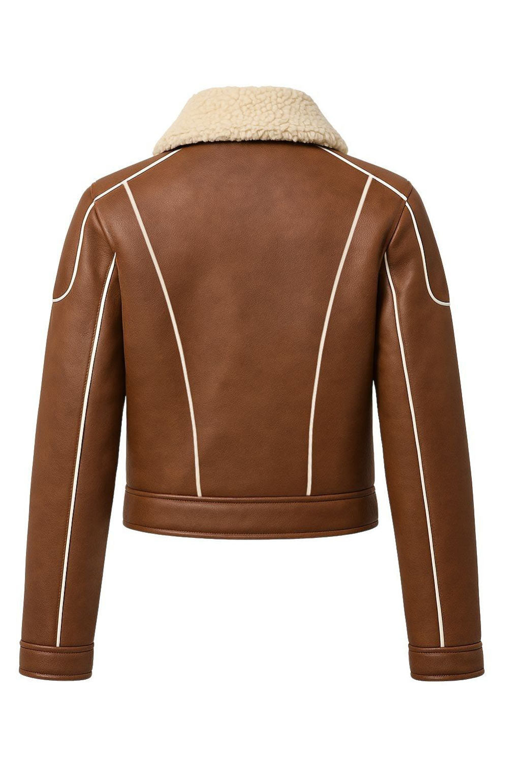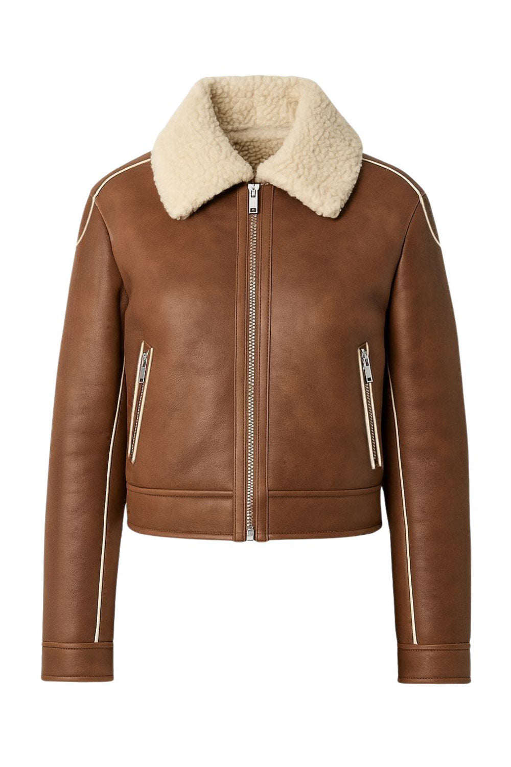 Chamarra corta de efecto piel, interior y cuello solapa de borreguillo, pretina, bolsillos delanteros con cremallera, fit recto, manga larga y cierre frontal con cremallera en contraste. Detalle de costuras decorativas en contraste.