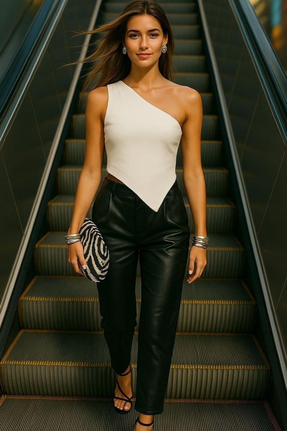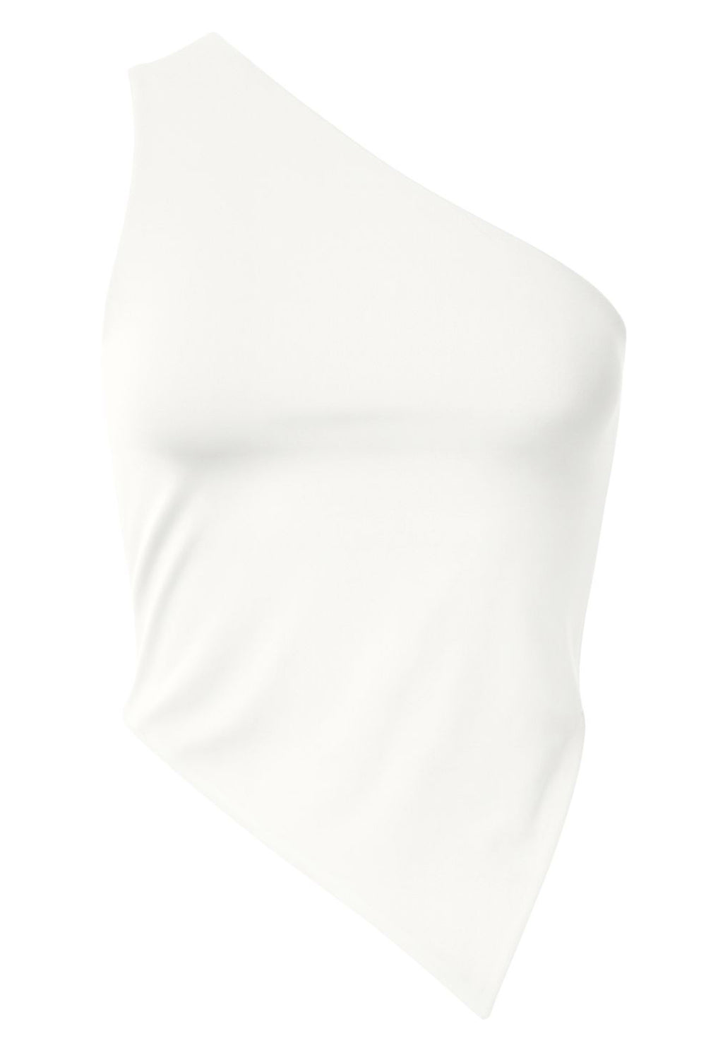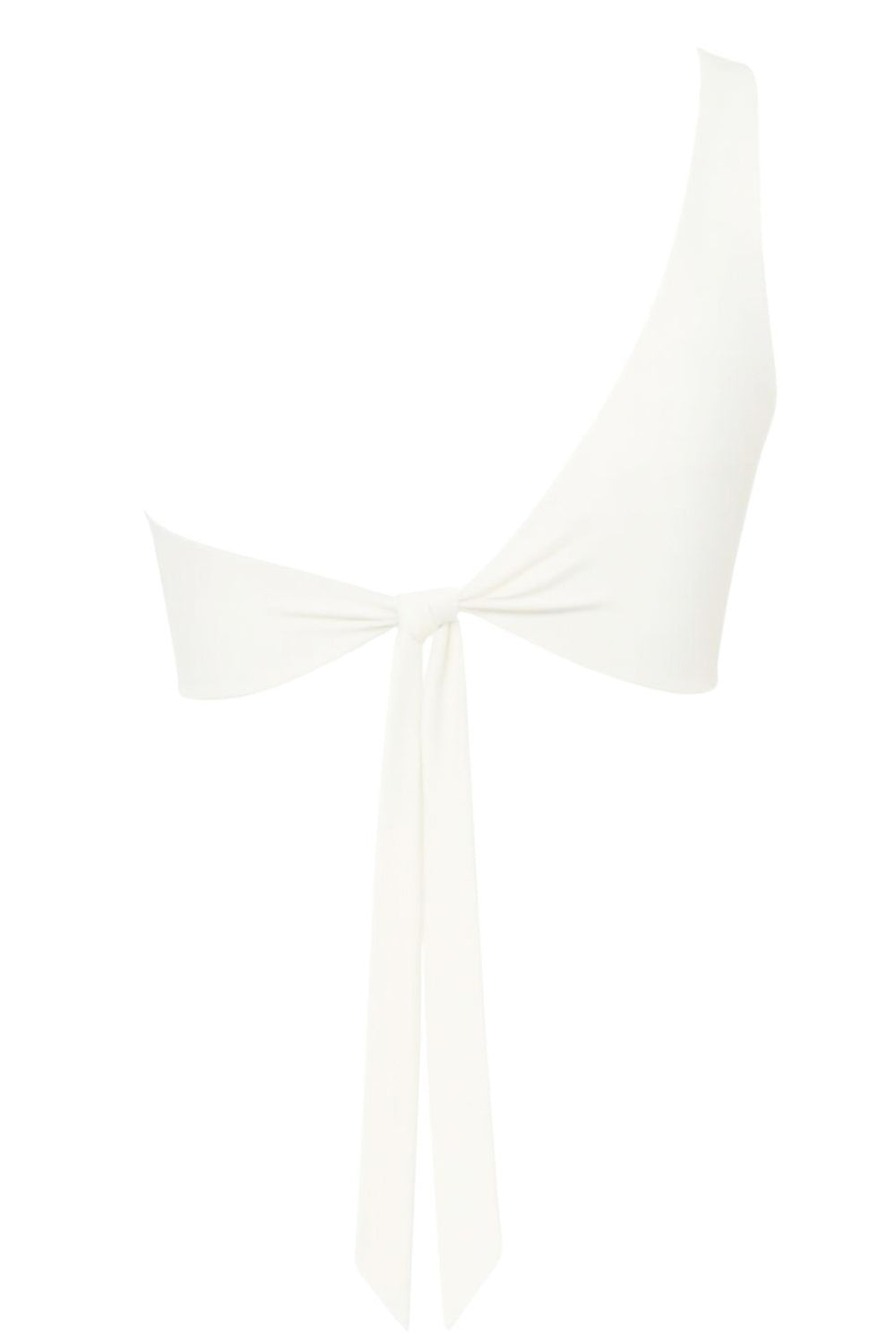 Crop top asimétrico de un hombro, sin mangas, fit ajustado, escote diagonal, escote en espalda, bajo frontal asimétrico y cierre posterior con nudo amarrable.