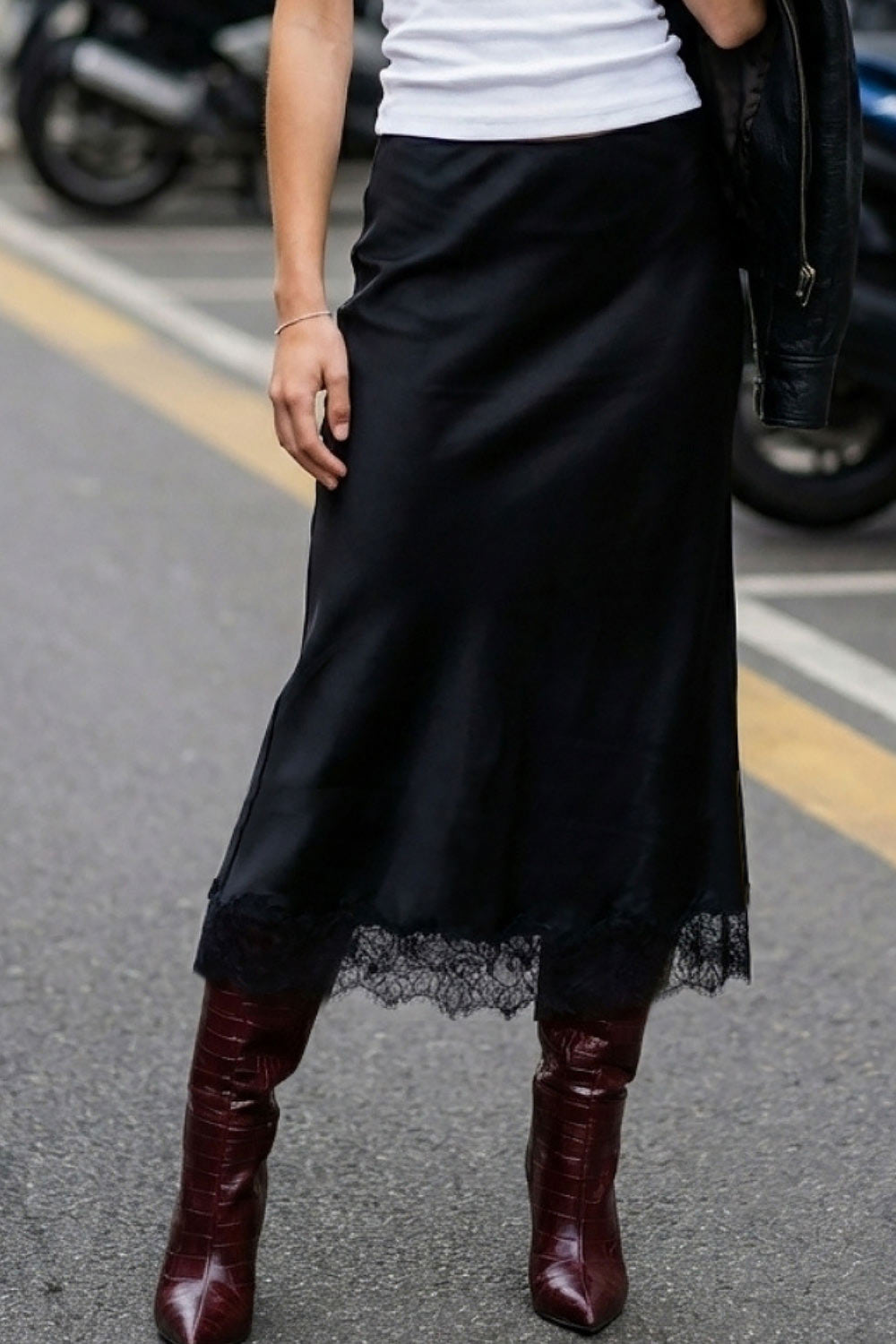 Falda midi satinada de cintura alta con pretina elástica y fit recto. Detalle de encaje en bajo.
