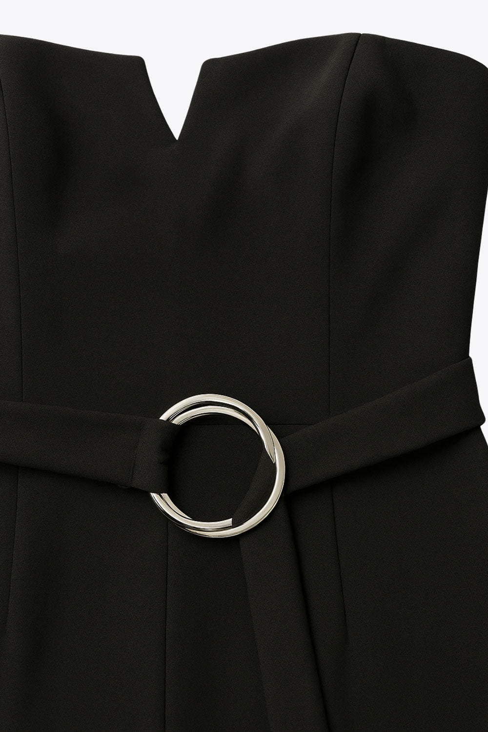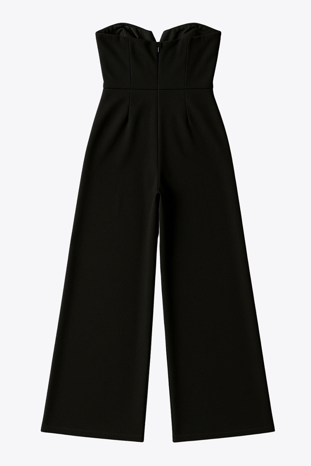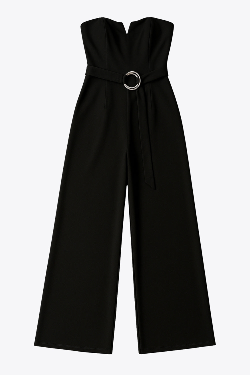 Palazzo strapless de escote v, fit flare, fit ajustado y cinturón con hebilla en contraste. Cierre con cremallera oculta posterior.