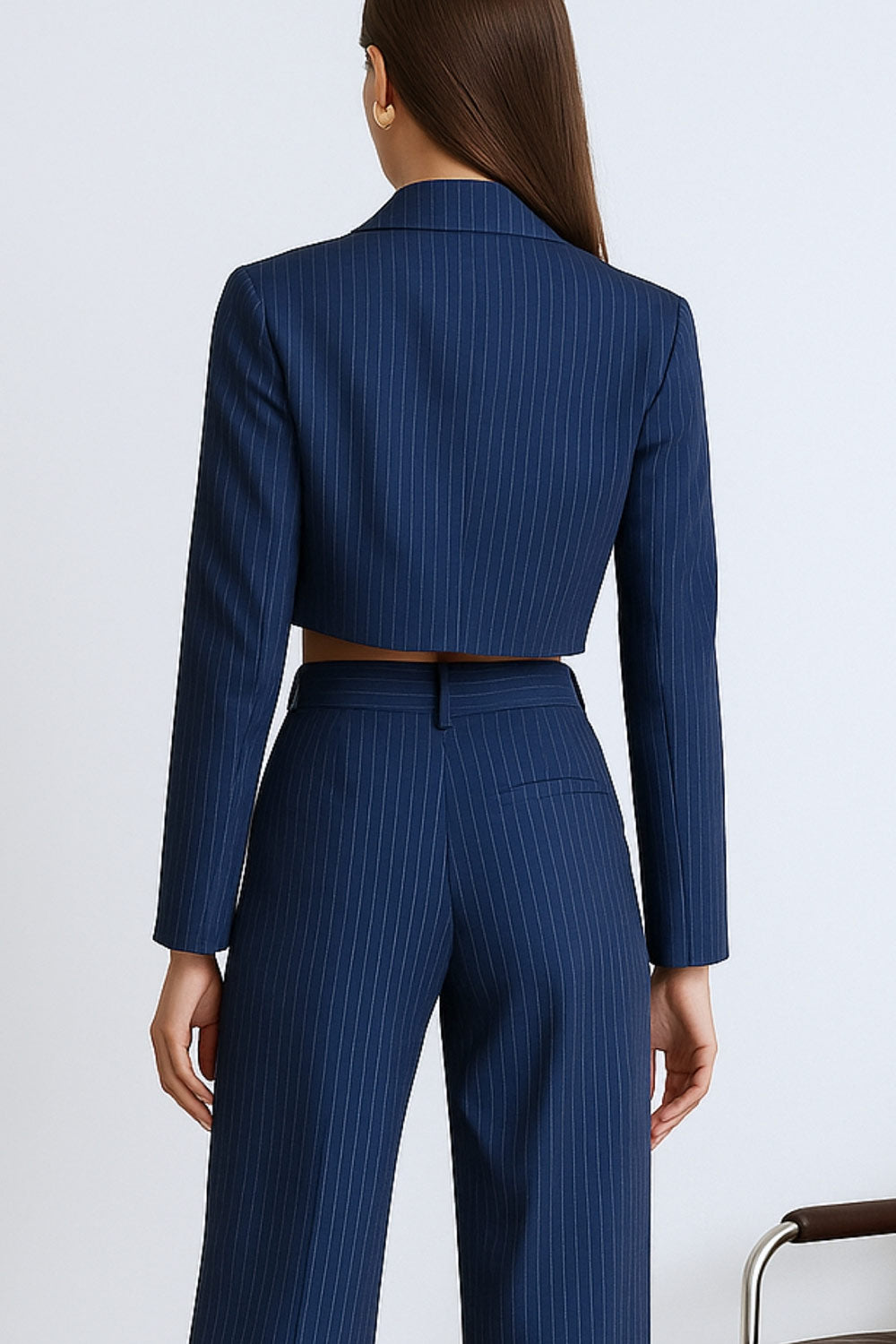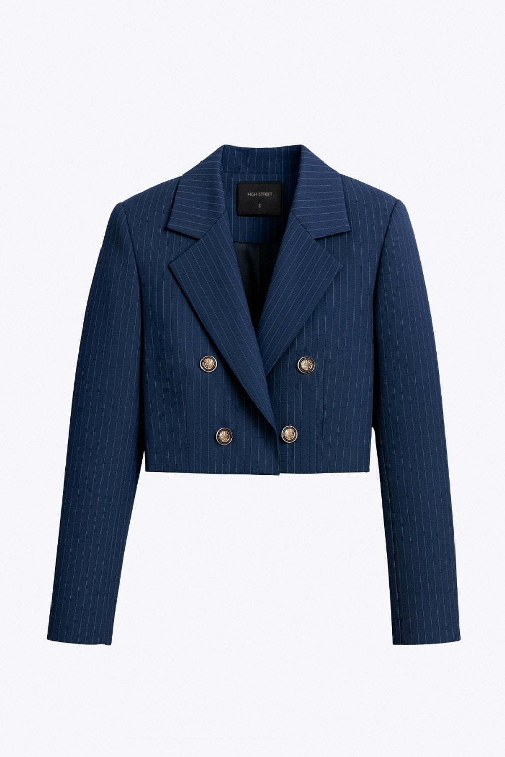 Blazer corto cruzado de fit ajustado, estampado rayas, manga larga, solapa, hombreras y cierre frontal con doble cruce de botones en contraste.