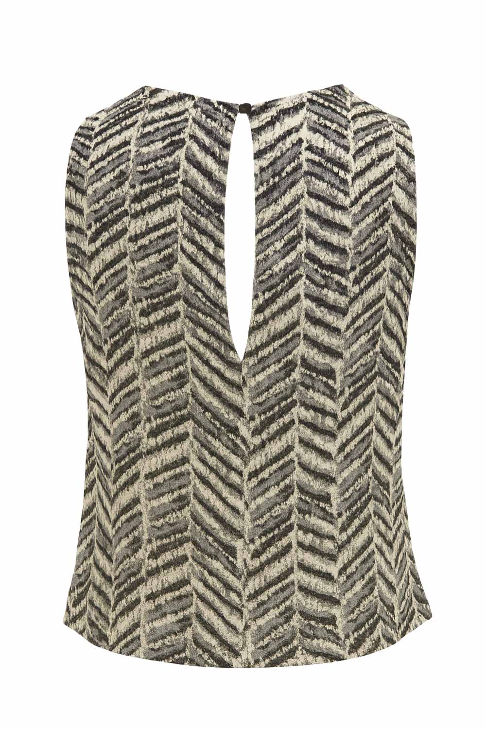 Blusa corta estampada de fit recto, sin mangas, cuello fluido y cierre posterior con botón y ojal.