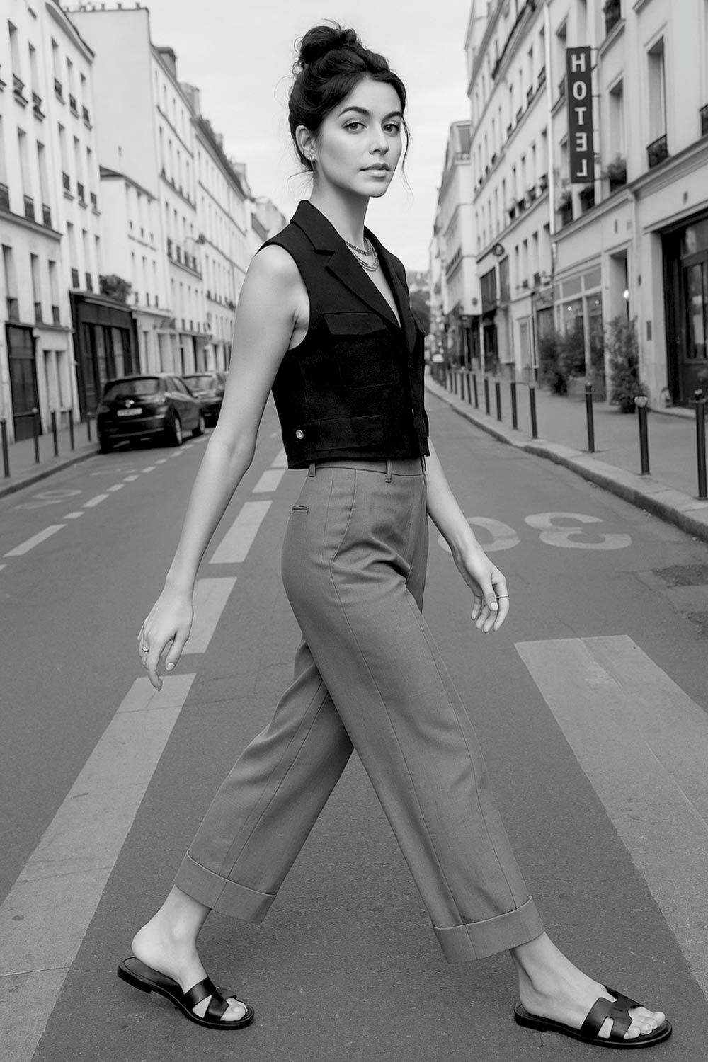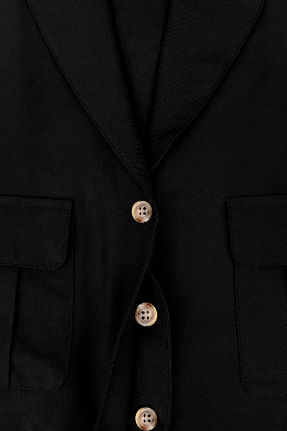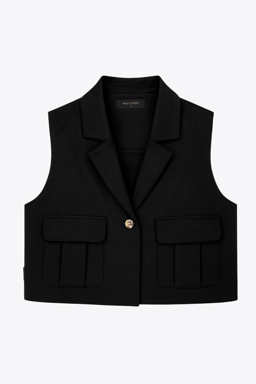 Chaleco corto de fit recto, con solapa, bolsillos delanteros cargo con cartera, pinza de amplitud en espalda y detalle de trabillas laterales decorativas con botón.