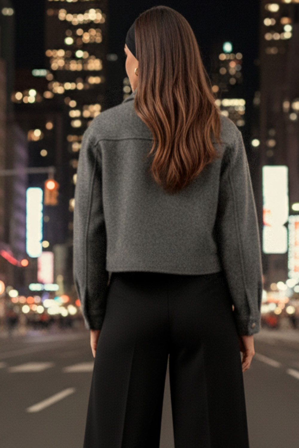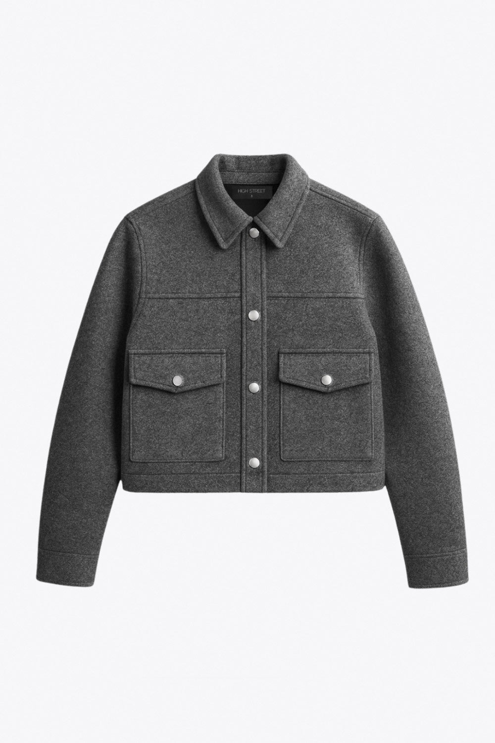 Chamarra corta de fit recto, cuello camisero, manga larga con puño abotonado, cortes decorativos frontales, bolsillos delanteros con cartera y botón. Cierre frontal con hilera de botones en contraste.