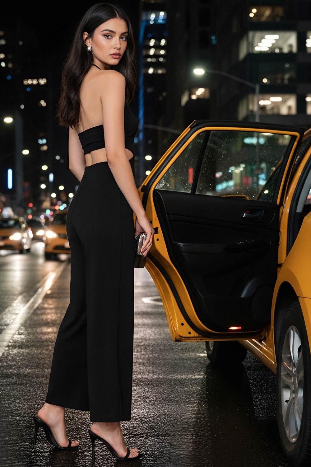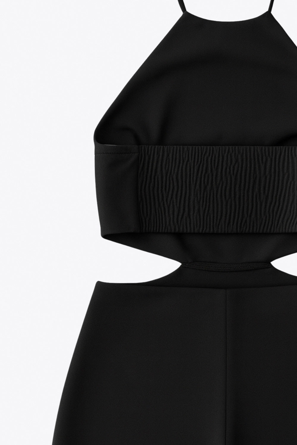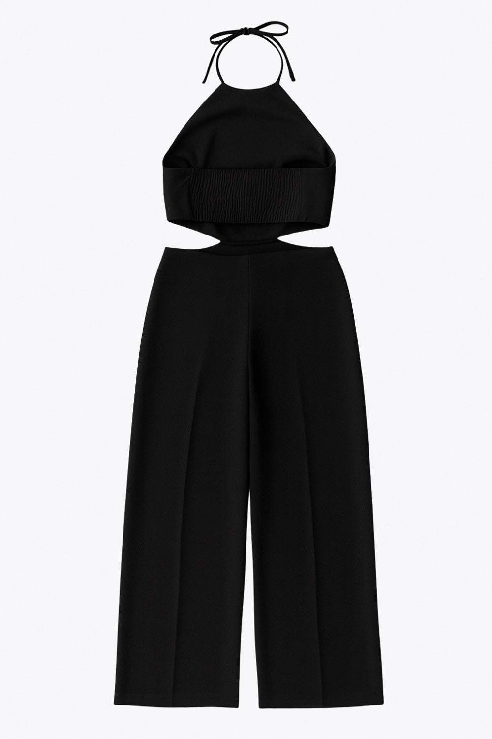 Palazzo ajustado de fit wide leg, cuello halter con lazo amarrable posterior, cut out en costados y espalda. Detalle de fruncido en espalda.