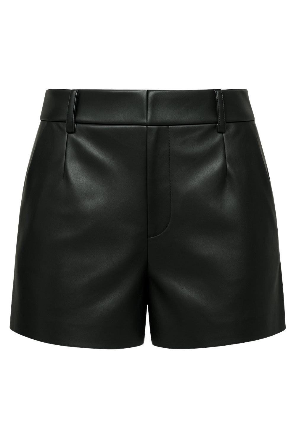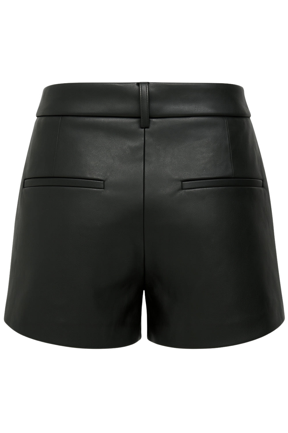 Short corto de efecto piel, fit recto, cintura alta con pretina y trabillas, pinzas frontales, bolsillos delanteros y vivos decorativos posteriores. Cierre frontal con broche y cremallera ocultos.