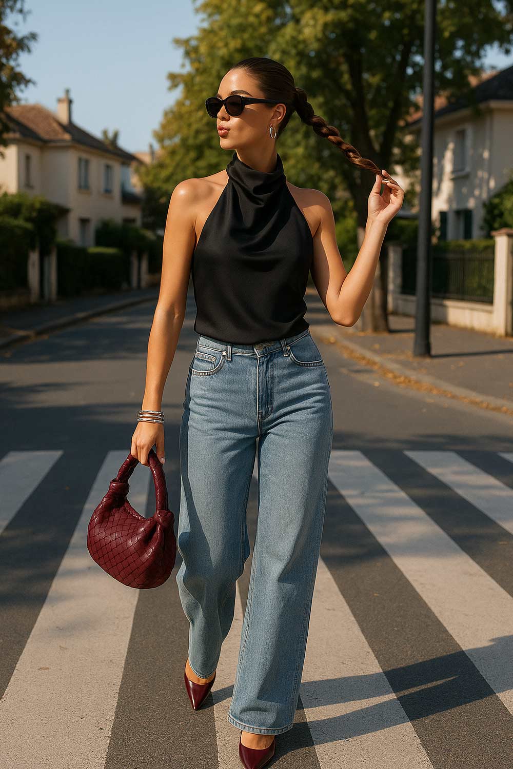 Top corto halter satinado de cuello alto fluido, fit recto, escote en espalda, cierre posterior con botón y ojal.