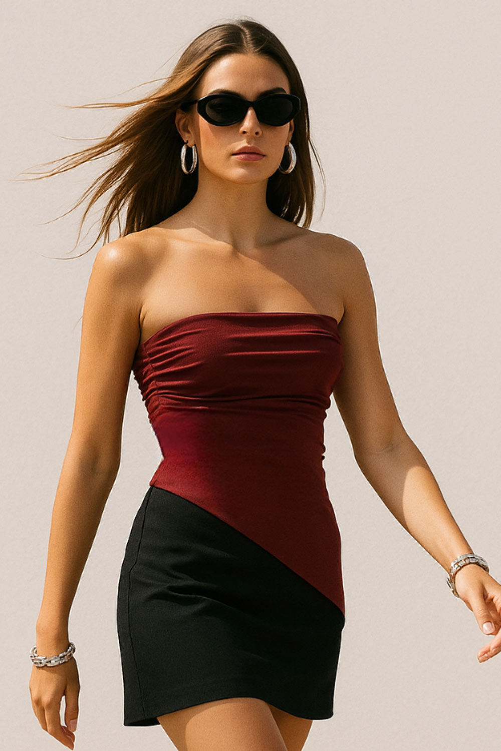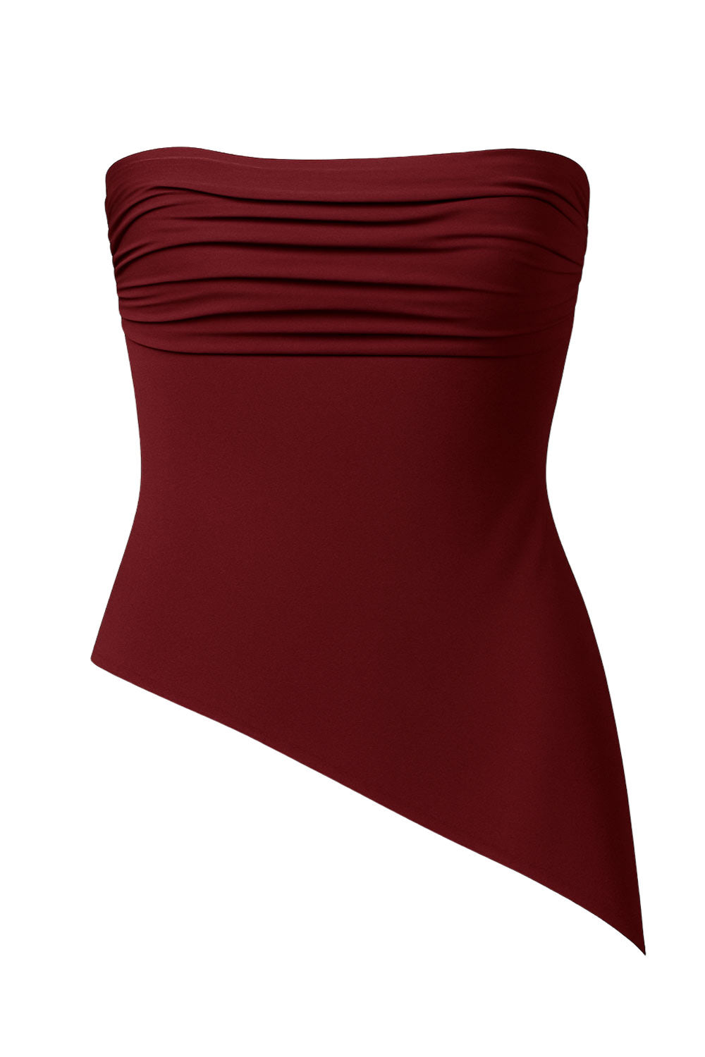 Top tubo de fit ajustado, escote recto con detalles plisados laterales y bajo diagonal asimétrico con rib en borde.