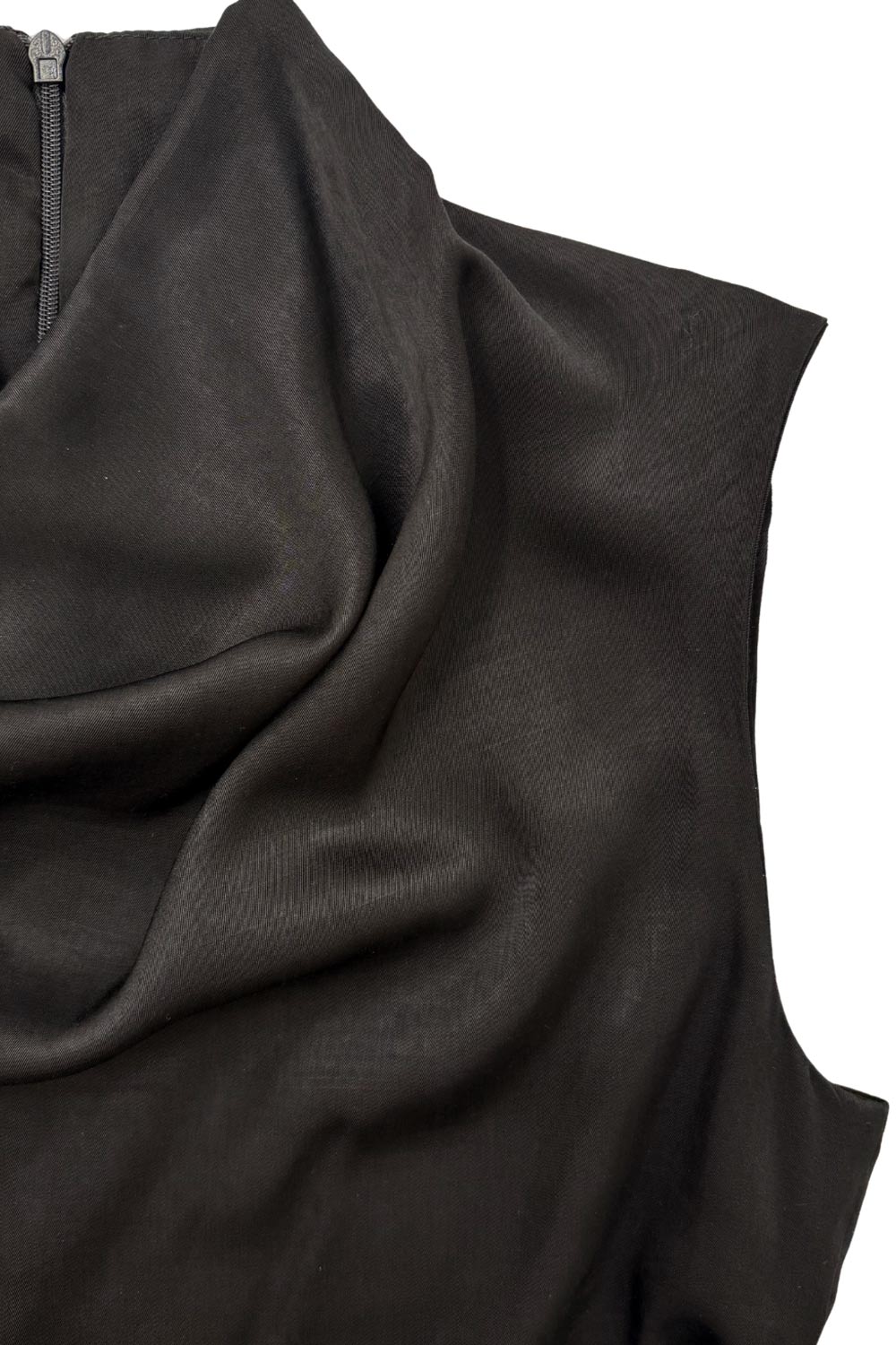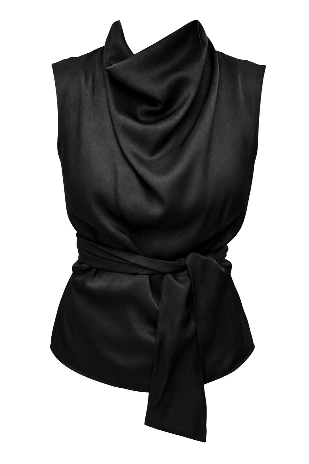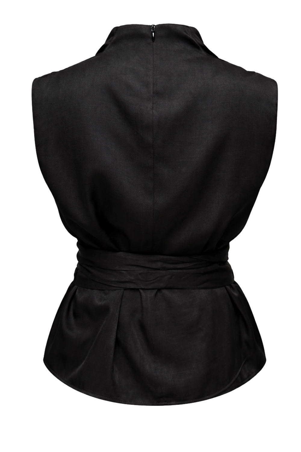 Blusa de fit recto, sin mangas, cuello alto fluido, trabillas y cinturón amarrable del mismo tejido. Cierre posterior con cremallera oculta.