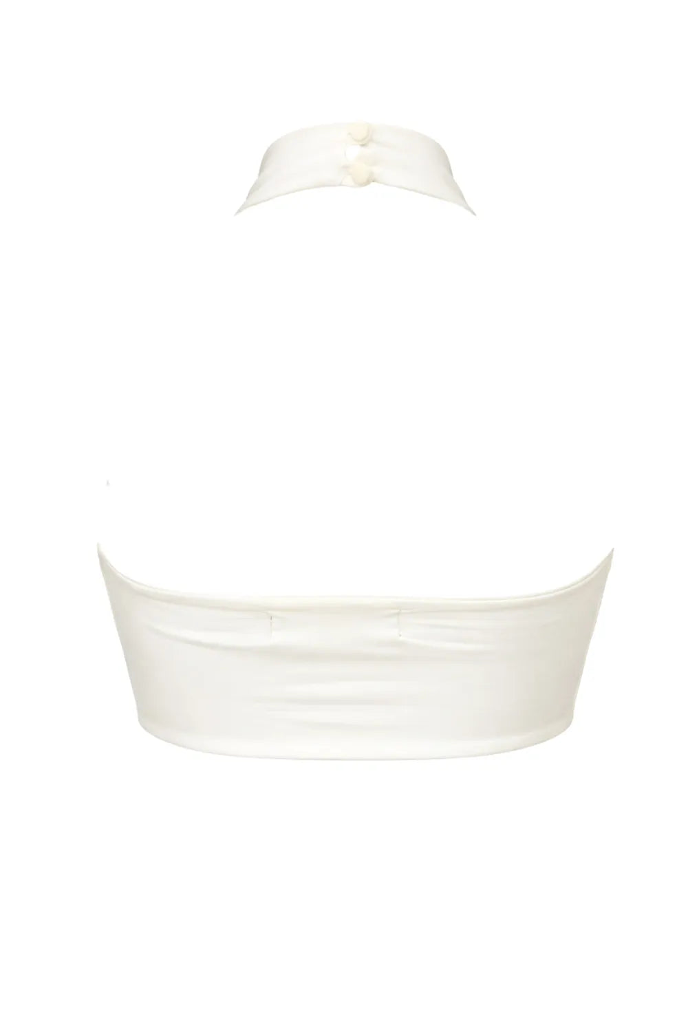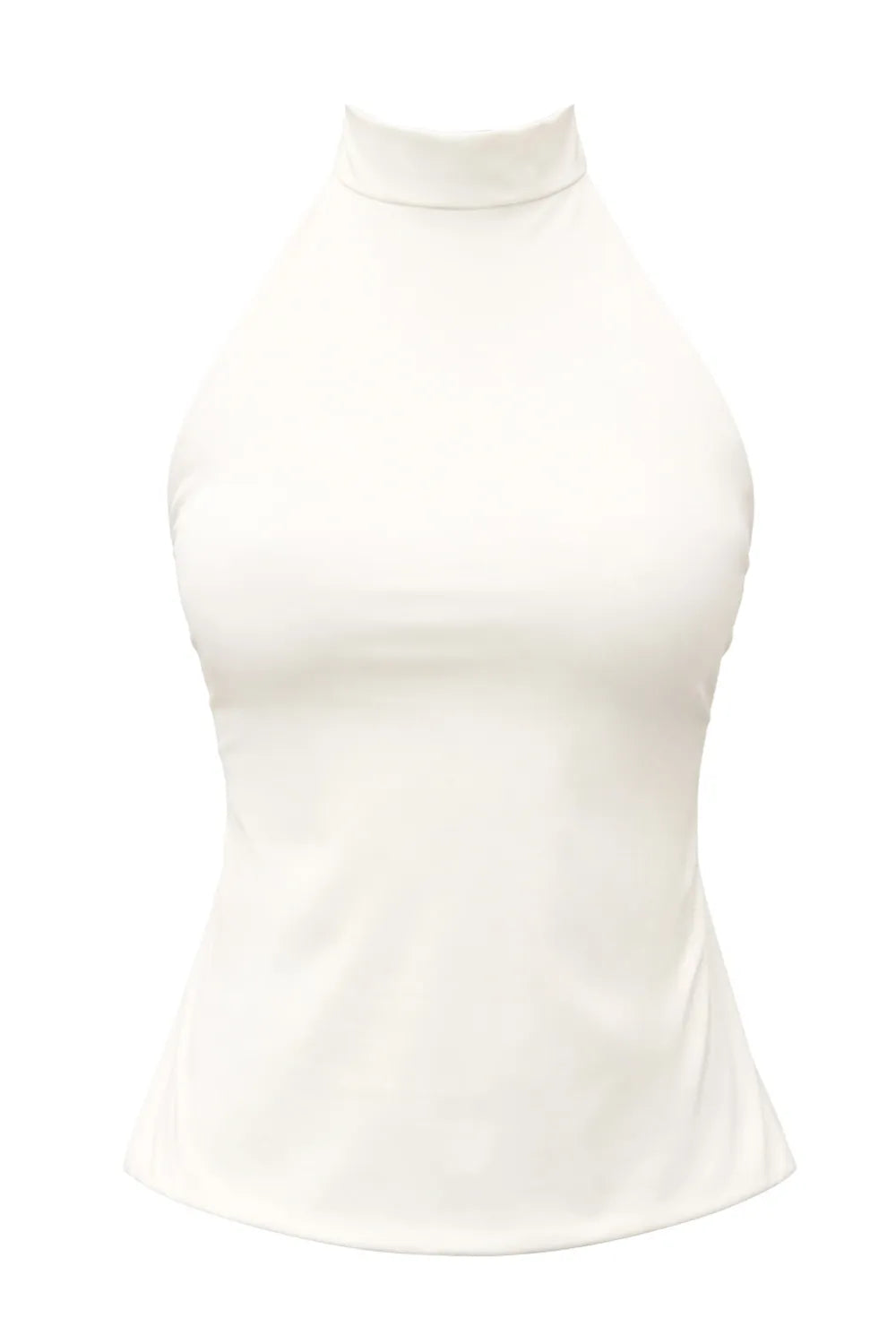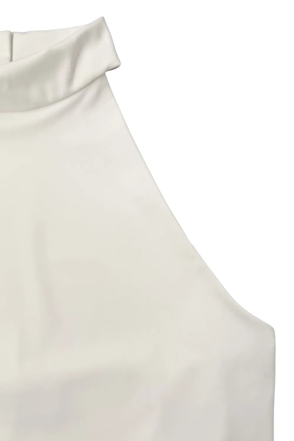 Top de fit ajustado, sin mangas, escote en espalda, cuello alto halter, cierre posterior con botón y ojal.