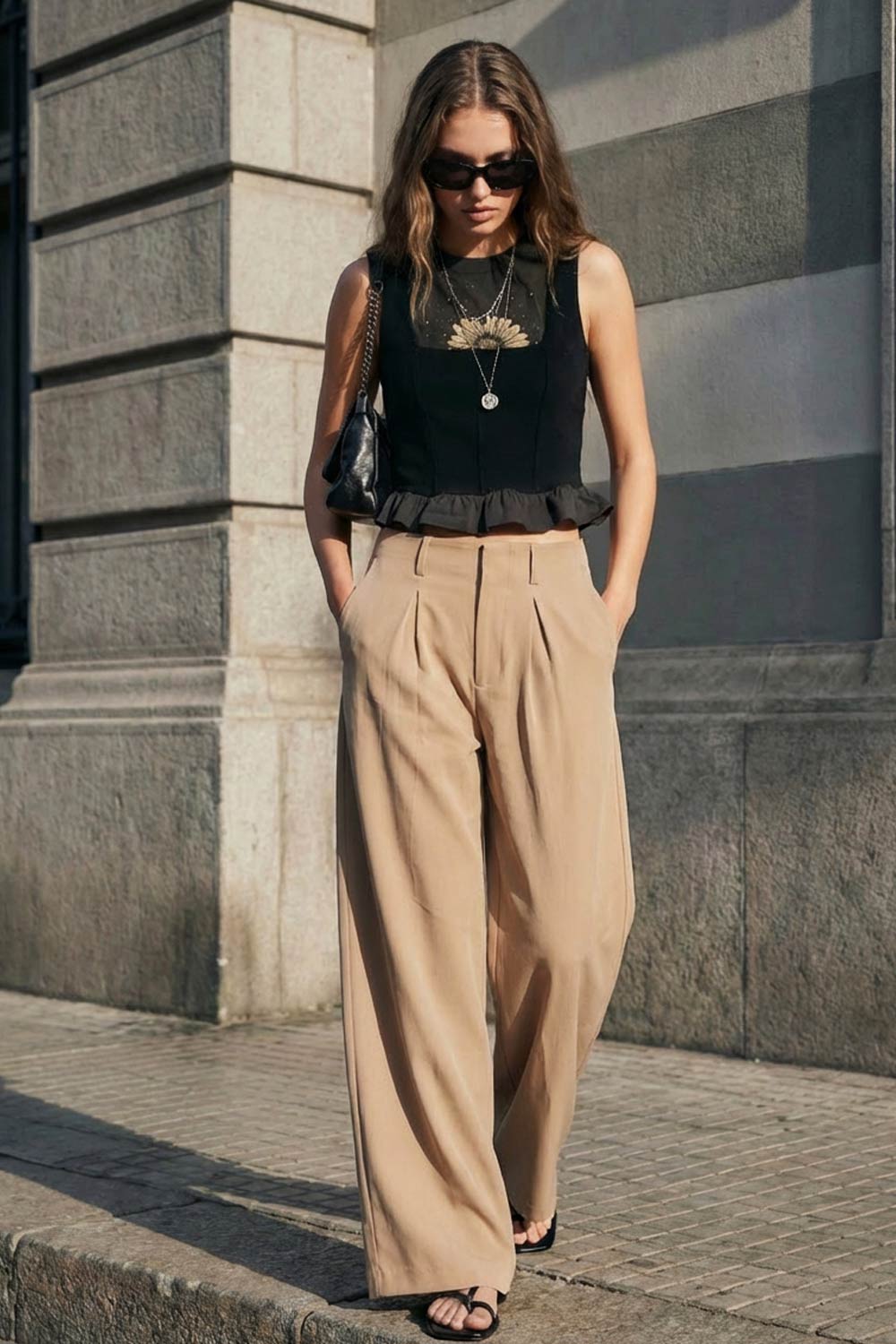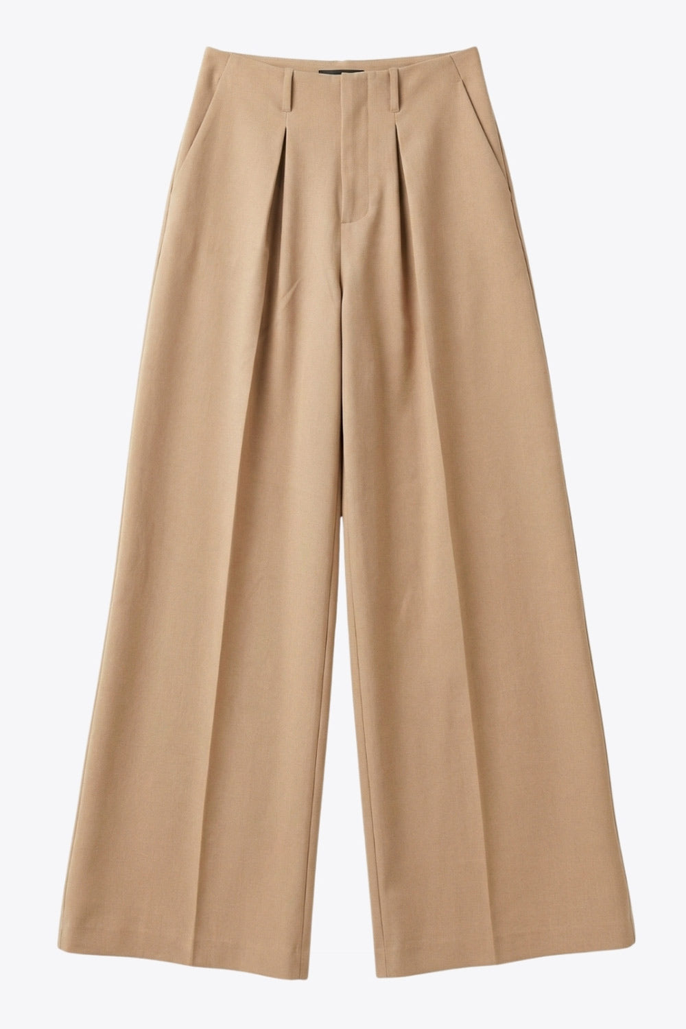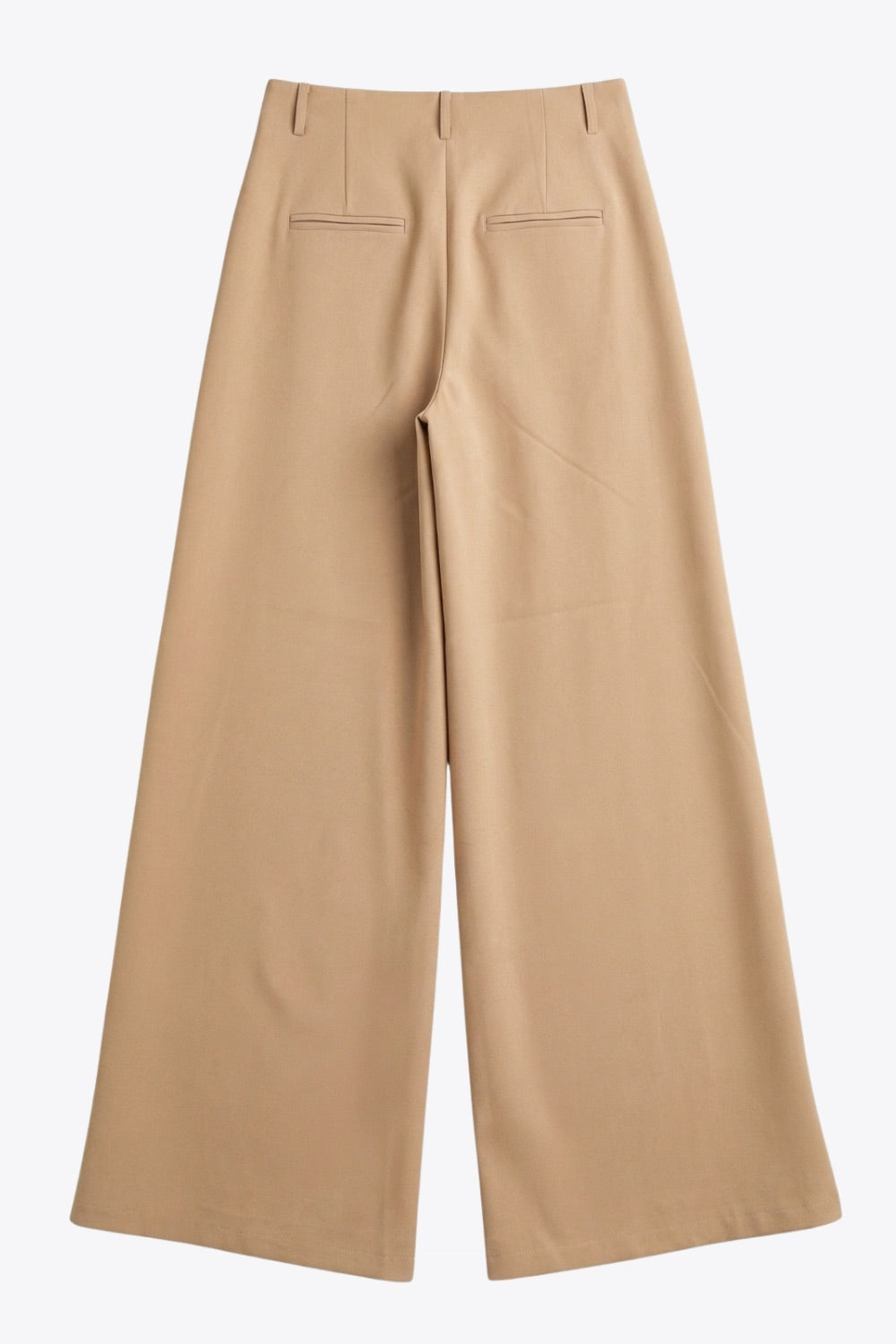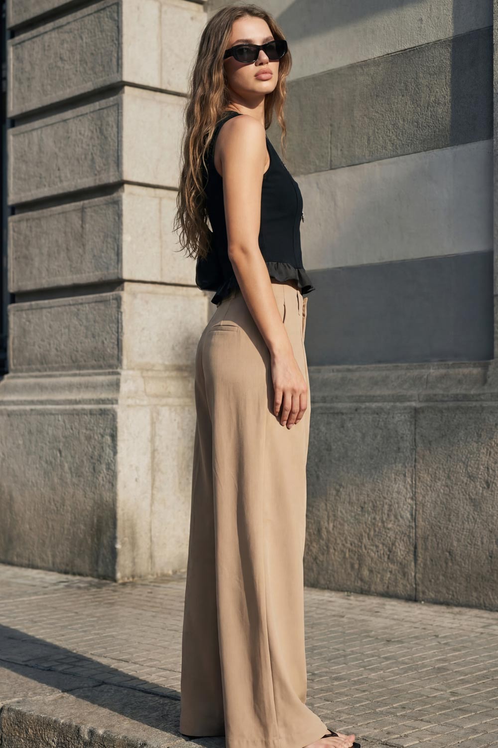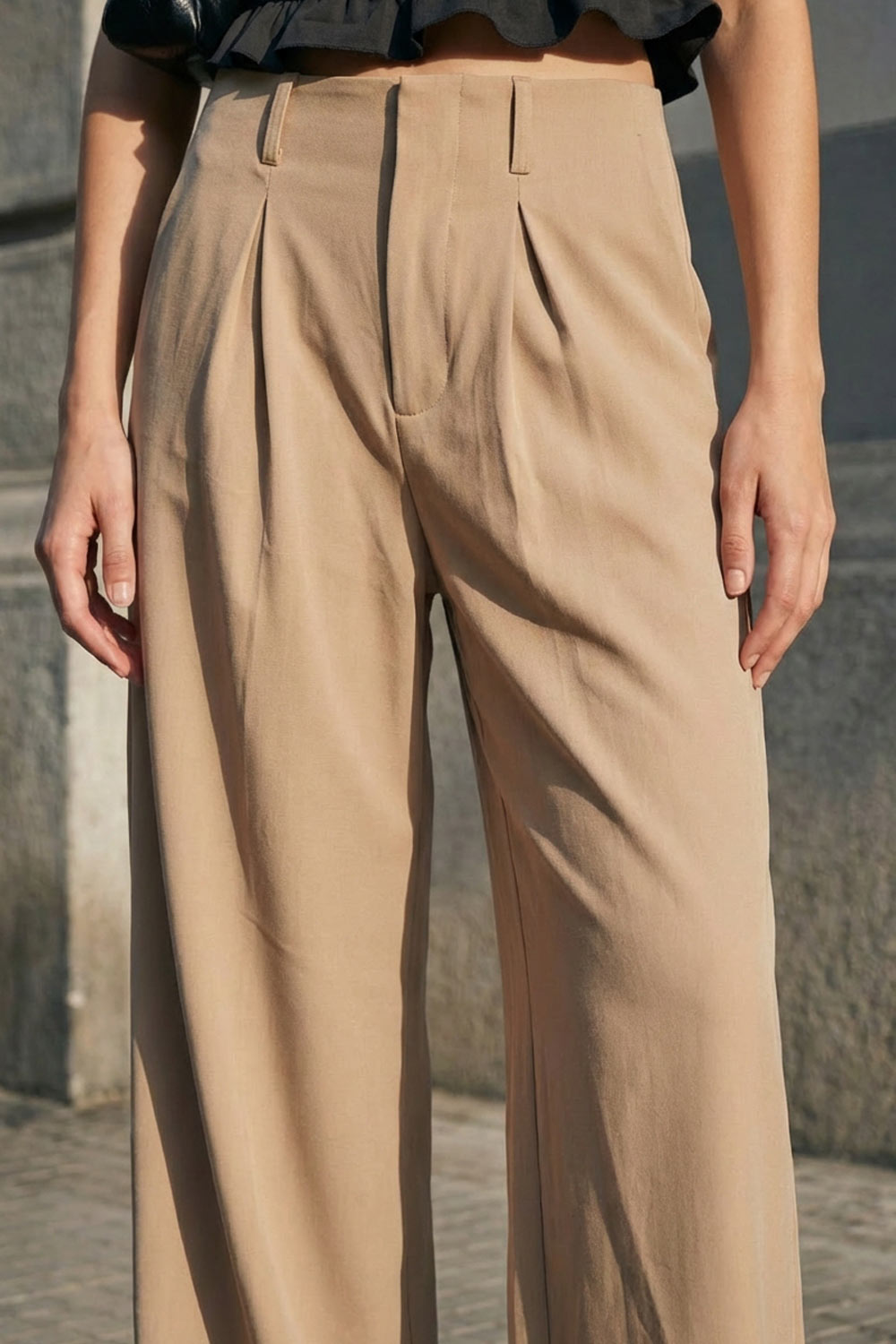 Pantalón de fit palazzo, cintura alta con trabillas, pinzas frontales, bolsillos delanteros y vivos decorativos posteriores, raya frontal y posterior. Cierre frontal con broche y cremallera ocultos.