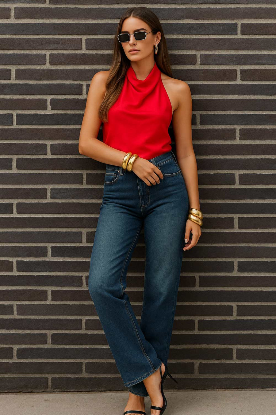Pantalón de denim, fit recto, cintura alta con pretina y trabillas, detalle de rotos en bajo, bolsillos delanteros y traseros de parche. Cierre frontal con botón y cremallera oculta.