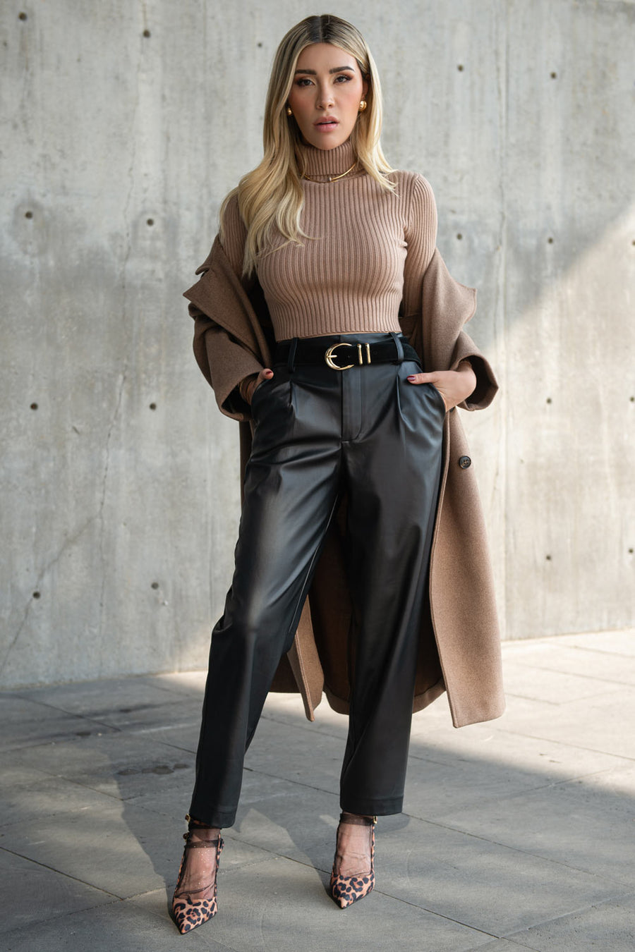 Pantalón de efecto piel, fit recto, cintura alta con pretina y trabillas, pinzas frontales, bolsillos delanteos y vivos decorativos posteriores.