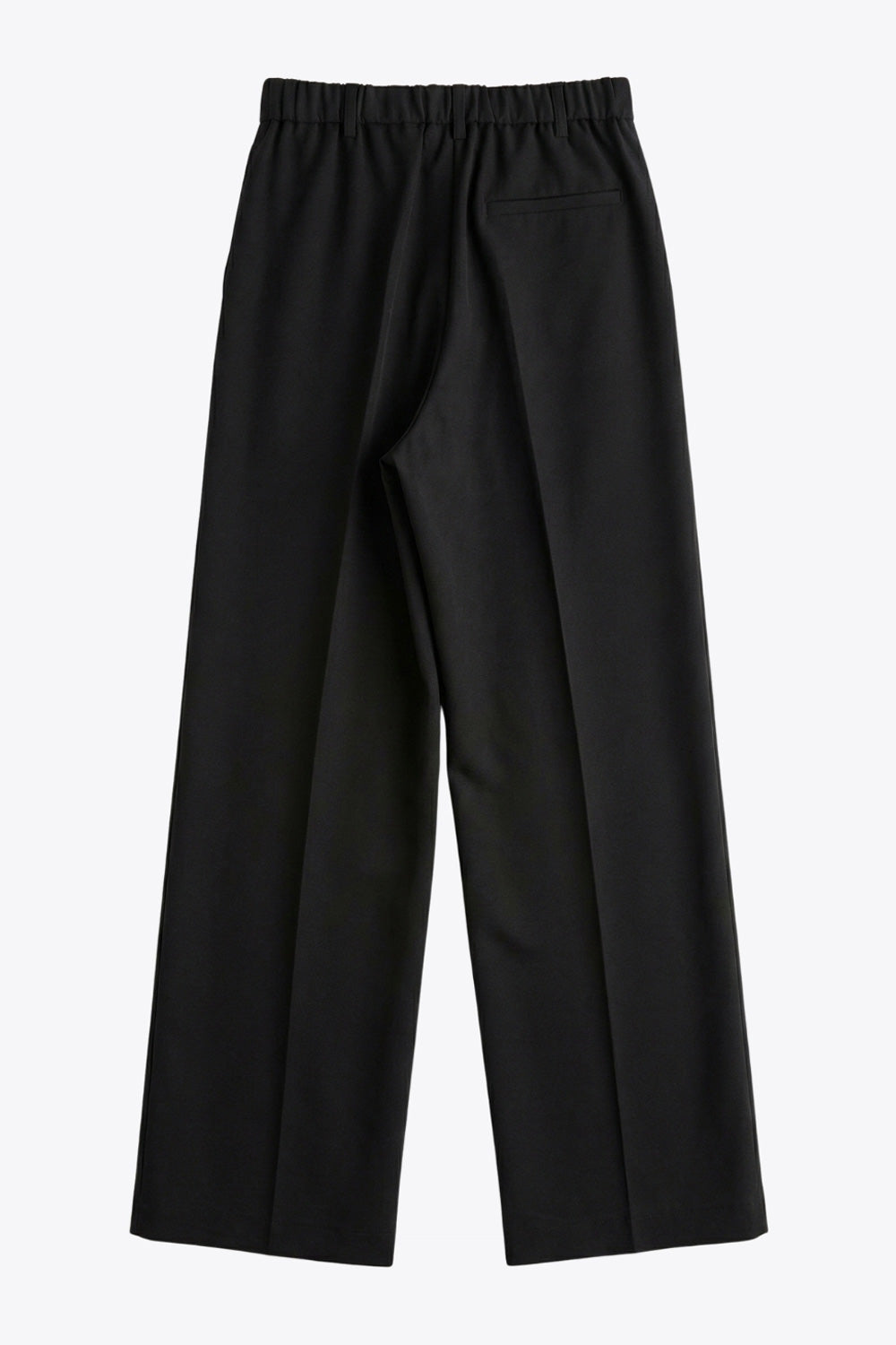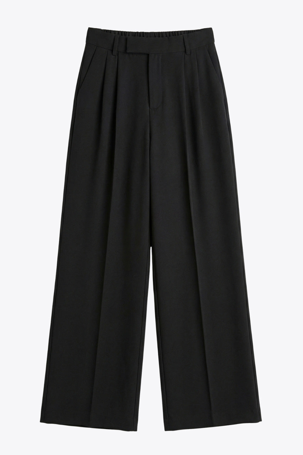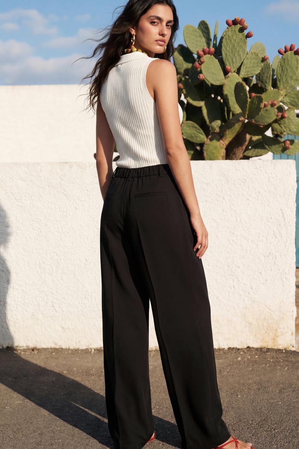 Pantalón de fit wide leg, cintura alta con pretina elástica posterior y trabillas, pinzas frontales, bolsillos delanteros y vivo decorativo posterior. Cierre frontal con broche y cremallera ocultos. Detalle de raya frontal y posterior.