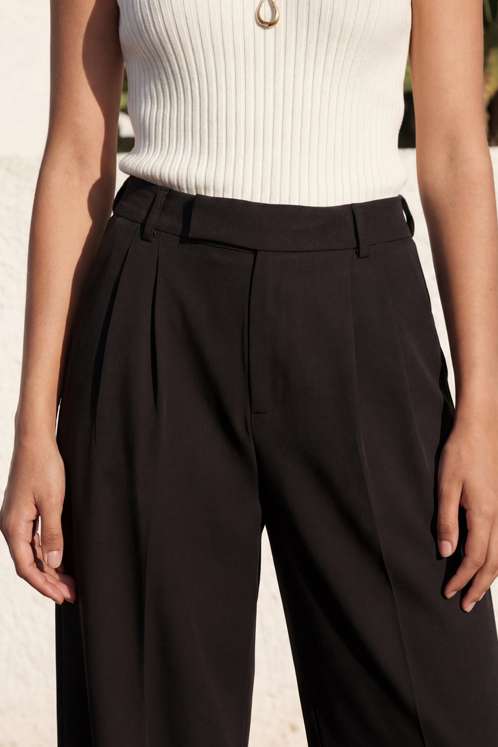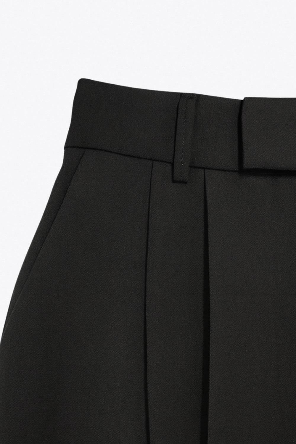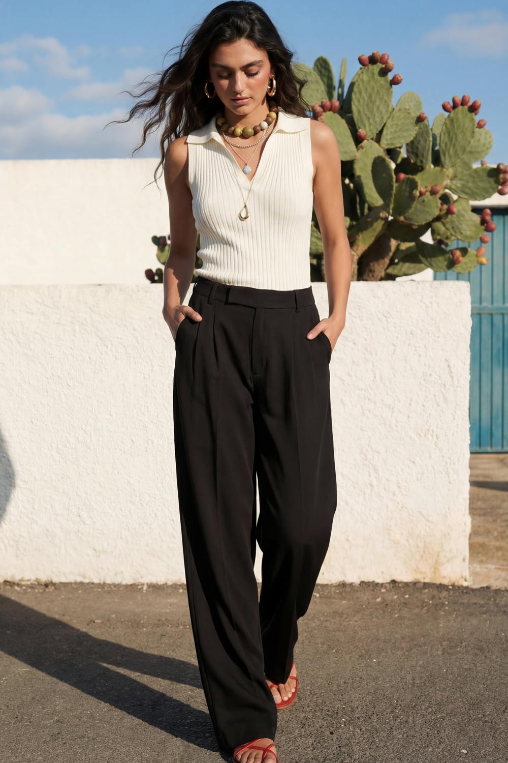 Pantalón de fit wide leg, cintura alta con pretina elástica posterior y trabillas, pinzas frontales, bolsillos delanteros y vivo decorativo posterior. Cierre frontal con broche y cremallera ocultos. Detalle de raya frontal y posterior.