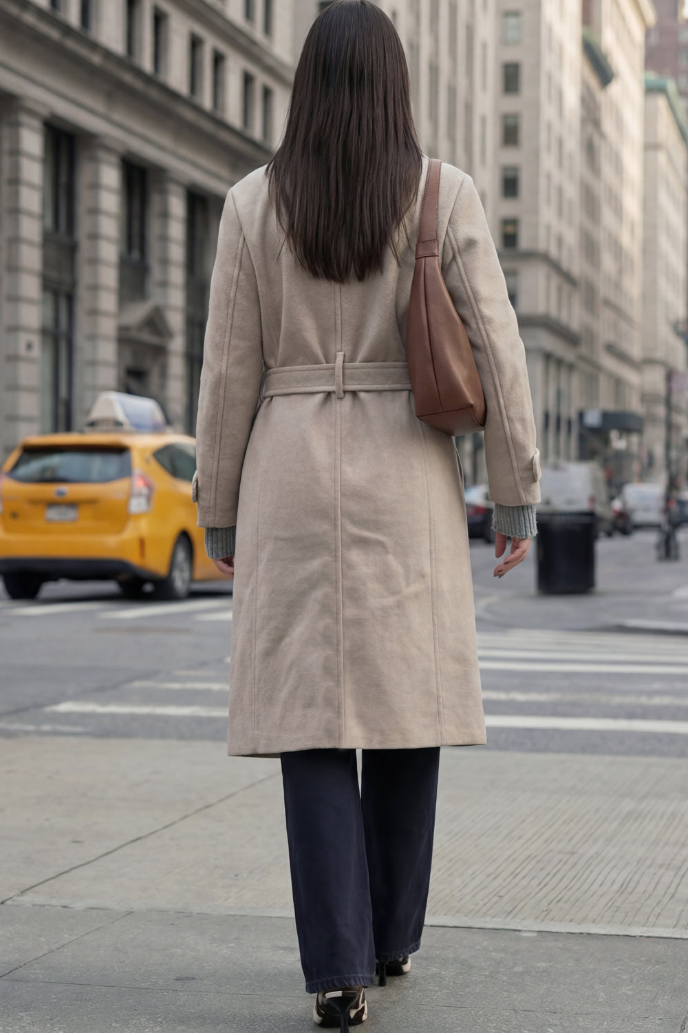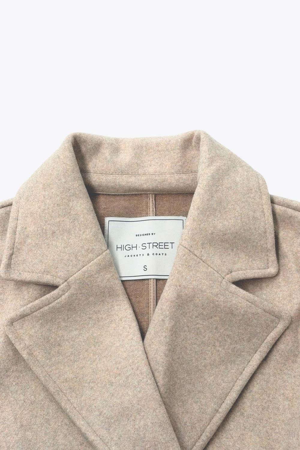 Abrigo largo cruzado de fit recto, con solapa, manga larga con trabilla y botón en puño, bolsillos delanteros con vivos, cierre frontal con doble cruce de botones en contraste y abertura posterior.