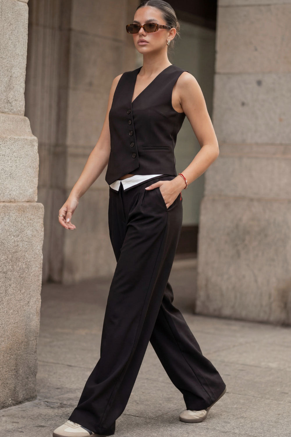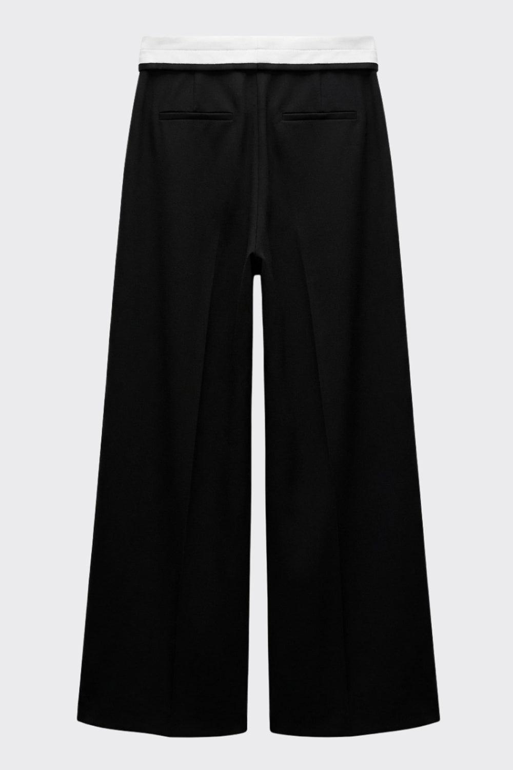 Pantalón de fit wide leg, pinzas frontales, cintura media, pretina con detalle de tailoring en contraste, bolsillos delanteros y vivos decorativos posteriores. Cierre frontal con broche y cremallera ocultos.