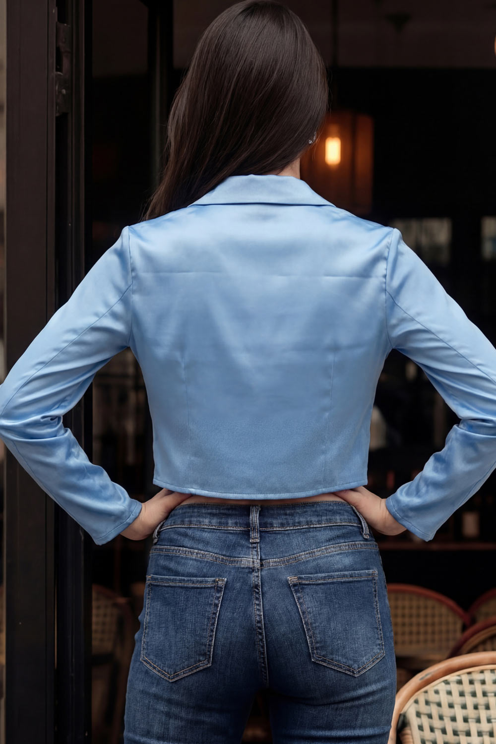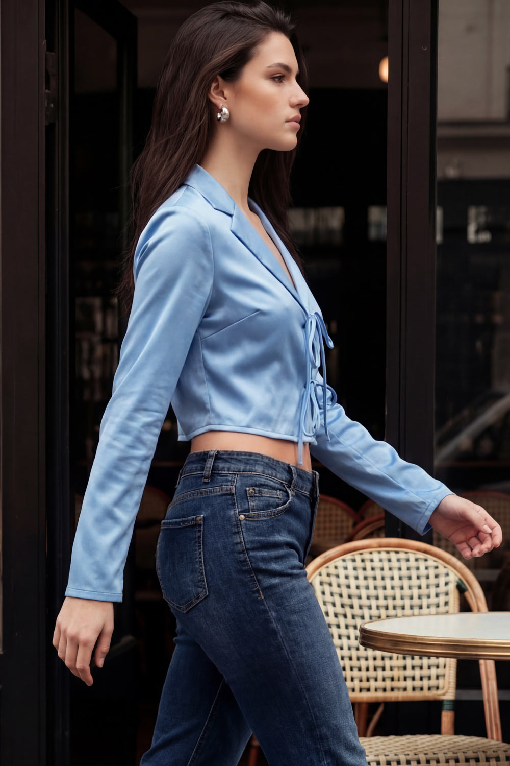 Blazer corto satinado de fit recto, manga larga, con solapa y cierre frontal con doble lazo amarrable.
