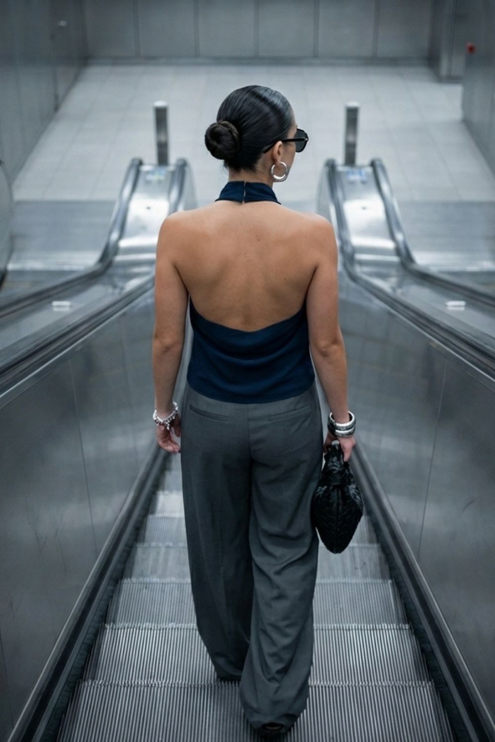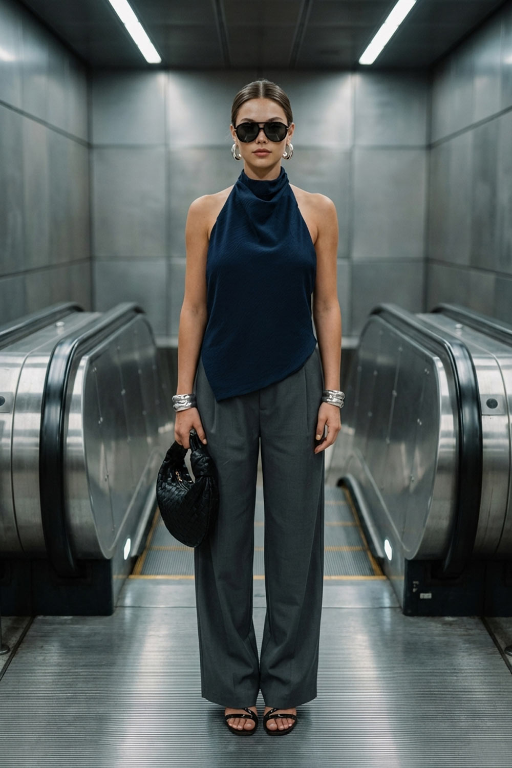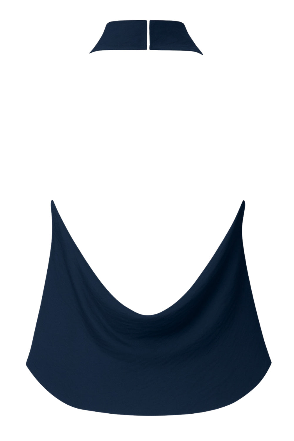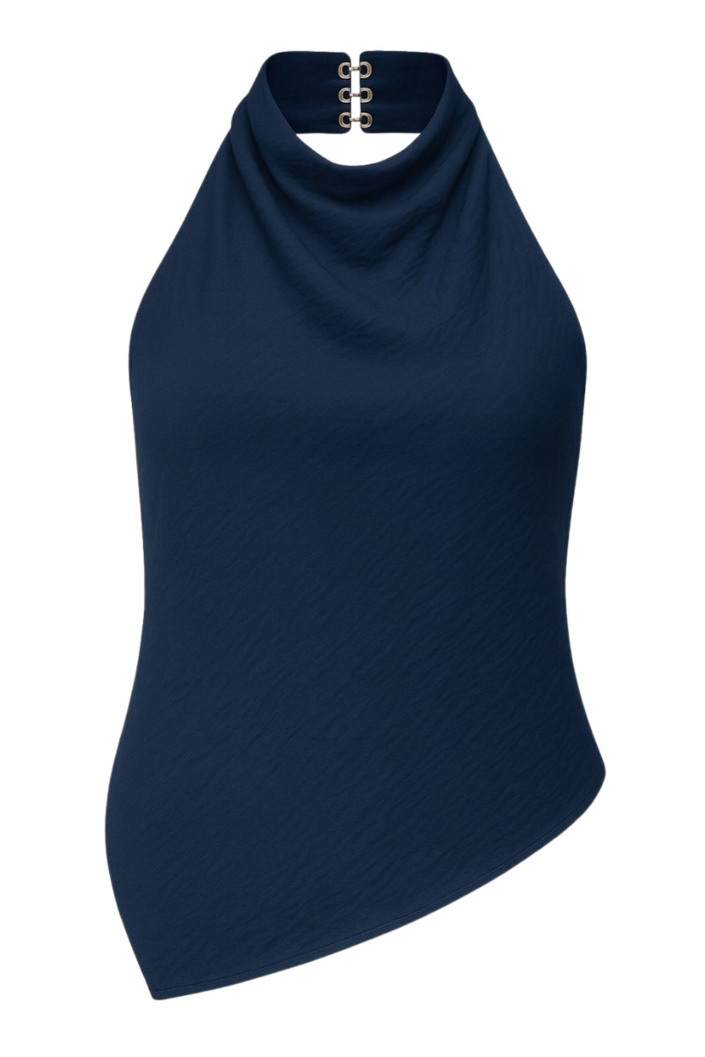 Blusa halter de cuello alto fluido, sin mangas, fit recto, escote en espalda y bajo asimétrico frontal. Cierre posterior con broche oculto.