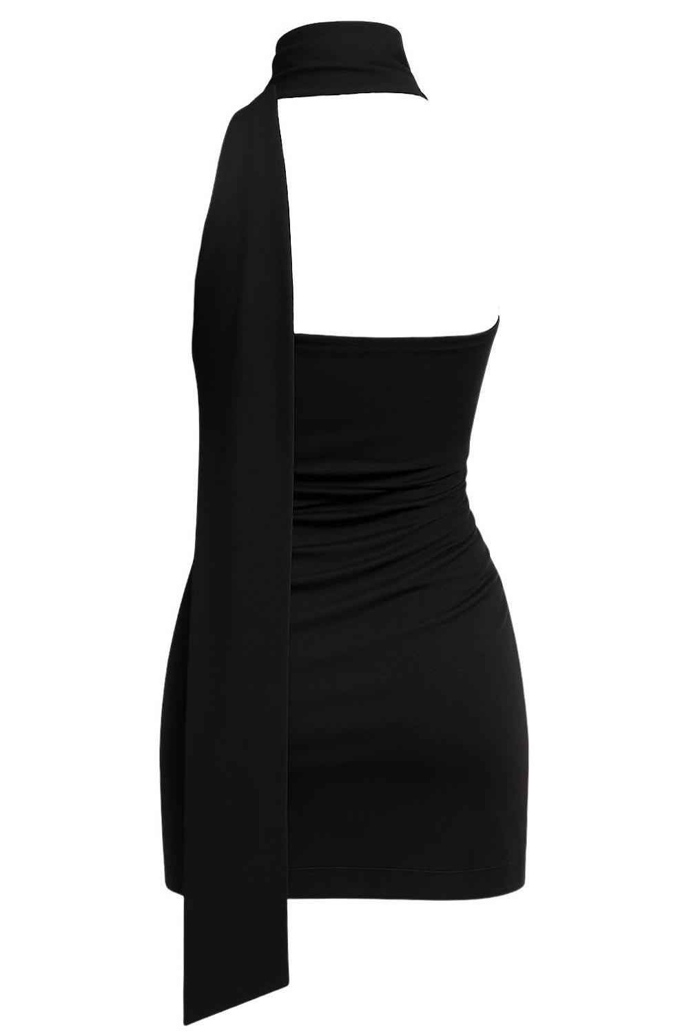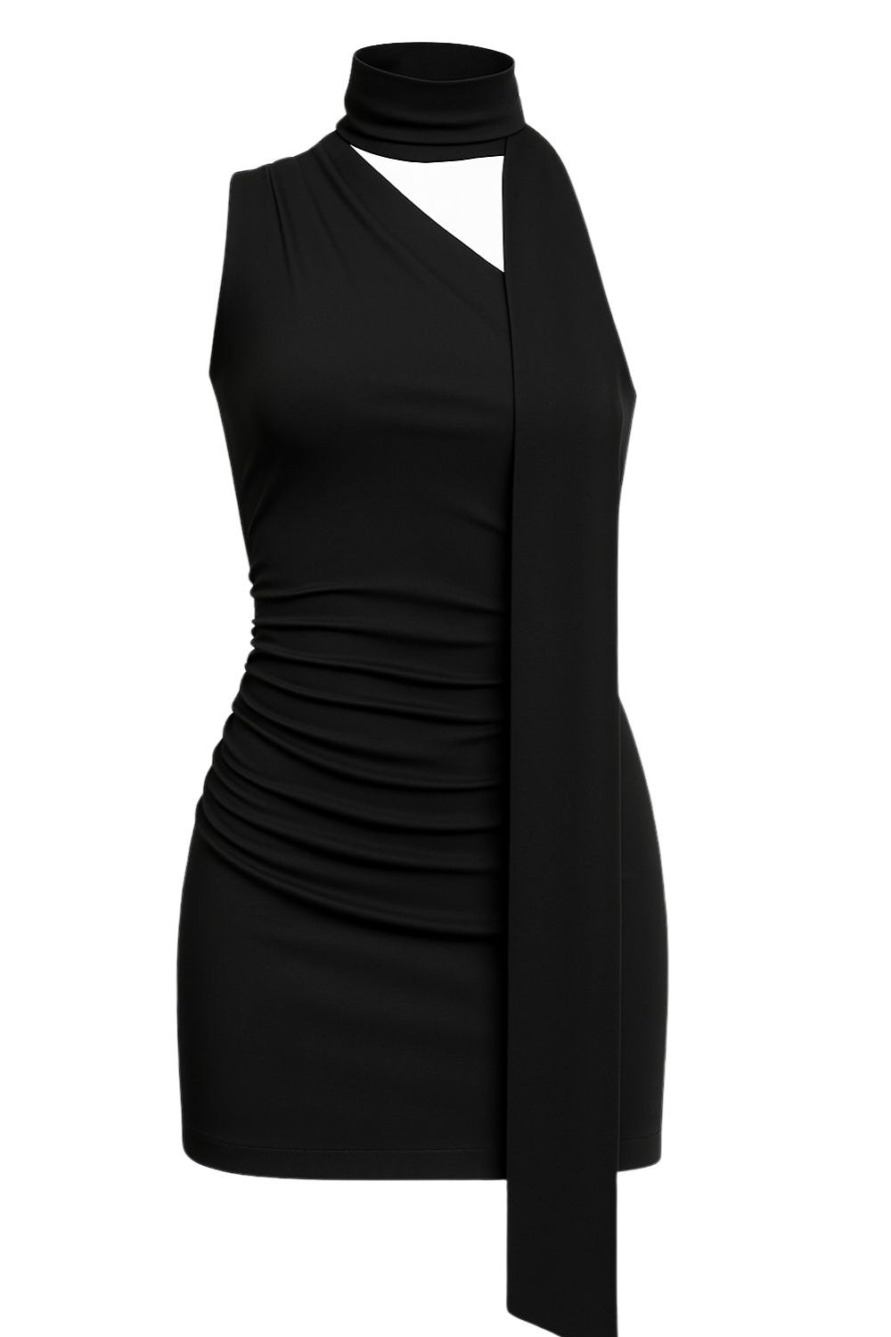 Vestido corto de fit ajustado, asimétrico de un hombro, escote diagonal, plisados en hombro y costados. Detalle de cuello alto con nudo amarrable.