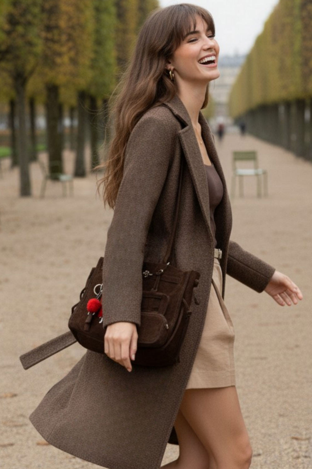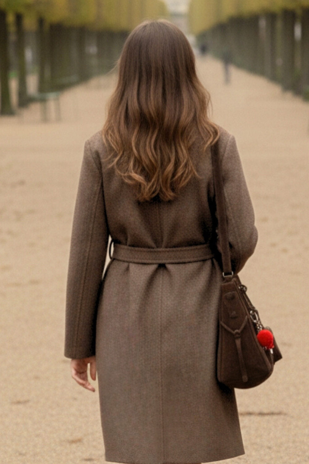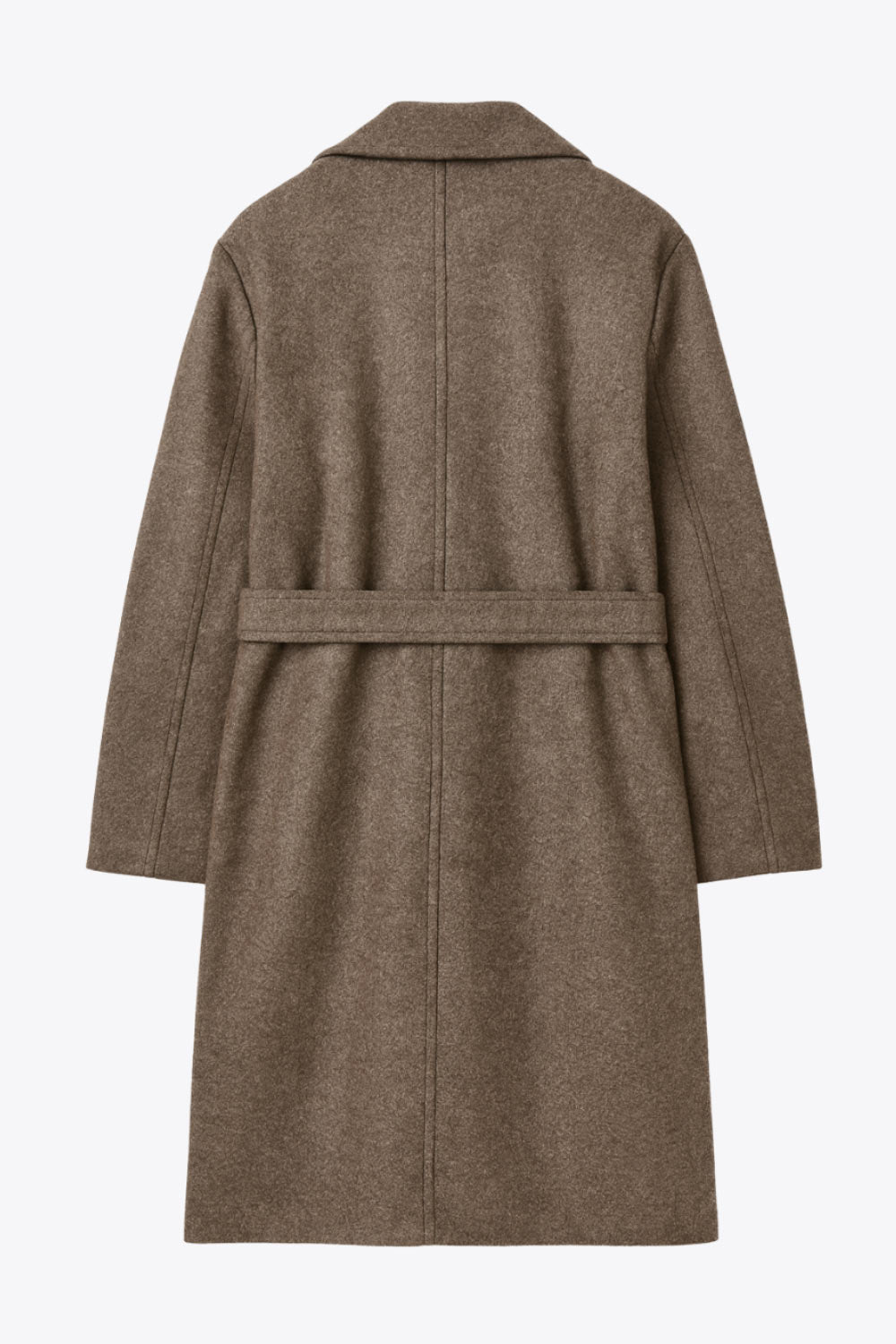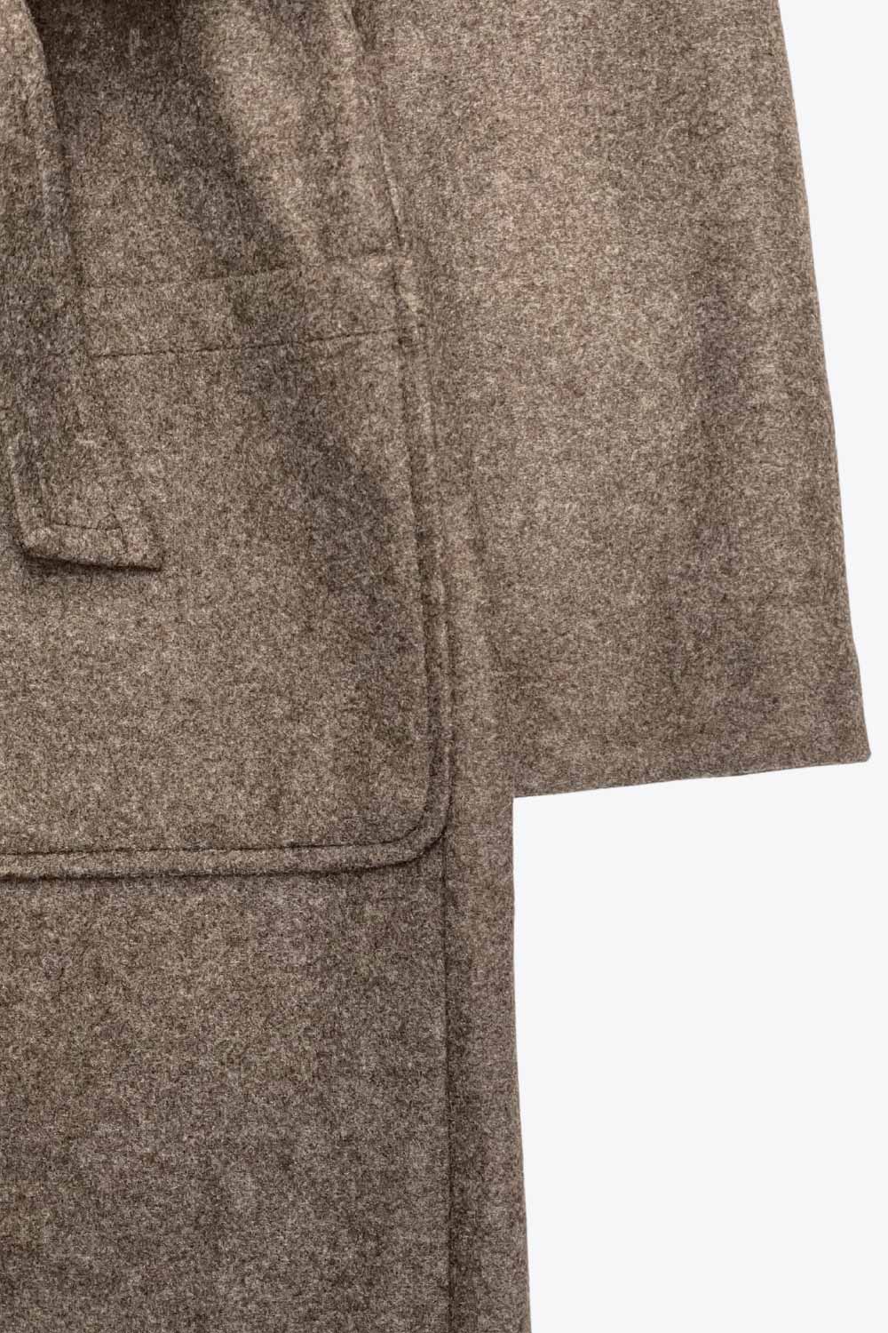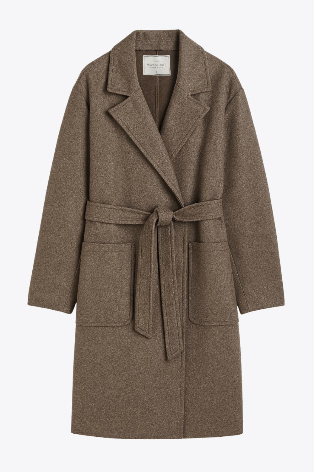Abrigo largo de manga larga, con solapa, bolsillos delanteros de parche, trabillas y cinturón amarrable del mismo tejido.