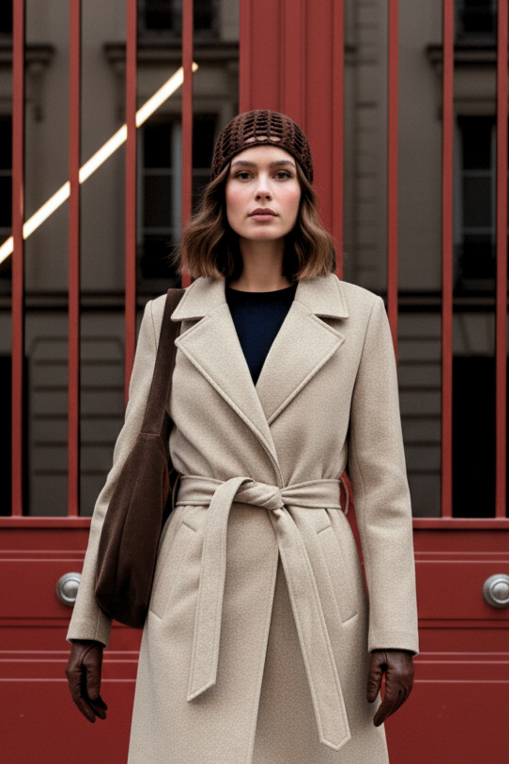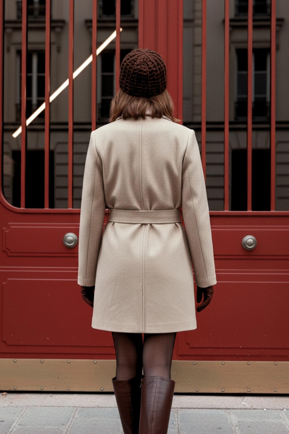 Abrigo de fit recto, con solapa, manga larga, bolsillos frontales con vivos, trabillas y cinturón amarrable del mismo tejido.