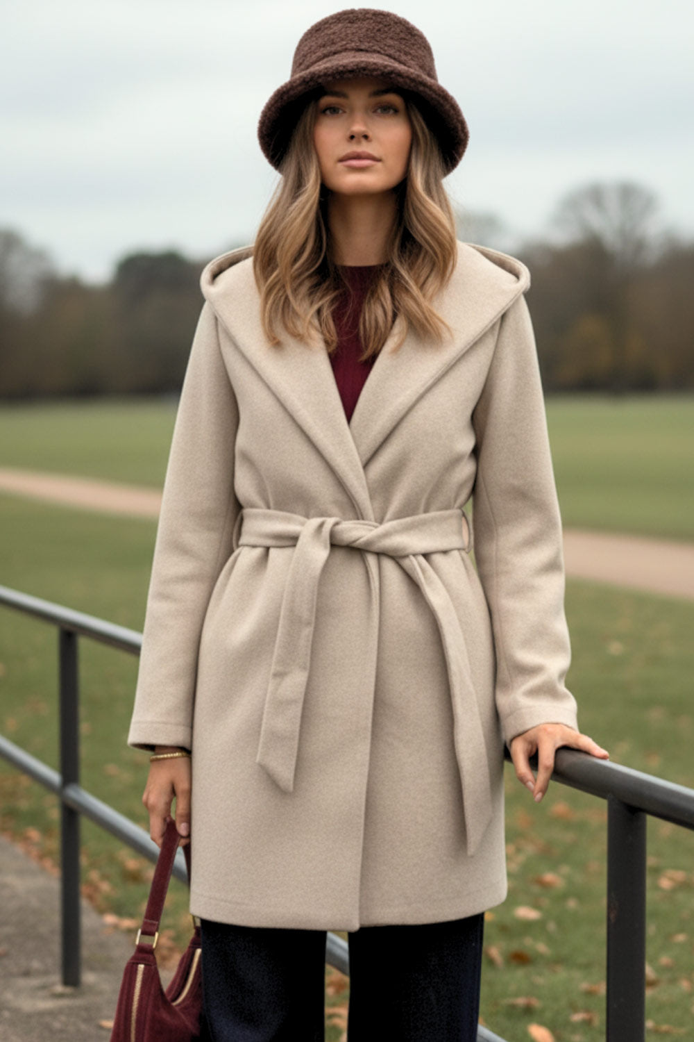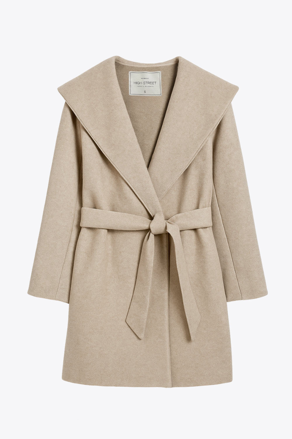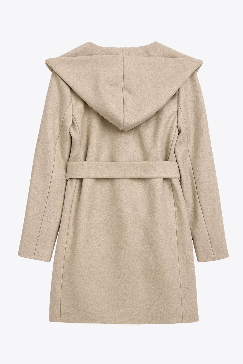 Abrigo de fit recto con capucha, manga larga y bolsillos delanteros. Detalle de trabillas y cinturón amarrable del mismo tejido.