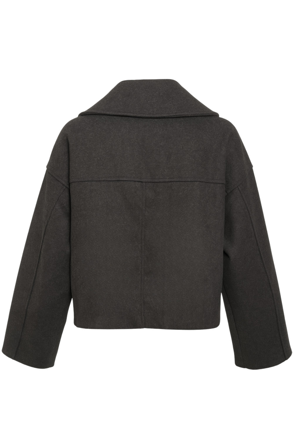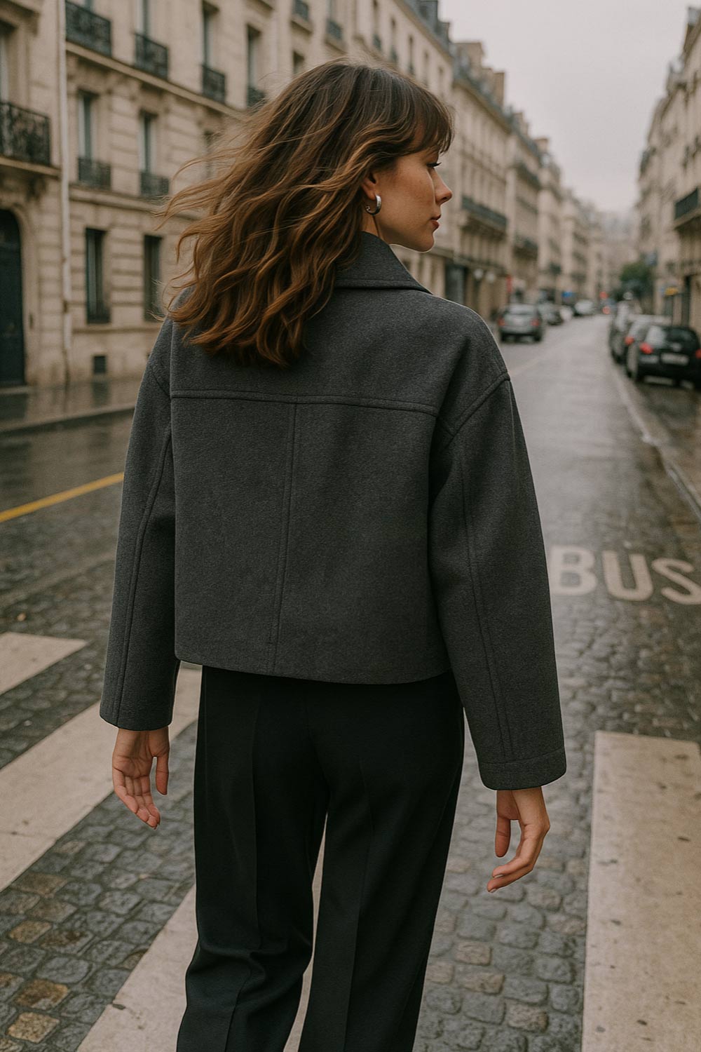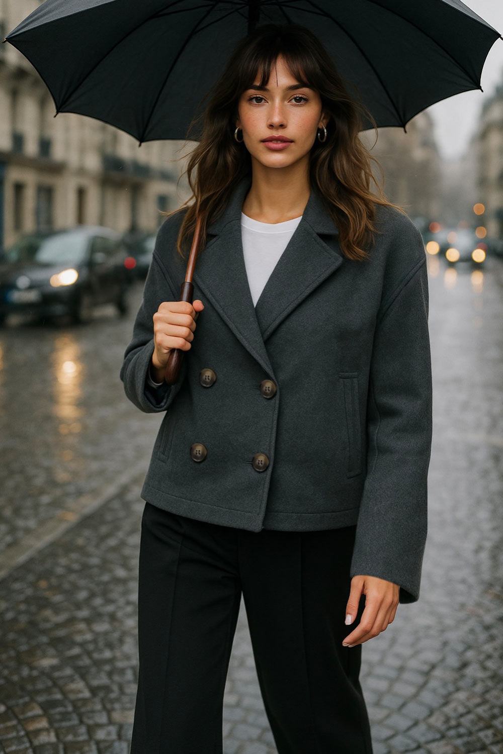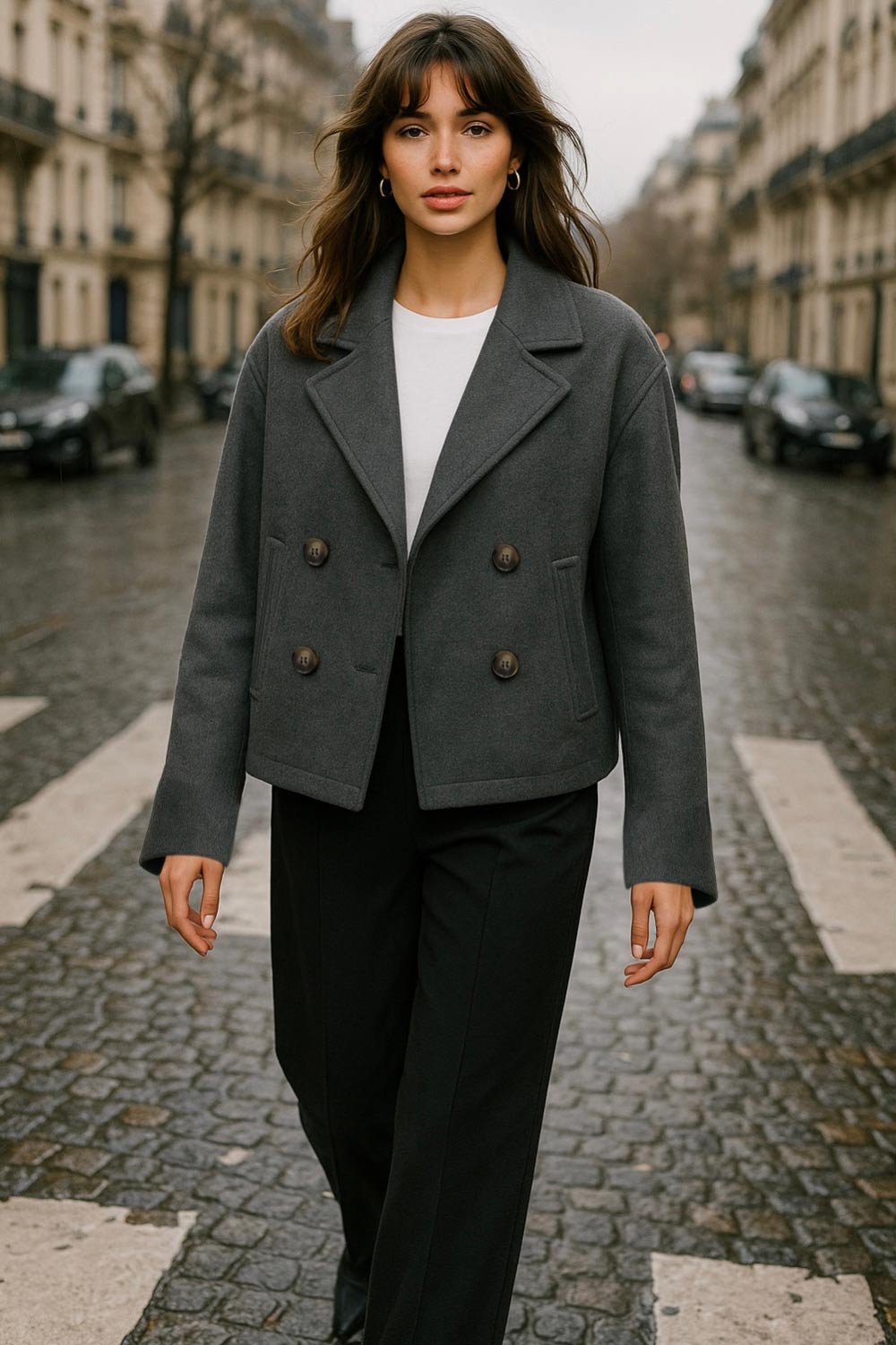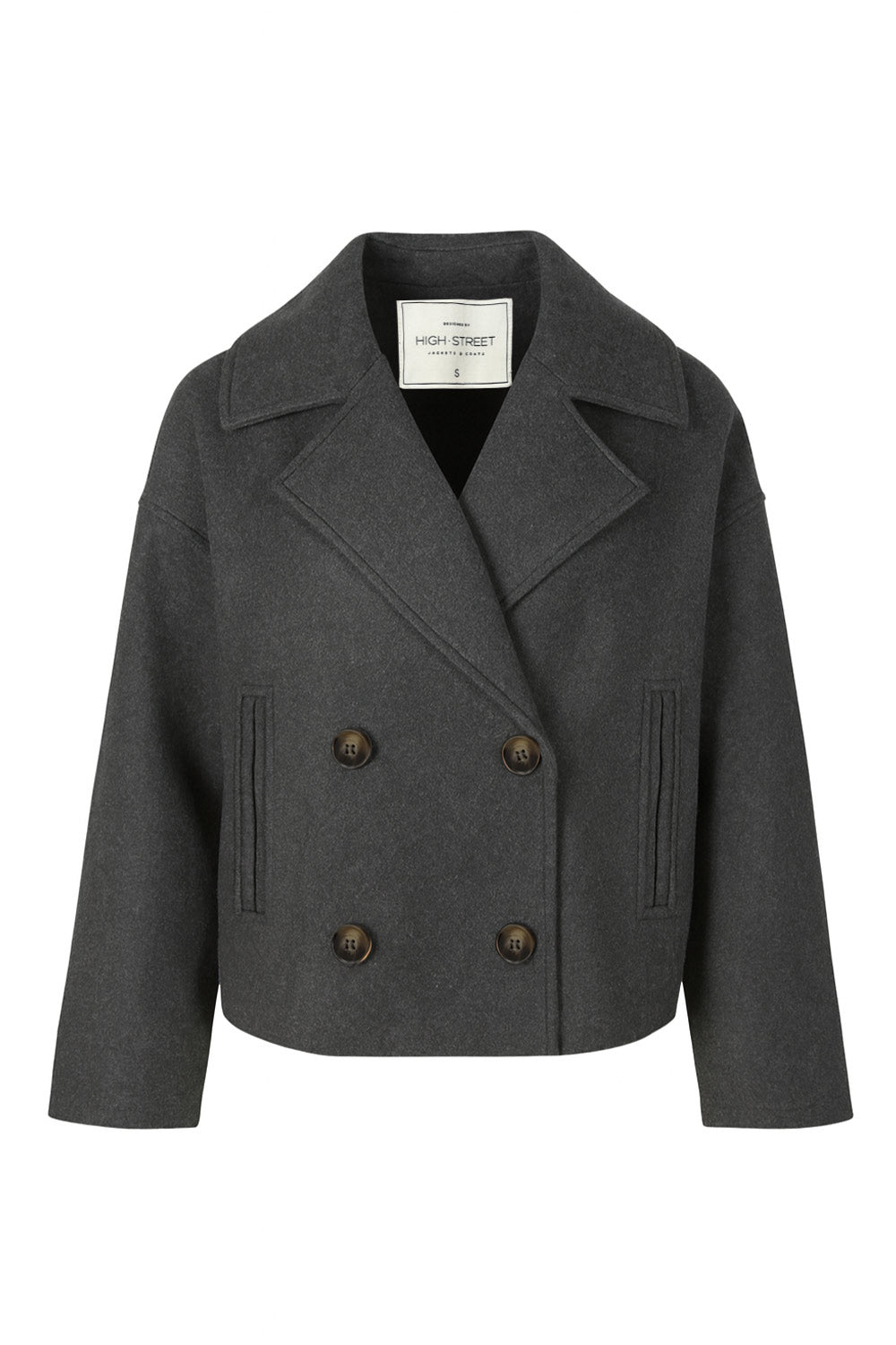 Abrigo corto de fit recto, manga larga, cuello con solapa, bolsillos delanteros con vivos y cierre frontal con doble cruce de botones en contraste.