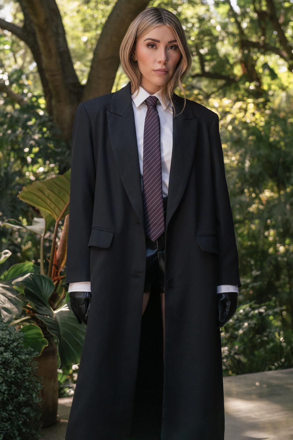 Abrigo largo de fit recto, manga larga, con solapa y hombreras, bolsillos delanteros con cartera y cierre frontal con cruce de botones. Detalle de abertura posterior en bajo.